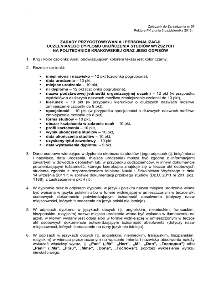 ` Załącznik do Zarządzenia nr 57 Rektora PK z dnia 3 października 2013 r. ZASADY PRZYGOTOWYWANIA I PERSONALIZACJI UCZELNIANEGO DYPLOMU UKOŃCZENIA STUDIÓW WYŻSZYCH NA POLITECHNICE KRAKOWSKIEJ ORAZ JEGO ODPISÓW 1. Krój i kolor czcionki: Arial; obowiązującym kolorem tekstu jest kolor czarny. 2. Rozmiar czcionki: imię/imiona i nazwisko – 12 pkt (czcionka pogrubiona), data urodzenia – 10 pkt, miejsce urodzenia – 10 pkt, nr dyplomu – 12 pkt (czcionka pogrubiona), nazwa podstawowej jednostki organizacyjnej uczelni – 12 pkt (w przypadku wydziałów o dłuższych nazwach możliwe zmniejszenie czcionki do 10 pkt), kierunek – 10 pkt (w przypadku kierunków o dłuższych nazwach możliwe zmniejszenie czcionki do 9 pkt), specjalność – 10 pkt (w przypadku specjalności o dłuższych nazwach możliwe zmniejszenie czcionki do 8 pkt), forma studiów – 10 pkt, obszar kształcenia w zakresie nauk – 10 pkt, profil kształcenia – 10 pkt, wynik ukończenia studiów – 10 pkt, data ukończenia studiów – 10 pkt, uzyskany tytuł zawodowy – 10 pkt, data wystawienia dyplomu – 9 pkt. 3. Dane osobowe widniejące w dyplomie ukończenia studiów i jego odpisach (tj. imię/imiona i nazwisko, data urodzenia, miejsce urodzenia) muszą być zgodne z informacjami zawartymi w dowodzie osobistym lub, w przypadku cudzoziemców, w innym dokumencie potwierdzającym tożsamość, którego kserokopia znajduje się w teczce akt osobowych studenta zgodnie z rozporządzeniem Ministra Nauki i Szkolnictwa Wyższego z dnia 14 września 2011 r. w sprawie dokumentacji przebiegu studiów (Dz.U. 2011 nr 201, poz. 1188), z zastrzeżeniem pkt 4 i 5. 4. W dyplomie oraz w odpisach dyplomu w języku polskim nazwa miejsca urodzenia winna być wpisana w języku polskim albo w formie widniejącej w umieszczonym w teczce akt osobowych dokumencie potwierdzającym tożsamość absolwenta (dotyczy nazw miejscowości, których tłumaczenie na język polski nie istnieje). 5. W odpisach dyplomu w językach obcych (tj. angielskim, niemieckim, francuskim, hiszpańskim, rosyjskim) nazwa miejsca urodzenia winna być wpisana w tłumaczeniu na język, w którym wydany jest odpis albo w formie widniejącej w umieszczonym w teczce akt osobowych dokumencie potwierdzającym tożsamość absolwenta (dotyczy nazw miejscowości, których tłumaczenie na dany język nie istnieje). 6. W odpisach w językach obcych (tj. angielskim, niemieckim, francuskim, hiszpańskim, rosyjskim) w wierszu przeznaczonym na wpisanie imienia i nazwiska absolwenta należy wskazać właściwy wyraz, tj. „Pan” („Mr”, „Herr”, „M”, „Don”, „Господин”) albo „Pani” („Ms”, „Frau”, „Mme”, „Doña”, „Госпожа”), poprzez wykreślenie wyrazu niewłaściwego. ` 7. W przypadku kierunków studiów, na których nie ma powołanej specjalności, w widniejącym w dyplomie wierszu „w specjalności” należy wprowadzić poziomą kreskę. 8. W przypadku kierunków studiów prowadzonych bez określania obszarów kształcenia oraz profilu kształcenia w widniejących w dyplomie wierszach, odpowiednio: „w obszarze kształcenia w zakresie nauk” i „o profilu kształcenia” należy wprowadzić poziomą kreskę. 9. Nazwa uzyskanego przez absolwenta tytułu zawodowego jest wpisywana w dyplomie oraz jego odpisach w języku polskim. W odpisach obcojęzycznych dyplomu nie dokonuje się tłumaczenia tytułu zawodowego na język obcy. 10. Data wystawienia odpisów dyplomu jest zgodna z datą wystawienia oryginału dyplomu. 11. Przy wpisywaniu dat w dyplomie i jego odpisach w języku polskim, angielskim, niemieckim, francuskim, hiszpańskim, rosyjskim należy używać pełnej nazwy miesiąca. W dokumencie w języku polskim, po liczebniku porządkowym oznaczającym konkretny dzień następuje nazwa danego miesiąca wyrażona w formie dopełniacza, a następnie liczba oznaczająca rok z użyciem skrótu „r.”, np.: „12 września 1989 r.” W językach obcych obowiązuje następujący format daty: „12th September 1989“, „12. September 1989“, „le 12 septembre 1989", „12 de septiembre de 1989”, „12 сентября 1989 г.” 12. Oryginał dyplomu oraz odpisy dyplomu pieczętowane są na wydziale pieczęcią imienną Dziekana Wydziału i Rektora PK zawierającą jedynie tytuł/stopień naukowy oraz imię i nazwisko. 13. Podpisy Dziekana Wydziału i Rektora PK powinny być zgodne z wzorami podpisów umieszczanych w dyplomach ukończenia studiów, zgłoszonymi w danej kadencji do Ministerstwa Nauki i Szkolnictwa Wyższego. 14. Dyplom ukończenia studiów oraz jego odpisy pieczętowane są pieczęciami urzędowymi uczelni: strona 2 (lewa wewnętrzna) dyplomu i jego odpisów w miejscu przeznaczonym na pieczęć urzędową pieczętowana jest pieczęcią do tłoczenia w papierze w Dziale Spraw Studenckich PK; strona 3 (prawa) dyplomu i jego odpisów w miejscu przeznaczonym na pieczęć urzędową pieczętowana jest pieczęcią do tuszu w kolorze czerwonym o średnicy 36 mm stosowaną na wydziale. 15. Fotografie do dyplomu i odpisów dyplomu o wymiarach 45 x 65 mm powinny być wyraźne i jednakowe. Mają odzwierciedlać aktualny wizerunek osoby, przedstawiać tę osobę bez nakrycia głowy i okularów z ciemnymi szkłami. Wyjątkiem jest osoba z wrodzonymi lub nabytymi wadami narządu wzroku, która może załączyć fotografie w okularach z ciemnymi szkłami, a osoba nosząca nakrycie głowy zgodnie z zasadami swojego wyznania – fotografie przedstawiające osobę z nakryciem głowy. Fotografie powinny mieć zachowane równomierne oświetlenie twarzy. Twarz na zdjęciu powinna mierzyć ok. 3,5 cm od czubka głowy do podbródka. Sylwetka na zdjęciu powinna być skadrowana jako popiersie w proporcji około 2/3 (głowa) do 1/3 (tors). Tło fotografii powinno być jasne i jednolite. Fotografie umieszczone w dyplomie powinny przedstawiać absolwenta w stroju formalnym.