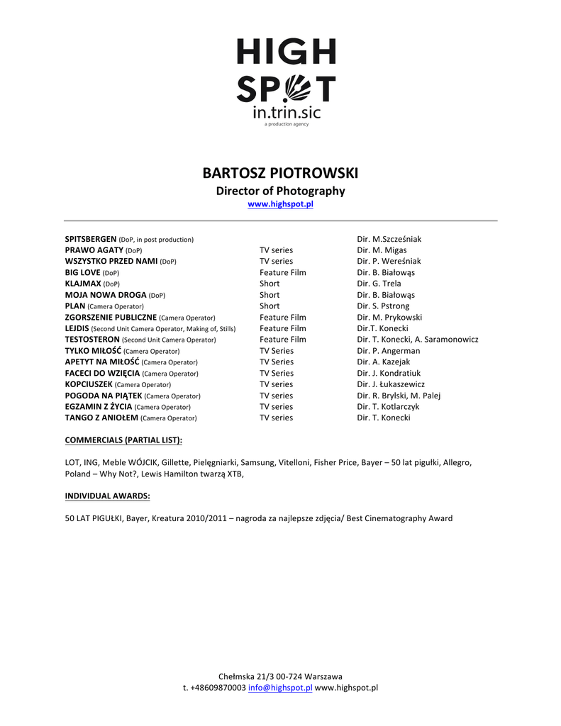BARTOSZ PIOTROWSKI Director of Photography www.highspot.pl TV series TV series Feature Film Short Short Short Feature Film Feature Film Feature Film TV Series TV Series TV Series TV series TV series TV series TV series SPITSBERGEN (DoP, in post production) Dir. M.Szcześniak PRAWO AGATY (DoP) Dir. M. Migas WSZYSTKO PRZED NAMI (DoP) Dir. P. Wereśniak BIG LOVE (DoP) Dir. B. Białowąs KLAJMAX (DoP) Dir. G. Trela MOJA NOWA DROGA (DoP) Dir. B. Białowąs PLAN (Camera Operator) Dir. S. Pstrong ZGORSZENIE PUBLICZNE (Camera Operator) Dir. M. Prykowski LEJDIS (Second Unit Camera Operator, Making of, Stills) Dir.T. Konecki TESTOSTERON (Second Unit Camera Operator) Dir. T. Konecki, A. Saramonowicz TYLKO MIŁOŚĆ (Camera Operator) Dir. P. Angerman APETYT NA MIŁOŚĆ (Camera Operator) Dir. A. Kazejak FACECI DO WZIĘCIA (Camera Operator) Dir. J. Kondratiuk KOPCIUSZEK (Camera Operator) Dir. J. Łukaszewicz POGODA NA PIĄTEK (Camera Operator) Dir. R. Brylski, M. Palej EGZAMIN Z ŻYCIA (Camera Operator) Dir. T. Kotlarczyk TANGO Z ANIOŁEM (Camera Operator) Dir. T. Konecki COMMERCIALS (PARTIAL LIST): LOT, ING, Meble WÓJCIK, Gillette, Pielęgniarki, Samsung, Vitelloni, Fisher Price, Bayer – 50 lat pigułki, Allegro, Poland – Why Not?, Lewis Hamilton twarzą XTB, INDIVIDUAL AWARDS: 50 LAT PIGUŁKI, Bayer, Kreatura 2010/2011 – nagroda za najlepsze zdjęcia/ Best Cinematography Award Chełmska 21/3 00-‐724 Warszawa t. +48609870003 [email protected] www.highspot.pl