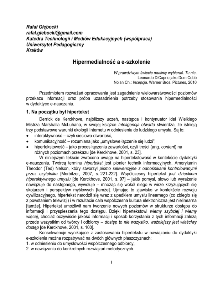 Rafał Głębocki [email protected] Katedra Technologii i Mediów Edukacyjnych (współpraca) Uniwersytet Pedagogiczny Kraków Hipermedialność a e-szkolenie W prawdziwym świecie musimy wybierać. Tu nie. Leonardo DiCaprio jako Dom Cobb Nolan Ch.: Incepcja. Warner Bros. Pictures, 2010 Przedmiotem rozważań opracowania jest zagadnienie wielowarstwowości poziomów przekazu informacji oraz próba uzasadnienia potrzeby stosowania hipermedialności w dydaktyce e-nauczania. 1. Na początku był hipertekst Derrick de Kerckhove, najbliższy uczeń, następca i kontynuator idei Wielkiego Mistrza Marshalla McLuhana, w swojej książce Inteligencja otwarta stwierdza, że istnieją trzy podstawowe warunki ekologii Internetu w odniesieniu do ludzkiego umysłu. Są to: interaktywność – czyli sieciowa otwartość, komunikacyjność – rozumiana jako „umysłowe łączenie się ludzi”, hipertekstowość – jako proces łączenia zawartości, czyli treści (ang. content) na różnych poziomach przekazu [de Kerckhove, 2001, s. 23]. W niniejszym tekście zwrócono uwagę na hipertekstowość w kontekście dydaktyki e-nauczania. Twórcą terminu hipertekst jest pionier technik informacyjnych, Amerykanin Theodor (Ted) Nelson, który stworzył pismo sekwencyjne z odnośnikami kontrolowanymi przez czytelnika [Morbitzer, 2007, s. 221-222]. Współczesny hipertekst jest dzieckiem hiperaktywnego umysłu [de Kerckhove, 2001, s. 97] – jakiś pomysł, słowo lub wyrażenie nawiązuje do następnego, wywołuje – mnożąc się wokół niego w wirze krzyżujących się skojarzeń i perspektyw myślowych [tamże]. Ujmując to zjawisko w kontekście rozwoju cywilizacyjnego, hipertekst narodził się wraz z upadkiem umysłu linearnego (co zbiegło się z powstaniem telewizji) i w rezultacie cała współczesna kultura elektroniczna jest nielinearna [tamże]. Hipertekst umożliwił nam tworzenie nowych poziomów w strukturze dostępu do informacji i przyspieszania tego dostępu. Dzięki hipertekstowi wiemy szybciej i wiemy więcej, chociaż oczywiście jakość informacji i sposób korzystania z tych informacji zależą przede wszystkim od twórcy i odbiorcy – dostęp to nie wszystko, ważniejszy jest właściwy dostęp [de Kerckhove, 2001, s. 100]. Konsekwencje wynikające z zastosowania hipertekstu w nawiązaniu do dydaktyki e-szkolenia można rozpatrywać na dwóch głównych płaszczyznach: 1. w odniesieniu do umysłowości współczesnego odbiorcy, 2. w nawiązaniu do konkretnych rozwiązań metodycznych. 1 Hipertekst jest dla naszych umysłów zjawiskiem naturalnym, ponieważ wspomaga proces pozyskiwania informacji i uczenia się. Opis roli hipertekstu dotyczący współgrania tej koncepcji z rodzajem umysłowości współczesnego odbiorcy, można przełożyć na język dydaktyki e-szkolenia za pomocą konkretnych narzędzi metodycznych, np.: tekstu elektronicznego zawierającego widoczne odsyłacze do innych tekstów lub serwisów zamieszczonych w Internecie (online), prezentacji powiązanych ze sobą poziomów informacji w obrębie jednego e-szkolenia, interaktywnej nawigacji pomiędzy połączonymi fragmentami tekstu, w którym wyróżnione słowa prowadzą do dalszych informacji [Morbitzer, 2007, s. 223]. Odpowiednio zaprojektowana hipertekstowość, a w rezultacie zwiększenie głębi przekazu informacji, ułatwia dostęp do wiedzy [Tomczyk, 2009]. Jednak w opinii autora opracowania to raczej dydaktyczne wykorzystanie hipermedialności może wyznaczyć nowy horyzont dla twórców i odbiorców e-szkoleń. 2. Hipermedialność a współczesna umysłowość Hipermedialność to rozwinięcie koncepcji hipertekstu. Profesor Janusz Morbitzer w książce, pt. Edukacja wspierana komputerowo a humanistyczne wartości pedagogiki, definiuje hipermedia jako […] połączone odsyłaczami informacje o charakterze multimedialnym, tj. obejmujące tekst, obraz statyczny i ruchomy oraz dźwięk [Morbitzer, 2007, s. 220]. Warto zatem skupić się na roli, jaką hipermedia mają do spełnienia w procesie e-nauczania w odniesieniu do charakterystyki zmian umysłowości współczesnego odbiorcy informacji. Dlatego przeanalizowano dwa opracowania książkowe stanowiące dobrze słyszalny głos w dyskusji na temat omawianych zmian. Książka Gary Smalla i Gigi Vorgan pt. Jak przetrwać technologiczną przemianę współczesnej umysłowości [Small, Vorgan, 2011] stanowi swego rodzaju studium dotyczące zmian, jakie zaszły w naszych umysłach wskutek mega-szybkiego rozwoju technik informacyjnych. Autorzy stwierdzają, że […] technologia cyfrowa zmienia nie tylko sposób naszego myślenia, ale wpływa również na nasze odczuwanie, zachowanie i funkcje mózgów. Choć jesteśmy nieświadomi zmian zachodzących w obwodach neuronalnych, czyli w oprzyrządowaniu mózgu, utrwalają się one w wyniku powtórzeń. Proces ewolucji mózgu ujawnił się gwałtownie przez jedno pokolenie. […] Od czasu odkrycia sposobu używania narzędzi przez naszych przodków ludzki mózg nie zmagał się z tak poważnym i dramatycznym wyzwaniem [Small, Vorgan, 2011, s. 14]. Również Don Tapscott w książce pt. Cyfrowa dorosłość dokonał próby zdefiniowania umysłowości pokolenia sieci. Autor stwierdza, że […] umysł pokolenia sieci wydaje się nieprawdopodobnie elastyczny, łatwo się przystosowuje i stworzony jest do multimediów [Tapscott, s. 177]. Odpowiedzią zaś na potrzeby edukacyjne współczesnego odbiorcy mogą być rozwiązania, jakie podpowiada kanadyjski badacz sieci [tamże, s. 230-245]: skoncentrowanie się na uczniu, a nie na nauczycielu, przejście od nauczania jednokierunkowego do interaktywnego, przejście od nauczania do odkrywania, przejście od nauki indywidualnej do wspólnej, 2 zmiana koncepcji z „jeden rozmiar dla wszystkich” na „indywidualne dopasowanie rozmiaru”. W związku z powyższym opisem, zastosowanie hipermedialności w e-szkoleniu ma swoje uzasadnienie, gdyż współczesny odbiorca [