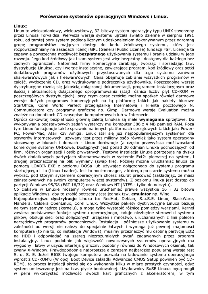 Porównanie systemów operacyjnych Windows i Linux. Linux: Linux to wielozadaniowy, wieloużytkowy, 32-bitowy system operacyjny typu UNIX stworzony przez Linusa Torvaldsa. Pierwsza wersja systemu ujrzała światło dzienne w sierpniu 1991 roku, od tamtej pory system podlega licznym udoskonaleniom dokonywanym przez ogromną grupę programistów mających dostęp do kodu źródłowego systemu, który jest rozpowszechniany na zasadach licencji GPL (General Public License) fundacji FSF. Licencja ta zapewnia powszechną możliwość bezpłatnego użytkowania systemu i brania udziału w jego rozwoju. Jego kod źródłowy jak i sam system jest więc bezpłatny i dostępny dla każdego bez żadnych ograniczeń. Natomiast firmy komercyjne zarabiają, tworząc i sprzedając tzw. dystrybucje Linuksa, czyli wersje instalacyjne, zawierające program, kod źródłowy oraz setki dodatkowych programów użytkowych przystosowanych dla tego systemu zarówno shareware'owych jak i freeware'owych. Cena obejmuje zebranie wszystkich programów w całość, wytłoczenie CD, oraz wydrukowanie podręcznika użytkownika. Poszczególne wersje dystrybucyjne różnią się jakością dołączonej dokumentacji, programem instalacyjnym oraz ilością i aktualnością dołączonego oprogramowania (stąd różnica liczby płyt CD-ROM w poszczególnych dystrybucjach), przy czym coraz częściej można spotkać również darmowe wersje dużych programów komercyjnych na tą platformę takich jak pakiety biurowe StarOffice, Corel World Perfect przeglądarkę Internetową i klienta pocztowego N. Communicatora czy programy graficzne np. Gimp. Darmowe wersje Evaluation można znaleźć na dodatkach CD czasopism komputerowych lub w Internecie. Oprócz całkowitej bezpłatności główną zaletą Linuksa są małe wymagania sprzętowe. Do wykonywania podstawowych zadań wystarczy mu komputer 386 z 4 MB pamięci RAM. Poza tym Linux funkcjonuje także sprawnie na innych platformach sprzętowych takich jak: PowerPC, Power-Mac, Atari czy Amiga. Linux stał się już najpopularniejszym systemem dla serwerów internetowych, używany jest przez miliony osób również jako system operacyjny stosowany w biurach i domach - Linux dorównuje (a często przewyższa możliwościami komercyjne systemy UNIXowe. Dostępnych jest ponad 20 odmian Linuxa pochodzących od firm, różnych organizacji i osób prywatnych. Testowa instalacja Linuxa potrzebuje na dysku dwóch dodatkowych partycjach sformatowanych w systemie Ext2: pierwszej na system, i drugiej przeznaczonej na plik wymiany (swap file). Później można uruchamiać linuxa za pomocą LOADIN.EXE z poziomu DOSa lub używając dołączonego do systemu programu startującego LiLo (Linux Loader). Jest to boot-manager, z którego po starcie systemu można wybrać, pod którym systemem operacyjnym chcesz akurat pracować (zakładając, że masz zainstalowanych na swoim komputerze więcej systemów). Z poziomu linuxa jest dostęp do partycji Windows 95/98 (FAT 16/32) oraz Windows NT (NTFS - tylko do odczytu). Co ciekawe w Linuxie możemy również uruchamiać prawie wszystkie 16 i 32 bitowe aplikacje Windows, aby to zrobić potrzebny jest jednak tzw. emulator np. Wine. Najpopularniejsze dystrybucje Linuxa to: RedHat, Debian, S.u.S.E. Linux, SlackWare, Mandera, Caldera OpenLinux, Corel Linux. Wszystkie pakiety dystrybucyjne Linuxa bazują na tym samym jądrze (kernelu), a mogą tylko wystąpić różnice pomiędzy wersjami. Kernel zawiera podstawowe funkcje systemu operacyjnego, ładuje niezbędne sterowniki systemu plików, obsługi sieci oraz dołączonych urządzeń i mnóstwo, uruchamianych z linii poleceń narzędziowych programów pomocniczych. Instalacja i późniejsze użytkowanie systemu w zależności od wersji nie należy do specjalnie łatwych i wymaga już pewnej znajomości komputera (to nie to, co instalacja Windows), musimy przeznaczyć mu osobną partycję Ext2 na HDD i odpowiadać na szereg niezrozumiałych pytań zadawanych przez program instalacyjny. Linux podobnie jak większość nowoczesnych systemów operacyjnych ma wygodny i łatwy w użyciu interfejs graficzny, podobny również do Windosowych okienek, tak zwany X-Window. Prawdopodobnie najprostszą a zarazem najbardziej popularną wersją jest S. u. S. E. Jeżeli BIOS twojego komputera pozwala na ładowanie systemu operacyjnego wprost z CD-ROM'u (W opcji Boot Device zakładki Adwanced CMOS Setup powinien być CDROM), to proces instalacji skróci się do wykonania kilku w miarę prostych czynności, gdyż system umieszczony jest na tzw. płycie bootowalnej. Użytkownicy SuSE Linuxa będą mogli w pełni wykorzystać możliwości swoich kart graficznych z akceleratorem, w tym najnowszych pracujących z magistralą AGP i obsługujących DVD. System obsługuje także karty video, a zestaw sterowników do najnowszych kontrolerów SCSI i napędów dysków wymiennych stawia go niemal na równi z innymi komercjalnymi systemami. Wspomniany XWindows to specyficzne środowisko graficzne Linuxa, które do złudzenia przypomina Windosowe okienka. Mamy tu do wyboru kilkanaście menadżerów okienek, które w zależności od urozmaiceń swojego interfejsu wymagają odpowiedniej ilości wolnej pamięci RAM. Dostępne są 2 interfejsy graficzne KDE i GNU. Najbardziej pamięciożernym jest KDE (minimum 32 a najlepiej 48 lub 64 MB RAM'u), ale za to jest to menadżer najłatwiejszy w konfiguracji i dostosowaniu go do indywidualnych upodobań użytkownika. Obsługa odbywa się w nim analogicznie jak w Windows 95, bezpośrednio spod grafiki przy wykorzystaniu wbudowanego mechanizmu "przeciągnij i upuść" i innych tego typu ułatwień znanych z Windosowych okienek, z tym że na tej platformie jeszcze nie wszystko działa tak jak należy a większość programów nadal pracuje lub jest uruchamiana w trybie tekstowym. Konfiguracja polega z reguły na edycji odpowiedniego pliku w edytorze tekstowym a wyszukanie odpowiednich danych w większośc