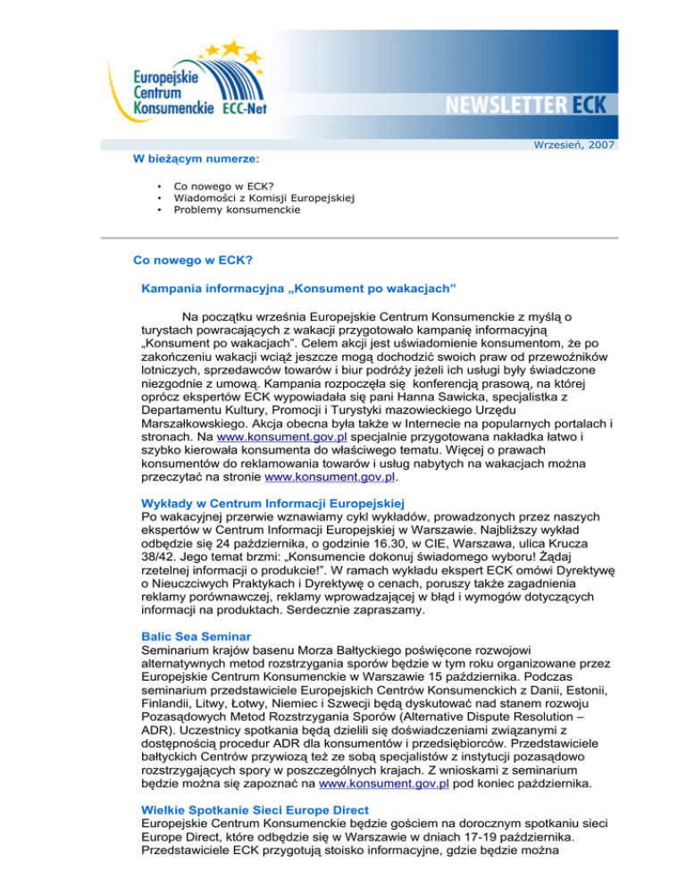 Wrzesień, 2007 W bieżącym numerze: • • • Co nowego w ECK? Wiadomości z Komisji Europejskiej Problemy konsumenckie Co nowego w ECK? Kampania informacyjna „Konsument po wakacjach” Na początku września Europejskie Centrum Konsumenckie z myślą o turystach powracających z wakacji przygotowało kampanię informacyjną „Konsument po wakacjach”. Celem akcji jest uświadomienie konsumentom, że po zakończeniu wakacji wciąż jeszcze mogą dochodzić swoich praw od przewoźników lotniczych, sprzedawców towarów i biur podróży jeżeli ich usługi były świadczone niezgodnie z umową. Kampania rozpoczęła się konferencją prasową, na której oprócz ekspertów ECK wypowiadała się pani Hanna Sawicka, specjalistka z Departamentu Kultury, Promocji i Turystyki mazowieckiego Urzędu Marszałkowskiego. Akcja obecna była także w Internecie na popularnych portalach i stronach. Na www.konsument.gov.pl specjalnie przygotowana nakładka łatwo i szybko kierowała konsumenta do właściwego tematu. Więcej o prawach konsumentów do reklamowania towarów i usług nabytych na wakacjach można przeczytać na stronie www.konsument.gov.pl. Wykłady w Centrum Informacji Europejskiej Po wakacyjnej przerwie wznawiamy cykl wykładów, prowadzonych przez naszych ekspertów w Centrum Informacji Europejskiej w Warszawie. Najbliższy wykład odbędzie się 24 października, o godzinie 16.30, w CIE, Warszawa, ulica Krucza 38/42. Jego temat brzmi: „Konsumencie dokonuj świadomego wyboru! Żądaj rzetelnej informacji o produkcie!”. W ramach wykładu ekspert ECK omówi Dyrektywę o Nieuczciwych Praktykach i Dyrektywę o cenach, poruszy także zagadnienia reklamy porównawczej, reklamy wprowadzającej w błąd i wymogów dotyczących informacji na produktach. Serdecznie zapraszamy. Balic Sea Seminar Seminarium krajów basenu Morza Bałtyckiego poświęcone rozwojowi alternatywnych metod rozstrzygania sporów będzie w tym roku organizowane przez Europejskie Centrum Konsumenckie w Warszawie 15 października. Podczas seminarium przedstawiciele Europejskich Centrów Konsumenckich z Danii, Estonii, Finlandii, Litwy, Łotwy, Niemiec i Szwecji będą dyskutować nad stanem rozwoju Pozasądowych Metod Rozstrzygania Sporów (Alternative Dispute Resolution – ADR). Uczestnicy spotkania będą dzielili się doświadczeniami związanymi z dostępnością procedur ADR dla konsumentów i przedsiębiorców. Przedstawiciele bałtyckich Centrów przywiozą też ze sobą specjalistów z instytucji pozasądowo rozstrzygających spory w poszczególnych krajach. Z wnioskami z seminarium będzie można się zapoznać na www.konsument.gov.pl pod koniec października. Wielkie Spotkanie Sieci Europe Direct Europejskie Centrum Konsumenckie będzie gościem na dorocznym spotkaniu sieci Europe Direct, które odbędzie się w Warszawie w dniach 17-19 października. Przedstawiciele ECK przygotują stoisko informacyjne, gdzie będzie można zaopatrzyć się w materiały informacyjne o prawach konsumentów w Europie także będą do dyspozycji gości, udzielając odpowiedzi na pytania o działalność sieci ECK. Wiadomości z Komisji Europejskiej Wielojęzyczny biuletyn portalu Health-EU Portal Health-EU rozpoczął publikowanie wielojęzycznego biuletynu w formie elektronicznej, którego celem jest informowanie europejskich obywateli o tym, co dzieje się w dziedzinie zdrowia w Europie i na świecie. „W 2006 roku wprowadziliśmy portal Publicznej Służby Zdrowia by dostarczyć istotnych i przyjaznych dla użytkownika informacji o zdrowiu obywateli. Biuletyn Health-EU pozwoli czytelnikom otrzymywać najświeższe komunikaty dotyczące zdrowia we wszystkich europejskich językach” zauważa w inauguracyjnym wydaniu biuletynu Komisarz ds. Zdrowia Komisji Europejskiej, Markos Kyprianou. Biuletyn, elektroniczna publikacja wydawana dwa razy w miesiącu w 20 europejskich językach, dąży do przekazywania najświeższych informacji na temat wydarzeń dotyczących zdrowia obywateli i publikacji poświęconych temu tematowi, a także konferencji i kampanii. Poza tym w każdym wydaniu będzie się pojawiał artykuł związany z europejskim lub międzynarodowym dniem poświęconym określonemu problemowi (na przykład 14-tego września był to Europejski Dzień Prostaty). Wszystkie osoby i organizacje chcące otrzymać biuletyn mogą go zaprenumerować wchodząc na stronę: http://health.europa.eu/newsletter/1/newsletter_en.htm Problemy konsumenckie Zagubiony bagaż Konsumentka podróżowała węgierskimi liniami lotniczymi z Warszawy do Paryża Beauvais. Po wylądowaniu chciała odebrać swój bagaż, ale niestety nie pojawił się on na taśmie bagażowej. W związku z tym na lotnisku, w biurze zagubionego bagażu, wypełniła formularz PIR. Następnie złożyła skargę do przewoźnika, zgodnie z art. 31 Konwencji Montrealskiej, która została przyjęta do rozpatrzenia. Po długim oczekiwaniu na odpowiedź w sprawie reklamacji konsumentka zdecydowała się poprosić o pomoc Europejskie Centrum Konsumenckie w Polsce. Sprawą zajęto się natychmiast, zgromadzono niezbędne dokumenty m. in. kopię pisemnej skargi i PIR. Pierwsze działania polegały na nawiązaniu kontaktu z ECK na Węgrzech i przekazaniu im wszelkich zebranych informacji oraz dokumentów. Następnie węgierscy prawnicy z ECK zwrócili się do przewoźnika o stanowisko w powyższej sprawie. Z wyjaśnień linii lotniczej wynikało, że bagaż został omyłkowo odebrany przez innego pasażera. Niestety nie udało się go odnaleźć. Interwencja prawników ECK powołujących się na Konwencję Montrealską – szczególnie art. 17 ust. 2 dotyczący odpowiedzialności przewoźnika za zagubiony bagaż – odniosła skutek. Linie lotnicze wypłaciły konsumentce rekompensatę w kwocie 418 euro. Oczekiwała ona całej sumy: 1120 EUR, niemniej jednak wysokość otrzymanego odszkodowania, oszacowana na podstawie wagi bagażu, również była satysfakcjonująca. Aby