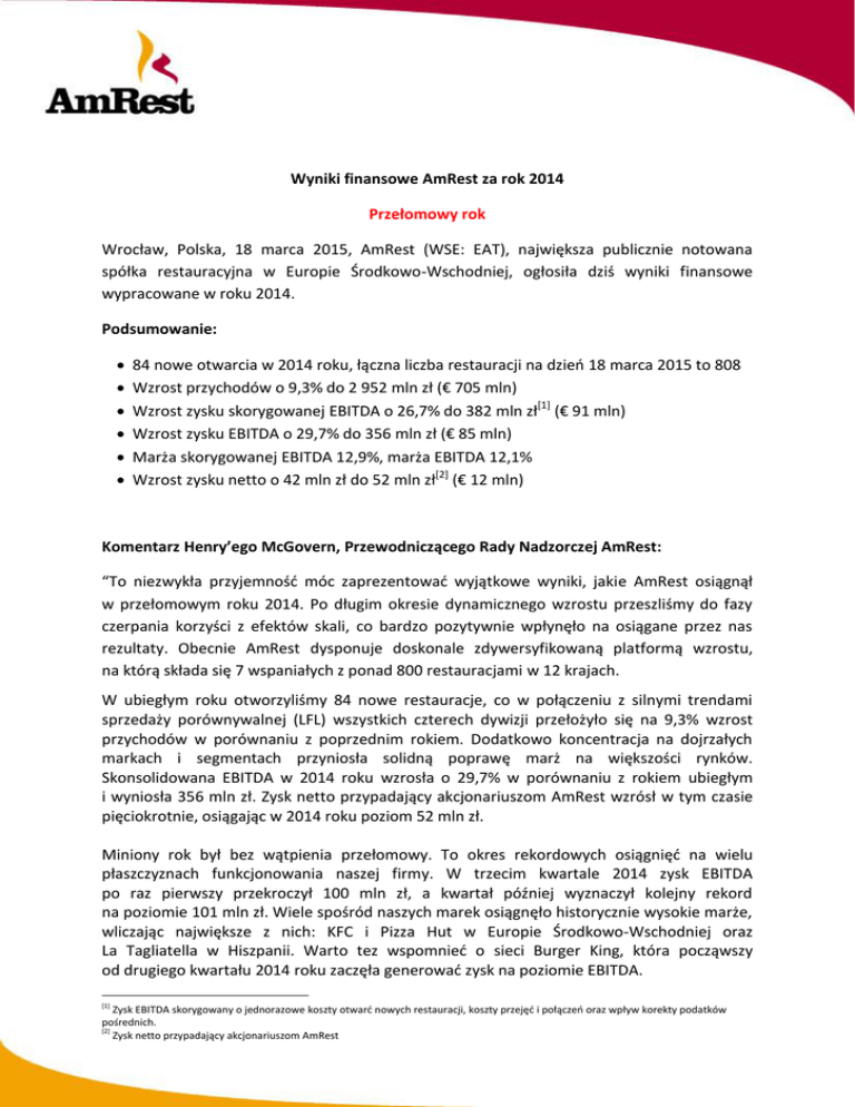 Wyniki finansowe AmRest za rok 2014 Przełomowy rok Wrocław, Polska, 18 marca 2015, AmRest (WSE: EAT), największa publicznie notowana spółka restauracyjna w Europie Środkowo-Wschodniej, ogłosiła dziś wyniki finansowe wypracowane w roku 2014. Podsumowanie: 84 nowe otwarcia w 2014 roku, łączna liczba restauracji na dzień 18 marca 2015 to 808 Wzrost przychodów o 9,3% do 2 952 mln zł (€ 705 mln) Wzrost zysku skorygowanej EBITDA o 26,7% do 382 mln zł[1] (€ 91 mln) Wzrost zysku EBITDA o 29,7% do 356 mln zł (€ 85 mln) Marża skorygowanej EBITDA 12,9%, marża EBITDA 12,1% Wzrost zysku netto o 42 mln zł do 52 mln zł[2] (€ 12 mln) Komentarz Henry’ego McGovern, Przewodniczącego Rady Nadzorczej AmRest: “To niezwykła przyjemność móc zaprezentować wyjątkowe wyniki, jakie AmRest osiągnął w przełomowym roku 2014. Po długim okresie dynamicznego wzrostu przeszliśmy do fazy czerpania korzyści z efektów skali, co bardzo pozytywnie wpłynęło na osiągane przez nas rezultaty. Obecnie AmRest dysponuje doskonale zdywersyfikowaną platformą wzrostu, na którą składa się 7 wspaniałych z ponad 800 restauracjami w 12 krajach. W ubiegłym roku otworzyliśmy 84 nowe restauracje, co w połączeniu z silnymi trendami sprzedaży porównywalnej (LFL) wszystkich czterech dywizji przełożyło się na 9,3% wzrost przychodów w porównaniu z poprzednim rokiem. Dodatkowo koncentracja na dojrzałych markach i segmentach przyniosła solidną poprawę marż na większości rynków. Skonsolidowana EBITDA w 2014 roku wzrosła o 29,7% w porównaniu z rokiem ubiegłym i wyniosła 356 mln zł. Zysk netto przypadający akcjonariuszom AmRest wzrósł w tym czasie pięciokrotnie, osiągając w 2014 roku poziom 52 mln zł. Miniony rok był bez wątpienia przełomowy. To okres rekordowych osiągnięć na wielu płaszczyznach funkcjonowania naszej firmy. W trzecim kwartale 2014 zysk EBITDA po raz pierwszy przekroczył 100 mln zł, a kwartał później wyznaczył kolejny rekord na poziomie 101 mln zł. Wiele spośród naszych marek osiągnęło historycznie wysokie marże, wliczając największe z nich: KFC i Pizza Hut w Europie Środkowo-Wschodniej oraz La Tagliatella w Hiszpanii. Warto tez wspomnieć o sieci Burger King, która począwszy od drugiego kwartału 2014 roku zaczęła generować zysk na poziomie EBITDA. [1] Zysk EBITDA skorygowany o jednorazowe koszty otwarć nowych restauracji, koszty przejęć i połączeń oraz wpływ korekty podatków pośrednich. [2] Zysk netto przypadający akcjonariuszom AmRest W zeszłym roku mogliśmy zaobserwować niezwykłą siłę i skuteczność struktur stworzonych w AmRest w ostatnich latach. W Rosji zdołaliśmy oprzeć się niekorzystnym uwarunkowaniom polityczno-ekonomicznym i utrzymać silne marże biznesu bazowego. W Hiszpanii, na bazie oznak wzrostu gospodarczego i solidnych trendów LFL, poprawiliśmy marżę EBITDA do ponad 21%. Jednocześnie nowo otwarte restauracje La Tagliatella osiągnęły na tym rynku ponadprzeciętne wyniki. W Chinach tempa nabrał rozwój sieci Blue Frog i Kabb. Otwarcie siedmiu nowych restauracji, wejście do trzech kolejnych miast, a także dwucyfrowe trendy LFL przyczyniły się do 43% wzrostu sprzedaży oraz znacznej poprawy marż tego segmentu. Sukces dotychczasowych otwarć oraz niezwykle duża popularność oferty Blue Frog wśród konsumentów utwierdzają nas w przekonaniu, że potencjał rozwoju tej sieci w Chinach jest ogromny. W dywizji Nowe Rynki udało nam się znacząco zredukować straty sieci La Tagliatella International dzięki konsekwentnej realizacji plan oszczędnościowego oraz zamknięciu niedochodowych lokali. Rozwój tej marki ograniczyliśmy do rynku francuskiego, który w minionym roku osiągnął próg rentowności i daje nam uzasadnione nadzieje, iż w przyszłości będzie on w stanie powtórzyć sukces Hiszpanii. W minionym roku świętowaliśmy osiągnięcie dwóch kamieni milowych w rozwoju sieci AmRest: otwarcie 300. restauracji KFC w Europie Środkowo-Wschodniej (CEE) oraz 800. restauracji w portfelu całej grupy, co odzwierciedla dynamicznie rosnącą skalę naszego biznesu. Będąc dumnym z postępu, jaki osiągnęliśmy w 2014 roku, głęboko wierzę, że najlepsze jest nadal przed nami. Nasz unikalny model biznesowy, zbudowany na zespole wspaniałych ludzi oraz zdywersyfikowanym portfelu marek, a także globalna skala działalności dają ogromne możliwości dalszego wzrostu i kreowania wartości dla akcjonariuszy.” Oczekiwania AmRest zamierza kontynuować dotychczasowe kierunki rozwoju, koncentrując się przede wszystkim na dojrzałych markach i rynkach, zgodnie z przyjętą strategią inwestycyjną 80/20. W 2015 roku tempo rozwoju sieci restauracji będzie zbliżone do minionego roku. W celu zapewnienia najwyższych zwrotów z inwestowanego kapitału, najwięcej restauracji otwartych zostanie na rynkach Europy Środkowo-Wschodniej, Hiszpanii oraz Chin. Mimo istniejących możliwości ekspansji w Rosji, inwestycje na tym rynku zostaną znacznie ograniczone do czasu, aż sytuacja polityczna w regionie się ustabilizuje. Dodatkowo przejęcie w maju 2015 roku sieci kawiarni Starbucks w Rumunii i Bułgarii wzmocni pozycję AmRest jako lidera branży restauracyjnej w regionie CEE oraz przyczyni się do dalszej poprawy zyskowności tej dywizji. Informacje uzupełniające Pełen raport za rok 2014 znajduje się na stronie www.amrest.eu Telekonferencja inwestorska odbędzie się 18 marca 2015 o godzinie 14:30. W celu uczestnictwa w konferencji i innych pytań proszę o kontakt: Dorota Surowiec IR Specialist +48 71 386 1235 [email protected]