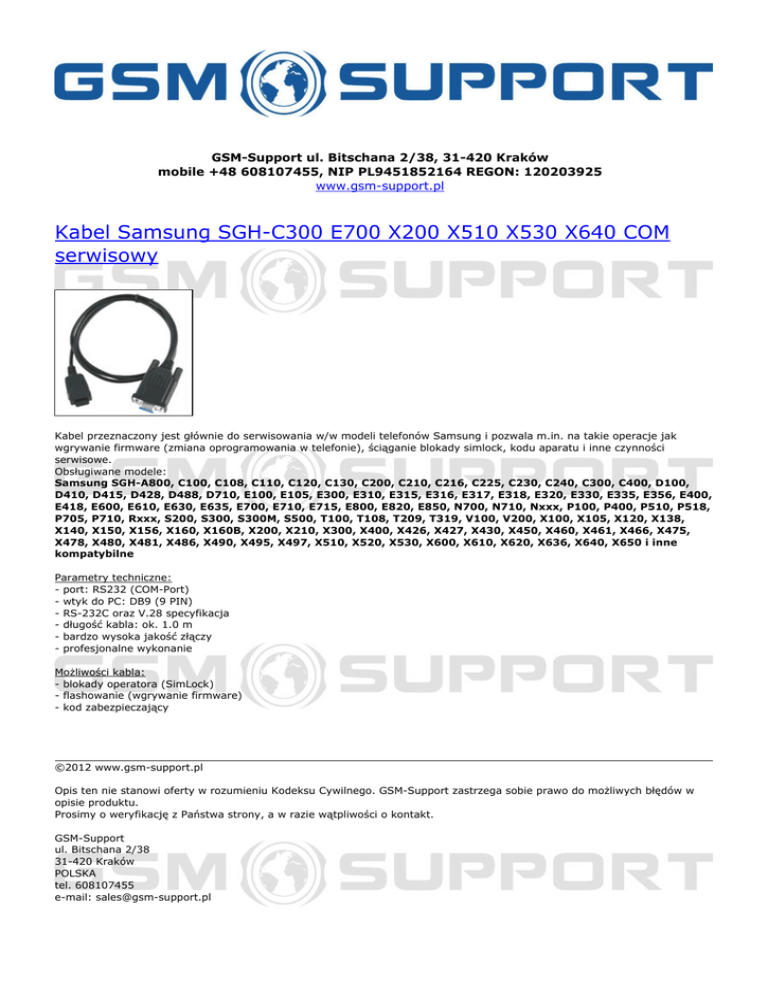 GSM-Support ul. Bitschana 2/38, 31-420 Kraków mobile +48 608107455, NIP PL9451852164 REGON: 120203925 www.gsm-support.pl Kabel Samsung SGH-C300 E700 X200 X510 X530 X640 COM serwisowy Kabel przeznaczony jest głównie do serwisowania w/w modeli telefonów Samsung i pozwala m.in. na takie operacje jak wgrywanie firmware (zmiana oprogramowania w telefonie), ściąganie blokady simlock, kodu aparatu i inne czynności serwisowe. Obsługiwane modele: Samsung SGH-A800, C100, C108, C110, C120, C130, C200, C210, C216, C225, C230, C240, C300, C400, D100, D410, D415, D428, D488, D710, E100, E105, E300, E310, E315, E316, E317, E318, E320, E330, E335, E356, E400, E418, E600, E610, E630, E635, E700, E710, E715, E800, E820, E850, N700, N710, Nxxx, P100, P400, P510, P518, P705, P710, Rxxx, S200, S300, S300M, S500, T100, T108, T209, T319, V100, V200, X100, X105, X120, X138, X140, X150, X156, X160, X160B, X200, X210, X300, X400, X426, X427, X430, X450, X460, X461, X466, X475, X478, X480, X481, X486, X490, X495, X497, X510, X520, X530, X600, X610, X620, X636, X640, X650 i inne kompatybilne Parametry techniczne: - port: RS232 (COM-Port) - wtyk do PC: DB9 (9 PIN) - RS-232C oraz V.28 specyfikacja - długość kabla: ok. 1.0 m - bardzo wysoka jakość złączy - profesjonalne wykonanie Możliwości kabla: - blokady operatora (SimLock) - flashowanie (wgrywanie firmware) - kod zabezpieczający ©2012 www.gsm-support.pl Opis ten nie stanowi oferty w rozumieniu Kodeksu Cywilnego. GSM-Support zastrzega sobie prawo do możliwych błędów w opisie produktu. Prosimy o weryfikację z Państwa strony, a w razie wątpliwości o kontakt. GSM-Support ul. Bitschana 2/38 31-420 Kraków POLSKA tel. 608107455 e-mail: [email protected] Powered by TCPDF (www.tcpdf.org)