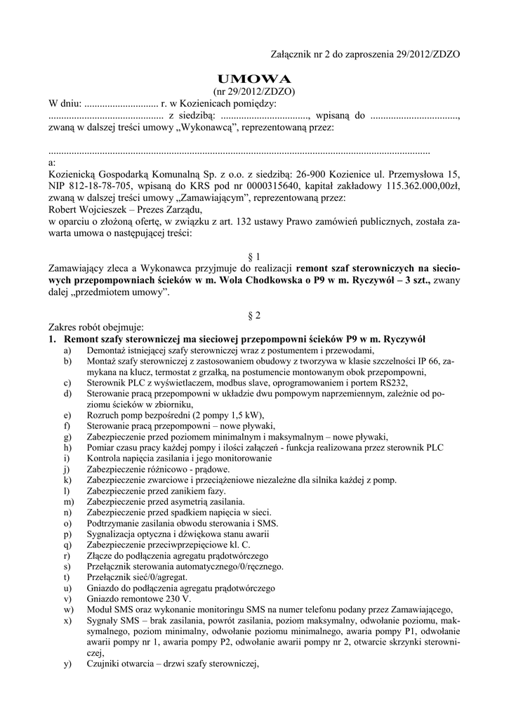 Załącznik nr 2 do zaproszenia 29/2012/ZDZO UMOWA (nr 29/2012/ZDZO) W dniu: ............................. r. w Kozienicach pomiędzy: ............................................. z siedzibą: .................................., wpisaną do .................................., zwaną w dalszej treści umowy „Wykonawcą”, reprezentowaną przez: ..................................................................................................................................................... a: Kozienicką Gospodarką Komunalną Sp. z o.o. z siedzibą: 26-900 Kozienice ul. Przemysłowa 15, NIP 812-18-78-705, wpisaną do KRS pod nr 0000315640, kapitał zakładowy 115.362.000,00zł, zwaną w dalszej treści umowy „Zamawiającym”, reprezentowaną przez: Robert Wojcieszek – Prezes Zarządu, w oparciu o złożoną ofertę, w związku z art. 132 ustawy Prawo zamówień publicznych, została zawarta umowa o następującej treści: §1 Zamawiający zleca a Wykonawca przyjmuje do realizacji remont szaf sterowniczych na sieciowych przepompowniach ścieków w m. Wola Chodkowska o P9 w m. Ryczywół – 3 szt., zwany dalej „przedmiotem umowy”. §2 Zakres robót obejmuje: 1. Remont szafy sterowniczej ma sieciowej przepompowni ścieków P9 w m. Ryczywół a) b) c) d) e) f) g) h) i) j) k) l) m) n) o) p) q) r) s) t) u) v) w) x) y) Demontaż istniejącej szafy sterowniczej wraz z postumentem i przewodami, Montaż szafy sterowniczej z zastosowaniem obudowy z tworzywa w klasie szczelności IP 66, zamykana na klucz, termostat z grzałką, na postumencie montowanym obok przepompowni, Sterownik PLC z wyświetlaczem, modbus slave, oprogramowaniem i portem RS232, Sterowanie pracą przepompowni w układzie dwu pompowym naprzemiennym, zależnie od poziomu ścieków w zbiorniku, Rozruch pomp bezpośredni (2 pompy 1,5 kW), Sterowanie pracą przepompowni – nowe pływaki, Zabezpieczenie przed poziomem minimalnym i maksymalnym – nowe pływaki, Pomiar czasu pracy każdej pompy i ilości załączeń - funkcja realizowana przez sterownik PLC Kontrola napięcia zasilania i jego monitorowanie Zabezpieczenie różnicowo - prądowe. Zabezpieczenie zwarciowe i przeciążeniowe niezależne dla silnika każdej z pomp. Zabezpieczenie przed zanikiem fazy. Zabezpieczenie przed asymetrią zasilania. Zabezpieczenie przed spadkiem napięcia w sieci. Podtrzymanie zasilania obwodu sterowania i SMS. Sygnalizacja optyczna i dźwiękowa stanu awarii Zabezpieczenie przeciwprzepięciowe kl. C. Złącze do podłączenia agregatu prądotwórczego Przełącznik sterowania automatycznego/0/ręcznego. Przełącznik sieć/0/agregat. Gniazdo do podłączenia agregatu prądotwórczego Gniazdo remontowe 230 V. Moduł SMS oraz wykonanie monitoringu SMS na numer telefonu podany przez Zamawiającego, Sygnały SMS – brak zasilania, powrót zasilania, poziom maksymalny, odwołanie poziomu, maksymalnego, poziom minimalny, odwołanie poziomu minimalnego, awaria pompy P1, odwołanie awarii pompy nr 1, awaria pompy P2, odwołanie awarii pompy nr 2, otwarcie skrzynki sterowniczej, Czujniki otwarcia – drzwi szafy sterowniczej, z) aa) bb) cc) Zabezpieczenie kabli sterowniczych i zasilających pomiędzy szafą sterowniczą a przepompownią – rura osłonowa Wykonanie rozruchu elektrycznego. Wykonanie pomiarów : rezystancji izolacji obwodów, zabezpieczeń różnicowoprądowych, Wykonanie Dokumentacji Techniczno Ruchowej oraz szkolenie personelu. 2. Remont szaf sterowniczych na sieciowych przepompowniach ścieków P4 i P7 w m. Wola Chodkowska – 2 szt. a) Demontaż istniejącej szafy sterowniczej wraz z postumentem i przewodami b) Montaż szafy sterowniczej z zastosowaniem obudowy z tworzywa w klasie szczelności IP 66, zamykana na klucz, termostat z grzałką, na postumencie montowanym obok przepompowni, c) Sterownik PLC z wyświetlaczem, modbus slave, oprogramowaniem i portem RS232, d) Sterowanie pracą przepompowni w układzie dwu pompowym naprzemiennym, zależnie od poziomu ścieków w zbiorniku, Rozruch pomp bezpośredni (P4 – 2 pompy 0,75 kW, P7 – 2 pompy 1,1 kW), Sterowanie pracą przepompowni – nowe pływaki, Zabezpieczenie przed poziomem minimalnym i maksymalnym – nowe pływaki, Pomiar czasu pracy każdej pompy i ilości załączeń - funkcja realizowana przez sterownik PLC Kontrola napięcia zasilania i jego monitorowanie Zabezpieczenie różnicowo - prądowe. Zabezpieczenie zwarciowe i przeciążeniowe niezależne dla silnika każdej z pomp. Zabezpieczenie przed zanikiem fazy. Zabezpieczenie przed asymetrią zasilania. Zabezpieczenie przed spadkiem napięcia w sieci. Podtrzymanie zasilania obwodu sterowania. Sygnalizacja optyczna i dźwiękowa stanu awarii Zabezpieczenie przeciwprzepięciowe kl. C. Złącze do podłączenia agregatu prądotwórczego Przełącznik sterowania automatycznego/0/ręcznego. Przełącznik sieć/0/agregat. Gniazdo do podłączenia agregatu prądotwórczego Gniazdo remontowe 230 V. Zabezpieczenie kabli sterowniczych i zasilających pomiędzy szafą sterowniczą a przepompownią – rura osłonowa x) Wykonanie rozruchu elektrycznego. y) Wykonanie pomiarów : rezystancji izolacji obwodów, zabezpieczeń różnicowoprądowych z) Wykonanie Dokumentacji Techniczno Ruchowej oraz szkolenie personelu. e) f) g) h) i) j) k) l) m) n) o) p) q) r) s) t) u) v) w) 3. 4. Remont szaf sterowniczych nie może zakłócić ciągłej pracy przepompowni. Do prawidłowej pracy układu monitoringu SMS na sieciowej przepompowni ścieków P9 w m. Ryczywół Zamawiający przekaże Wykonawcy kartę SIM. §3 Przedmiot umowy winien zostać wykonany między innymi zgodnie z ustawą z dnia 7 lipca 1994 r. Prawo Budowlane (Dz. U. Nr 156 poz. 1118 z 2006 r. z późniejszymi zmianami). §4 Realizacja robót 1. Od terminu przekazania terenu robót, a do terminu podpisania końcowego bezusterkowego protokółu odbioru, Wykonawca ponosi pełną odpowiedzialność za roboty, teren prac, materiały oraz zatrudnionych pracowników. 2. Wy