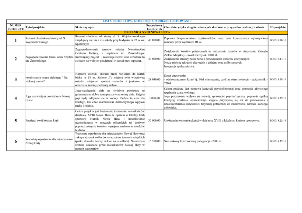 NUMER Tytuł projektu PROJEKTU LISTA PROJEKTÓW, KTÓRE BĘDĄ PODDANE GŁOSOWANIU Szacunkowy Skrócony opis Charakterystyka długoterminowych skutków w przypadku realizacji zadania ID projektu koszt (w zł) DZIELNICA XVIII NOWA HUTA Remont chodnika od strony ul. S. Wojciechowskiego Poprawa bezpieczeństwa użytkowników, oraz brak konieczności wykonywania BO.D18.10/16 zanjdujący się vis a vis szkoły przy budynku nr 22 w os. 40 000,00 remontu przez najbliższe 10 lat. Sportowym 1 Remont chodnika od strony ul. S. Wojciechowskiego 2 Zagospodarowanie terenow miedzy Nowohuckim Centrum Kultury, a szpitalem im. Zeromskiego. Zagospodarowanie terenu obok Szpitala Interesujacy projekt i realizacja zieleni oraz urzadzen do im. Żeromskiego. cwiczen na wolnym powietrzu( w czesci przy szpitalu). 3 rekultywacja terenu zielonego " Na zielonej trawce" Naprawa estetyki skweru przed wejściem do klatek bloku nr 18 os. Zielone .To miejsce było wizytówką osiedla, miejscem spotkań seniorów i juniorów w otoczeniu świeżej zadbanej zieleni. Joga na świeżym powietrzu w Nowej Hucie Joga-rozciąganie ciała na świeżym powietrzu to gwarancja na dobre samopoczucie na resztę dnia. Zajęcia jogi będą odbywać się w soboty. Będzie to czas dla każdego, kto chce zasmakować dobroczynnego wpływu ruchu i relaksu. 4 5 6 Celem projektu jest budowanie tożsamości mieszkańców dzielnicy XVIII Nowa Huta w oparciu o lokalny klub sportowy Hutnik Nowa Huta i umożliwienie Wspieraj swój lokalny klub uczestniczenia w meczach piłkarskich tej drużyny poprzez pokrycie kosztów wynajmu stadionu ze środków budżetu. Warsztaty ogrodnicze dla mieszkańców Nowej Huty oraz zakup sadzonek roślin do nasadzeń na terenach miejskich Warsztaty ogrodnicze dla mieszkańców (parki, skwerki, tereny zielone na osiedlach). Nasadzenia Nowej Huty zostaną dokonane przez mieszkańców Nowej Huty w ramach warsztatów. 40 000,00 Zwiększenie kosztów potrzebnych na utrzymanie terenów w utrzymaniu Zarządu Zieleni Miejskiej – koszt roczny ok. 1000 zł. BO.D18.47/16 Zwiększenie atrakcyjności parku i przywrócenie walorów estetycznych. Nowe miejsce rekreacji dla rodzin z dziećmi oraz osób starszych. Integracja społeczeństwa. 28 040,00 Koszt utrzymania: - odchwaszczanie 3zł/m² tj. 90zł miesięcznie, czyli za okres kwieceń - październik - BO.D18.19/16 720zł. 3 000,00 Celem projektu jest poprawa kondycji psychofizycznej oraz promocja aktywnego spędzania czasu wolnego. Joga pozytywnie wpływa na rozwój, sprawność psychofizyczną, poprawia ogólną BO.D18.39/16 kondycję działania, odstresowuje. Zajęcia przyczynią się też do promowania i upowszechniania aktywności fizycznej potrzebnej do zachowania zdrowia każdego człowieka. 30 000,00 Utożsamianie się mieszkańców dzielnicy XVIII z lokalnym klubem sportowym. BO.D18.25/16 15 500,00 Szacunkowy koszt rocznej pielęgnacji - 2000 zł. BO.D18.37/16 7 Nowohucki Festiwal Sportu Nowohucka Szkoła Biega 6-7.10.2017 8 Oaza spokoju dla malusińskich i ich mam 9 10 Pikniki dla mieszkańców Nowej Huty Akcja Skwer w Centrum Organizacja 6-7.10.2017 r. na stadionie MOS Kraków Wschód na os. Szkolnym 39 dwóch imprez sportowych dla mieszkańców Dzielnicy Nowa Huta. Rozgrywkom sportowym towarzyszyć będą liczne atrakcje: pokazy walk i balonów, dmuchane konstrukcje i animacje. Wymiana zniszczonych płyt chodnikowych wokół zagospodarowanej już piaskownicy oraz remont zatoki postojowej na kilka samochodów. Cztery wydarzenia plenerowe w ramach których zostaną zorganizowane atrakcje dla dorosłych, młodzieży i dzieci. Pikniki odbędą się w parku im. S. Żeromskiego (przy Łąkach Nowohuckich) oraz w Parku Ratuszowym (przy al. Róż). Zamieńmy brzydkie podwórko na osiedlu Centrum A (przy bloku nr 6 i przed klubem Jędruś) na przyjazne mieszkańcom: montaż ławeczek i mebli miejskich, montaż koszy na śmieci i na psie odchody, posianie trawy i uporzadkowanie skweru (wycięcie chaszczy). 31 000,00 Zorganizowanie dwóch dużych imprez sportowych dla mieszkańców Dzielnicy Nowa Huta ma na celu promocję sportu, popularyzację kultury fizycznej oraz propagowanie aktywnego spędzania czasu wolnego wśród dzieci, młodzieży i osób dorosłych z tej części Krakowa. Uczestnictwo w imprezach młodzieży oraz rodzin z dziećmi w wieku szkolnym i przedszkolnym będzie doskonałym sposobem na integrację rodzin nowohuckich poprzez sport i sposobem na wspólne, aktywne spędzenie czasu. Możliwość BO.D18.30/16 bezpłatnego uczestnictwa w różnych konkursach i rozgrywkach podczas plenerowych imprez będzie dla mieszkańców Nowej Huty wielką atrakcją i ciekawą formą spędzenia czasu wolnego. Zorganizowanie imprez wpłynie na wzrost popularności różnych dyscyplin sportu wśród dzieci i młodzieży z terenu Nowej Huty oraz na stymulowanie ich aktywności fizycznej. Będzie to również doskonała forma promocji prozdrowotnych, wychowawczych i edukacyjnych wartości sportu. 40 000,00 Poprawa bezpieczeństwa użytkowników, oraz brak konieczności wykonania remontu BO.D18.40/16 przez najbliższe 10 lat. 12 000,00 35 400,00 11 Francuskie kino plenerowe nad Nowohuckim Zalewem Projekt zakłada organizację darmowego kina plenerowego nad Zalewem w Nowej Hucie. Przez 9 wakacyjnych sobót mieszkańcy dzielnicy będą mieli okazję rozsiąść się w wygodnych leżakach i poznać bliżej perły francuskiego kina w towarzystwie najbliższych. 31 500,00 12 Projekt „Wyjątkowy Mikołaj dla Wyjątkowych Dzieciaków” zostanie zorganizowany dla dzieci z „Wyjątkowy Mikołaj dla Wyjątkowych Zespołem Downa oraz Mózgowym Porażeniem Dzieciaków” Dziecięcym. Podczas wydarzenia zaplanowano liczne atrakcje dla uczestników. Gościem specjalnym będzie Święty Mikołaj, który 4 800,00 Realizacja projektu pn. „Pikniki dla mieszkańców Nowej Huty” przyczyni się do rozwoju zainteresowań, nauki pracy zespołowej, wymiany doświadczeń między BO.D18.33/16 ucze