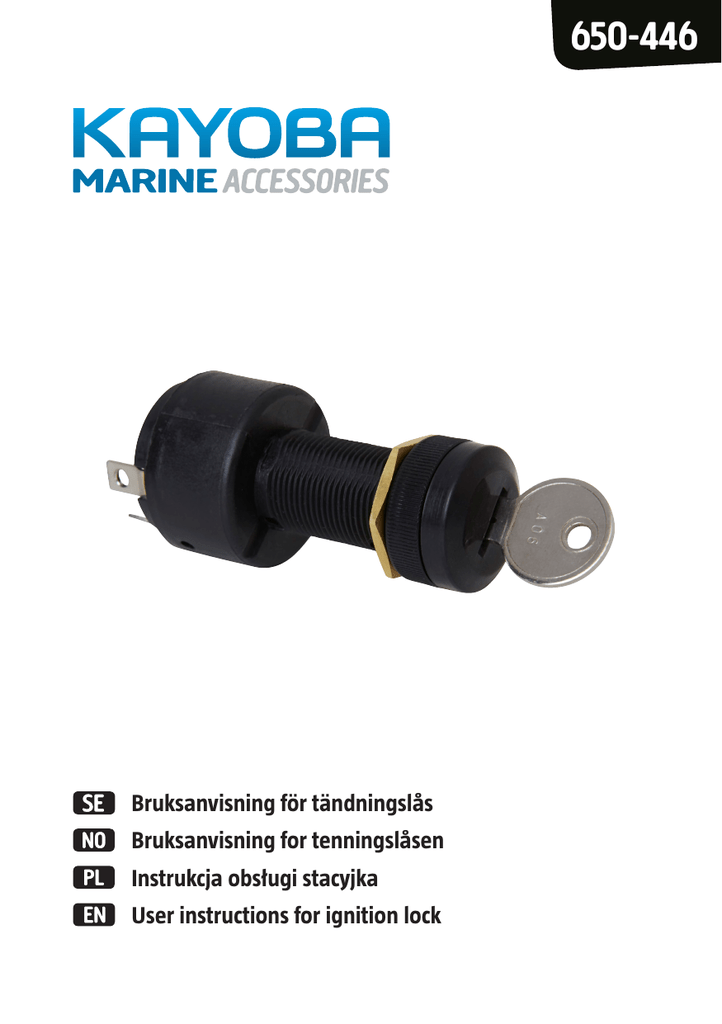 650-446 Bruksanvisning för tändningslås Bruksanvisning for tenningslåsen Instrukcja obsługi stacyjka User instructions for ignition lock SE - NO - PL - EN - Bruksanvisning i original Bruksanvisning i original Instrukcja obsługi w oryginale Operating instructions in original Date of production: 2014-11-24 © Jula AB SVENSKA������������������������������������������������������������������������������������������������������������������ 4 SÄKERHETSANVISNINGAR����������������������������������������������������������������������������������������������������������������������4 BESKRIVNING������������������������������������������������������������������������������������������������������������������������������������������4 NORSK���������������������������������������������������������������������������������������������������������������������� 5 SIKKERHETSANVISNINGER����������������������������������������������������������������������������������������������������������������������5 BESKRIVELSE ������������������������������������������������������������������������������������������������������������������������������������������5 POLSKI���������������������������������������������������������������������������������������������������������������������� 6 ZASADY BEZPIECZEŃSTWA��������������������������������������������������������������������������������������������������������������������� 6 OPIS������������������������������������������������������������������������������������������������������������������������������������������������������� 6 ENGLISH�������������������������������������������������������������������������������������������������������������������� 7 SAFETY INSTRUCTIONS ��������������������������������������������������������������������������������������������������������������������������7 DESCRIPTION������������������������������������������������������������������������������������������������������������������������������������������7 SE Bruksanvisning för tändningslås SVENSKA SÄKERHETSANVISNINGAR Läs bruksanvisningen noggrant innan användning! Spara den för framtida behov. BESKRIVNING Tändningskrets Solenoid I Vädertät kåpa S B Batteri AV Tändningsläge Startläge Rätten till ändringar förbehålles. Vid eventuella problem, kontakta vår serviceavdelning på telefon 0511-34 20 00 Jula AB, Box 363, 532 24 SKARA www.jula.se 4 Bruksanvisning for tenningslåsen NORSK NO SIKKERHETSANVISNINGER Les bruksanvisningen nøye før bruk! Ta vare på den for fremtidig bruk. BESKRIVELSE Tenningskrets Magnetbryter I Værbeskyttet hette S B Batteri AV Bat-ign Bat-ign-st Med forbehold om endringer. Ved eventuelle problemer kan du kontakte vår serviceavdeling på telefon 67 90 01 34. Jula Norge AS, Solheimsveien 6–8, 1471 LØRENSKOG www.jula.no 5 PL Instrukcja obsługi stacyjka POLSKI ZASADY BEZPIECZEŃSTWA Przed użyciem uważnie przeczytaj niniejszą instrukcję obsługi! Zachowaj ją w celu wykor