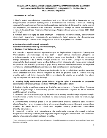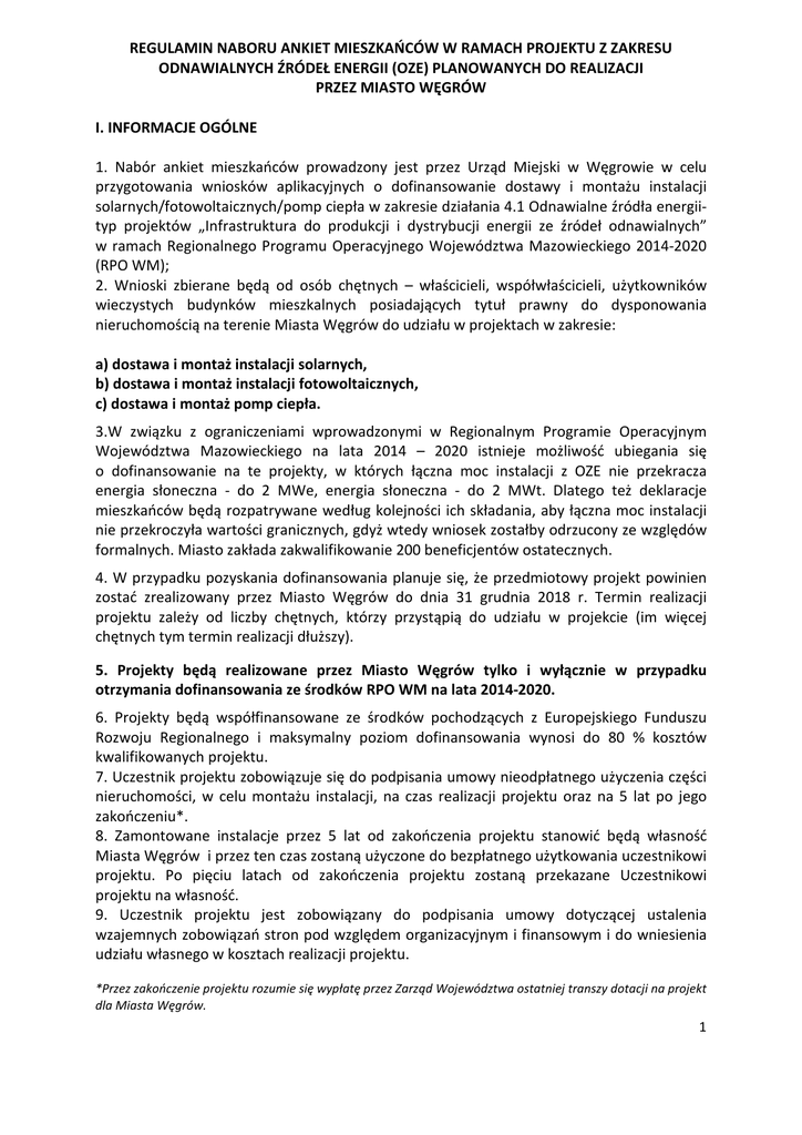 REGULAMIN NABORU ANKIET MIESZKAŃCÓW W RAMACH PROJEKTU Z ZAKRESU ODNAWIALNYCH ŹRÓDEŁ ENERGII (OZE) PLANOWANYCH DO REALIZACJI PRZEZ MIASTO WĘGRÓW I. INFORMACJE OGÓLNE 1. Nabór ankiet mieszkańców prowadzony jest przez Urząd Miejski w Węgrowie w celu przygotowania wniosków aplikacyjnych o dofinansowanie dostawy i montażu instalacji solarnych/fotowoltaicznych/pomp ciepła w zakresie działania 4.1 Odnawialne źródła energiityp projektów „Infrastruktura do produkcji i dystrybucji energii ze źródeł odnawialnych” w ramach Regionalnego Programu Operacyjnego Województwa Mazowieckiego 2014-2020 (RPO WM); 2. Wnioski zbierane będą od osób chętnych – właścicieli, współwłaścicieli, użytkowników wieczystych budynków mieszkalnych posiadających tytuł prawny do dysponowania nieruchomością na terenie Miasta Węgrów do udziału w projektach w zakresie: a) dostawa i montaż instalacji solarnych, b) dostawa i montaż instalacji fotowoltaicznych, c) dostawa i montaż pomp ciepła. 3.W związku z ograniczeniami wprowadzonymi w Regionalnym Programie Operacyjnym Województwa Mazowieckiego na lata 2014 – 2020 istnieje możliwość ubiegania się o dofinansowanie na te projekty, w których łączna moc instalacji z OZE nie przekracza energia słoneczna - do 2 MWe, energia słoneczna - do 2 MWt. Dlatego też deklaracje mieszkańców będą rozpatrywane według kolejności ich składania, aby łączna moc instalacji nie przekroczyła wartości granicznych, gdyż wtedy wniosek zostałby odrzucony ze względów formalnych. Miasto zakłada zakwalifikowanie 200 beneficjentów ostatecznych. 4. W przypadku pozyskania dofinansowania planuje się, że przedmiotowy projekt powinien zostać zrealizowany przez Miasto Węgrów do dnia 31 grudnia 2018 r. Termin realizacji projektu zależy od liczby chętnych, którzy przystąpią do udziału w projekcie (im więcej chętnych tym termin realizacji dłuższy). 5. Projekty będą realizowane przez Miasto Węgrów tylko i wyłącznie w przypadku otrzymania dofinansowania ze środków RPO WM na lata 2014-2020. 6. Projekty będą współfinansowane ze środków pochodzących z Europejskiego Funduszu Rozwoju Regionalnego i maksymalny poziom dofinansowania wynosi do 80 % kosztów kwalifikowanych projektu. 7. Uczestnik projektu zobowiązuje się do podpisania umowy nieodpłatnego użyczenia części nieruchomości, w celu montażu instalacji, na czas realizacji projektu oraz na 5 lat po jego zakończeniu*. 8. Zamontowane instalacje przez 5 lat od zakończenia projektu stanowić będą własność Miasta Węgrów i przez ten czas zostaną użyczone do bezpłatnego użytkowania uczestnikowi projektu. Po pięciu latach od zakończenia projektu zostaną przekazane Uczestnikowi projektu na własność. 9. Uczestnik projektu jest zobowiązany do podpisania umowy dotyczącej ustalenia wzajemnych zobowiązań stron pod względem organizacyjnym i finansowym i do wniesienia udziału własnego w kosztach realizacji projektu. *Przez zakończenie projektu rozumie się wypłatę przez Zarząd Województwa ostatniej transzy dotacji na projekt dla Miasta Węgrów. 1 10. Uczestnik nie może posiadać zaległości w podatkach i opłatach lokalnych oraz innych należnościach wobec Urzędu Miejskiego w Węgrowie. Dane te będą na bieżąco weryfikowane przez Urząd Miejski w Węgrowie. 11. Dopuszcza się złożenie tylko jednej ankiety na daną lokalizację (na kolektory słoneczne/fotowoltaikę/pomp ciepła). 12. Urząd Miejski w Węgrowie dopuszcza wprowadzenie zmian w niniejszym Regulaminie naboru ankiet, w tym w szczególności terminu wydłużenia naboru. Informacja w tym zakresie zostanie umieszczona na stronie internetowej www.wegrow.com.pl/oze 13. Szczegółowych informacji dotyczących naboru wniosków uzyskać można osobiście w Urzędzie Miejskim w Węgrowie, ul. Rynek Mariacki 16, 07-100 Węgrów. II. TERMIN I MIEJSCE SKŁADANIA ANKIET 1. Nabór ankiet prowadzony będzie w dniach 08 sierpień- 16 sierpień 2016 r., w siedzibie Urzędu Miejskiego w Węgrowie, ul. Rynek Mariacki 16,07-100 Węgrów w pok. nr 12 w godz. 8-16. Wzór Ankiety udostępniany jest na stronie internetowej www.wegrow.com.pl/oze oraz do pobrania bezpośrednio w siedzibie Urzędu Miejskiego w Węgrowie przy ul. Rynek Mariacki 16, Wydział Inwestycji i Ochrony Środowiska, pok. nr 12 W momencie złożenia dokumentów, deklaracja wraz z ankietą zostanie zarejestrowana, a składający otrzyma potwierdzenie przyjęcia oraz indywidualny numer, którym będzie identyfikowany przy projekcie. 2. O kwalifikacji do projektu decyduje kolejność zgłoszeń. Urząd Miasta utworzy listę pierwszych 200 chętnych zakwalifikowanych do audytu i projektu. 3. Kolejne osoby zgłaszające się w terminie o którym mowa w pkt 1 znajdą się na liście rezerwowej, a ich udział w projekcie będzie możliwy jedynie w sytuacji rezygnacji lub wykluczenia osób z listy podstawowej. 4.Warunkiem uczestnictwa w projekcie jest wniesienie opłaty (w wysokości 98,40 zł) złożenie ankiety i podpisanie umów. 5. Ankiety złożone przed lub po terminie określonym w pkt.1 -pozostaną bez rozpatrzenia. III. KTO MOŻE APLIKOWAĆ 1. Osoby fizyczne posiadające nieruchomość na terenie Miasta Węgrów, będące właścicielem lub użytkownikiem budynku mieszkalnego posiadających tytuł prawny do dysponowania nieruchomością, gdzie efekty realizacji projektu wykorzystywane będą wyłącznie do celów socjalno- bytowych mieszkańców. 2. W przypadku współwłasności nieruchomości wszyscy współwłaściciele muszą wyrazić zgodę na użyczenie nieruchomości na cele projektu. 3. Osoby nie posiadające jakichkolwiek zaległości w zobowiązaniach finansowych z tytułu podatków i opłat lokalnych oraz innych należności wobec Urzędu Miejskiego w Węgrowie. IV. DOKUMENTY WYMAGANE NA ETAPIE APLIKOWANIA O ZAKWALIFIKOWANIE MIESZKAŃCA DO PROJEKTU 1. Ankieta dotycząca danych o budynku niezbędnych do realizac