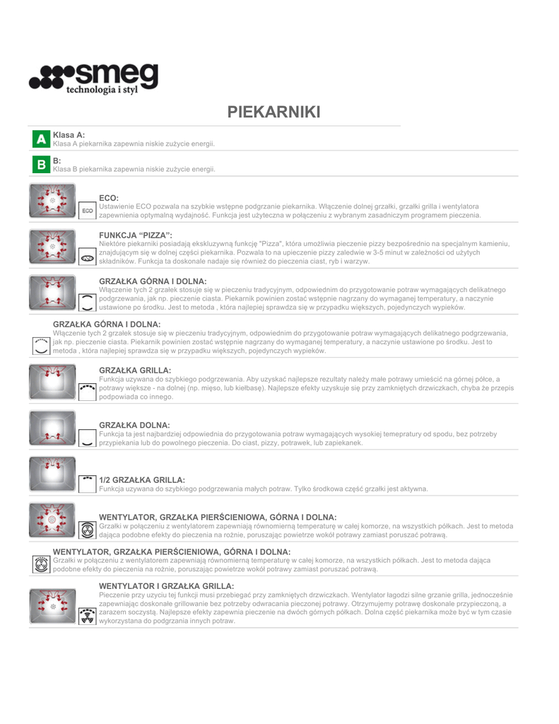 PIEKARNIKI Klasa A: Klasa A piekarnika zapewnia niskie zużycie energii. B: Klasa B piekarnika zapewnia niskie zużycie energii. ECO: Ustawienie ECO pozwala na szybkie wstępne podgrzanie piekarnika. Włączenie dolnej grzałki, grzałki grilla i wentylatora zapewnienia optymalną wydajność. Funkcja jest użyteczna w połączeniu z wybranym zasadniczym programem pieczenia. FUNKCJA “PIZZA”: Niektóre piekarniki posiadają ekskluzywną funkcję "Pizza", która umożliwia pieczenie pizzy bezpośrednio na specjalnym kamieniu, znajdującym się w dolnej części piekarnika. Pozwala to na upieczenie pizzy zaledwie w 3-5 minut w zależności od użytych składników. Funkcja ta doskonale nadaje się również do pieczenia ciast, ryb i warzyw. GRZAŁKA GÓRNA I DOLNA: Włączenie tych 2 grzałek stosuje się w pieczeniu tradycyjnym, odpowiednim do przygotowanie potraw wymagających delikatnego podgrzewania, jak np. pieczenie ciasta. Piekarnik powinien zostać wstępnie nagrzany do wymaganej temperatury, a naczynie ustawione po środku. Jest to metoda , która najlepiej sprawdza się w przypadku większych, pojedynczych wypieków. GRZAŁKA GÓRNA I DOLNA: Włączenie tych 2 grzałek stosuje się w pieczeniu tradycyjnym, odpowiednim do przygotowanie potraw wymagających delikatnego podgrzewania, jak np. pieczenie ciasta. Piekarnik powinien zostać wstępnie nagrzany do wymaganej temperatury, a naczynie ustawione po środku. Jest to metoda , która najlepiej sprawdza się w przypadku większych, pojedynczych wypieków. GRZAŁKA GRILLA: Funkcja uzywana do szybkiego podgrzewania. Aby uzyskać najlepsze rezultaty należy małe potrawy umieścić na górnej półce, a potrawy większe - na dolnej (np. mięso, lub kiełbasę). Najlepsze efekty uzyskuje się przy zamkniętych drzwiczkach, chyba że przepis podpowiada co innego. GRZAŁKA DOLNA: Funkcja ta jest najbardziej odpowiednia do przygotowania potraw wymagających wysokiej temepratury od spodu, bez potrzeby przypiekania lub do powolnego pieczenia. Do ciast, pizzy, potrawek, lub zapiekanek. 1/2 GRZAŁKA GRILLA: Funkcja uzywana do szybkiego podgrzewania małych potraw. Tylko środkowa część grzałki jest aktywna. WENTYLATOR, GRZAŁKA PIERŚCIENIOWA, GÓRNA I DOLNA: Grzałki w połączeniu z wentylatorem zapewniają równomierną temperaturę w całej komorze, na wszystkich półkach. Jest to metoda dająca podobne efekty do pieczenia na rożnie, poruszając powietrze wokół potrawy zamiast poruszać potrawą. WENTYLATOR, GRZAŁKA PIERŚCIENIOWA, GÓRNA I DOLNA: Grzałki w połączeniu z wentylatorem zapewniają równomierną temperaturę w całej komorze, na wszystkich półkach. Jest to metoda dająca podobne efekty do pieczenia na rożnie, poruszając powietrze wokół potrawy zamiast poruszać potrawą. WENTYLATOR I GRZAŁKA GRILLA: Pieczenie przy uzyciu tej funkcji musi przebiegać przy zamkniętych drzwiczkach. Wentylator łagodzi silne grzanie grilla, jednocześnie zapewniając doskonałe grillowanie bez potrzeby odwracania pieczonej potrawy. Otrzymujemy potrawę doskonale przypieczoną, a zarazem soczystą. Najlepsze efekty zapewnia pieczenie na dwóch górnych półkach. Dolna część piekarnika może być w tym czasie wykorzystana do podgrzania innych potraw. WENTYLATOR I GRZAŁKA GRILLA: Pieczenie przy uzyciu tej funkcji musi przebiegać przy zamkniętych drzwiczkach. Wentylator łagodzi silne grzanie grilla, jednocześnie zapewniając doskonałe grillowanie bez potrzeby odwracania pieczonej potrawy. Otrzymujemy potrawę doskonale przypieczoną, a zarazem soczystą. Najlepsze efekty zapewnia pieczenie na dwóch górnych półkach. Dolna część piekarnika może być w tym czasie wykorzystana do podgrzania innych potraw. Blokada grzałek: Po wybraniu tej funkcji, urządzenie wyłacza grzałki nawet wtedy jeśli jest nastawiony termostat. WENTYLATOR OBIEGU: Właczenie wentylatora, to najlepszy sposób korzystania z grzałki pierścieniowej sterowanej wybranymi ustawieniami termostatu. WENTYLATOR, GRZAŁKA GÓRNA I DOLNA: Grzałki w połączeniu z wentylatorem zapewniają równomierną temperaturę w całej komorze. Jest to metoda dająca podobne efekty do pieczenia tradycyjnego. Mniej wydajna od użycia wentylatora i 3 grzalek. Najlepsza do wypieku ciast. WENTYLATOR, GRZAŁKA GÓRNA I DOLNA: Grzałki w połączeniu z wentylatorem zapewniają równomierną temperaturę w całej komorze. Jest to metoda dająca podobne efekty do pieczenia tradycyjnego. Mniej wydajna od użycia wentylatora i 3 grzalek. Najlepsza do wypieku ciast. WENTYLATOR, GRZAŁKA PIERŚCIENIOWA: Grzałka w połączeniu z wentylatorem zapewniają równomierną temperaturę w całej komorze, na wszystkich półkach. Podczas pieczenia potraw ponad 20 minut, niepotrzebne jest stosowanie wstepnego rozgrzania piekarnika. Jest to metoda dająca oszczędność energii, kótszy czas podgrzewania. idealna do odgrzewania zimnych potraw. WENTYLATOR, GRZAŁKA PIERŚCIENIOWA I DOLNA: Dodanie grzałki dolnej powoduje dostarczenie dodatkowego ciepła do spodu potrawy niezbędnego do jej podgrzania. WENTYLATOR, GRZAŁKA DOLNA: Dodanie dolnej grzałki do wymuszonego obiegu podnosi temperaturę w dolnej części potrawy, zapewniając jej skuteczniejsze pieczenie środka bez przypiekania powierzchni. Mikrofale: Mikrofale przedostają się bezpośrednio do żywności, zapewniając szybkie pieczenie i oszczędność energii. Doskonały sposób na przygotowanie potraw bez użycia tłuszczu, rozmrażanie oraz podgrzewanie bez zmiany ich smaku i formy. Może być używana razem z funkcjami tradycyjnego pieczenia bez utraty wszystkich ich zalet. MIKROFALE I GRZAŁKA GRILLA: Połączenie działania mikrofal z działaniem grzałki grilla jest idealne w przypadku szybkiego gotowania połączonego z rumienieniem potraw. Co więcej, przy użyciu tej funkcji można przygotować potrawy pokryte serem. KUCHENKI MIKROFALOWE: Kuchenki mikrofalowe pozwalają na przygotowanie potraw w najkrótszym mo