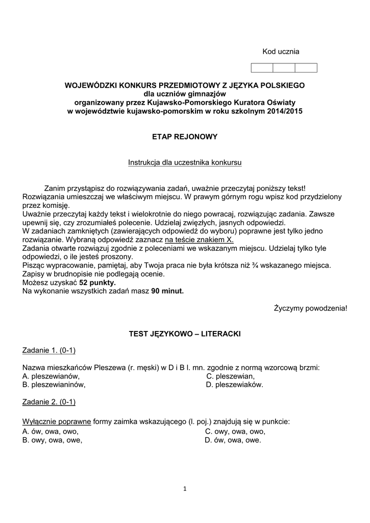 Kod ucznia WOJEWÓDZKI KONKURS PRZEDMIOTOWY Z JĘZYKA POLSKIEGO dla uczniów gimnazjów organizowany przez Kujawsko-Pomorskiego Kuratora Oświaty w województwie kujawsko-pomorskim w roku szkolnym 2014/2015 ETAP REJONOWY Instrukcja dla uczestnika konkursu Zanim przystąpisz do rozwiązywania zadań, uważnie przeczytaj poniższy tekst! Rozwiązania umieszczaj we właściwym miejscu. W prawym górnym rogu wpisz kod przydzielony przez komisję. Uważnie przeczytaj każdy tekst i wielokrotnie do niego powracaj, rozwiązując zadania. Zawsze upewnij się, czy zrozumiałeś polecenie. Udzielaj zwięzłych, jasnych odpowiedzi. W zadaniach zamkniętych (zawierających odpowiedź do wyboru) poprawne jest tylko jedno rozwiązanie. Wybraną odpowiedź zaznacz na teście znakiem X. Zadania otwarte rozwiązuj zgodnie z poleceniami we wskazanym miejscu. Udzielaj tylko tyle odpowiedzi, o ile jesteś proszony. Pisząc wypracowanie, pamiętaj, aby Twoja praca nie była krótsza niż ¾ wskazanego miejsca. Zapisy w brudnopisie nie podlegają ocenie. Możesz uzyskać 52 punkty. Na wykonanie wszystkich zadań masz 90 minut. Życzymy powodzenia! TEST JĘZYKOWO – LITERACKI Zadanie 1. (0-1) Nazwa mieszkańców Pleszewa (r. męski) w D i B l. mn. zgodnie z normą wzorcową brzmi: A. pleszewianów, C. pleszewian, B. pleszewianinów, D. pleszewiaków. Zadanie 2. (0-1) Wyłącznie poprawne formy zaimka wskazującego (l. poj.) znajdują się w punkcie: A. ów, owa, owo, C. owy, owa, owo, B. owy, owa, owe, D. ów, owa, owe. 1 Zadanie 3. (0-1) Wyłącznie poprawne wersje liczebnika dwa w Celowniku (forma i zapis) znajdują się w punkcie: A. dwum, dwu, C. dwu, dwóch, B. dwóm, dwuch, D. dwom, dwu. Zadanie 4. (0-1) Podczas odmiany rzeczownika książę dochodzi do zmiany tematu. Podaj wszystkie możliwe tematy (podstawowy i oboczne). ............................................................................................................................................................ ............................................................................................................................................................ ............................................................................................................................................................ ............................................................................................................................................................ ............................................................................................................................................................ Zadanie 5. (0-1) Teraz już nic więcej nie mogę dla ciebie zrobić. Nazwij części mowy występujące w podanym zdaniu. teraz już nic więcej nie mogę dla ciebie zrobić część mowy Zadanie 6. (0-1) Czytać ciekawe książki to prawdziwa przyjemność. W podanym zdaniu nie ma: A. podmiotu, B. orzecznika, C. przydawki, D. wszystkie odpowiedzi są błędne. Zadanie 7. (0-1) Podaj po jednym przykładzie zdania, w którym liczebnik jest: A. podmiotem, …………………………………………………………………………………………………………………. B. orzecznikiem, …………………………………………………………………………………………………………………. C. przydawką, …………………………………………………………………………………………………………………. D. okolicznikiem. …………………………………………………………………………………………………………………. 2 Zadanie 8. (0-1) Uzupełnij tabelę, określając rodzaj zdania złożonego podrzędnie. Zdanie Był taki, jak zawsze. Domyślam się, dlaczego to zrobił. Sama bym to zrobiła, gdybym miała czas. Co minęło, nie wróci. Obraz, który widzisz, namalował mój dziadek. Zdanie podrzędne… Zadanie 9. (0-1) Wyłącznie spójniki przeciwstawne wymieniono w punkcie: A. przecież, albo, lecz, B. natomiast, przecież, wszakże, C. atoli, tudzież, czy, D. ani, bądź, jednak. Zadanie 10. (0-1) Poprawnie zapisano wszystkie nazwy geograficzne w punkcie: A. Morze Bałtyk, Frankfurt nad Odrą, Rzeka św. Wawrzyńca, B. Morze Bałtyk, Frankfurt Nad Odrą, Rzeka świętego Wawrzyńca, C. morze Bałtyk, Frankfurt nad Odrą, Rzeka Świętego Wawrzyńca, D. morze Bałtyk, Frankfurt Nad Odrą, Rzeka Świętego Wawrzyńca. Zadanie 11. (0-1) Poprawnie zapisano wszystkie wyrazy w punkcie: A. wicedyrektor, Wioletcie, nie drożej, B. wice-dyrektor, Wioletcie, niedrożej, C. wice dyrektor, Wiolecie, nie drożej, D. wice-dyrektor, Wiolettcie, niedrożej. Zdanie 12. (0-1) Jeśli są błędy interpunkcyjne w podanych zdaniach, to je popraw. A. Mój tata nie awansuje ani nie dostanie podwyżki. ............................................................................................................................................................ B. Jest równie miła jak uczynna. ............................................................................................................................................................ C. Pierwsze, wolne wybory odbyły się dopiero niedawno. ............................................................................................................................................................ 3 D. Ona jest zdolniejsza niż Piotrek. ............................................................................................................................................................ E. Podziwiała go, i to od dawna. ............................................................................................................................................................ F. Polskimi noblistami w dziedzinie literatury są współcześnie: Czesław Miłosz i Wisława Szymborska. ............................................................................................