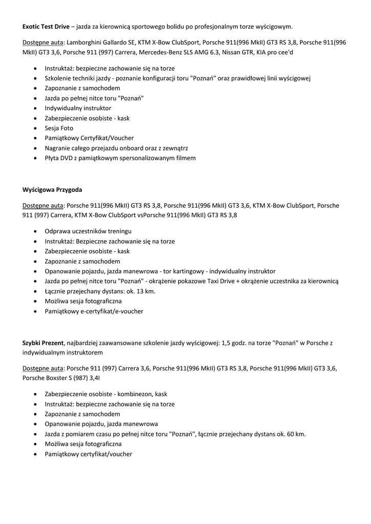 Exotic Test Drive – jazda za kierownicą sportowego bolidu po profesjonalnym torze wyścigowym. Dostępne auta: Lamborghini Gallardo SE, KTM X-Bow ClubSport, Porsche 911(996 MkII) GT3 RS 3,8, Porsche 911(996 MkII) GT3 3,6, Porsche 911 (997) Carrera, Mercedes-Benz SLS AMG 6.3, Nissan GTR, KIA pro cee'd Instruktaż: bezpieczne zachowanie się na torze Szkolenie techniki jazdy - poznanie konfiguracji toru "Poznań" oraz prawidłowej linii wyścigowej Zapoznanie z samochodem Jazda po pełnej nitce toru "Poznań" Indywidualny instruktor Zabezpieczenie osobiste - kask Sesja Foto Pamiątkowy Certyfikat/Voucher Nagranie całego przejazdu onboard oraz z zewnątrz Płyta DVD z pamiątkowym spersonalizowanym filmem Wyścigowa Przygoda Dostępne auta: Porsche 911(996 MkII) GT3 RS 3,8, Porsche 911(996 MkII) GT3 3,6, KTM X-Bow ClubSport, Porsche 911 (997) Carrera, KTM X-Bow ClubSport vsPorsche 911(996 MkII) GT3 RS 3,8 Odprawa uczestników treningu Instruktaż: Bezpieczne zachowanie się na torze Zabezpieczenie osobiste - kask Zapoznanie z samochodem Opanowanie pojazdu, jazda manewrowa - tor kartingowy - indywidualny instruktor Jazda po pełnej nitce toru "Poznań" - okrążenie pokazowe Taxi Drive + okrążenie uczestnika za kierownicą Łącznie przejechany dystans: ok. 13 km. Możliwa sesja fotograficzna Pamiątkowy e-certyfikat/e-voucher Szybki Prezent, najbardziej zaawansowane szkolenie jazdy wyścigowej: 1,5 godz. na torze "Poznań" w Porsche z indywidualnym instruktorem Dostępne auta: Porsche 911 (997) Carrera 3,6, Porsche 911(996 MkII) GT3 RS 3,8, Porsche 911(996 MkII) GT3 3,6, Porsche Boxster S (987) 3,4I Zabezpieczenie osobiste - kombinezon, kask Instruktaż: bezpieczne zachowanie się na torze Zapoznanie z samochodem Opanowanie pojazdu, jazda manewrowa Jazda z pomiarem czasu po pełnej nitce toru "Poznań", łącznie przejechany dystans ok. 60 km. Możliwa sesja fotograficzna Pamiątkowy certyfikat/voucher