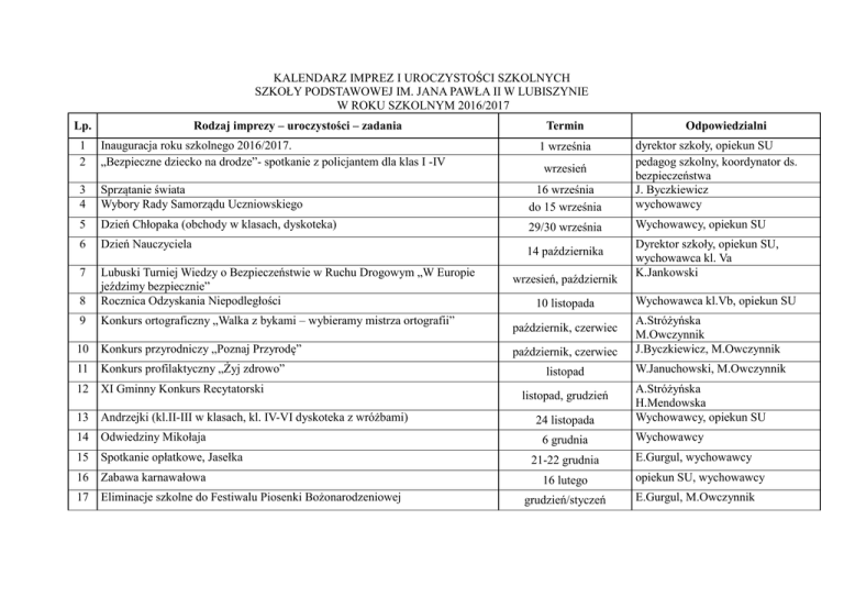 KALENDARZ IMPREZ I UROCZYSTOŚCI SZKOLNYCH SZKOŁY PODSTAWOWEJ IM. JANA PAWŁA II W LUBISZYNIE W ROKU SZKOLNYM 2016/2017 Lp. Rodzaj imprezy – uroczystości – zadania Termin Odpowiedzialni 1 2 Inauguracja roku szkolnego 2016/2017. „Bezpieczne dziecko na drodze”- spotkanie z policjantem dla klas I -IV 3 4 Sprzątanie świata Wybory Rady Samorządu Uczniowskiego 16 września do 15 września dyrektor szkoły, opiekun SU pedagog szkolny, koordynator ds. bezpieczeństwa J. Byczkiewicz wychowawcy 5 Dzień Chłopaka (obchody w klasach, dyskoteka) 29/30 września Wychowawcy, opiekun SU 6 Dzień Nauczyciela 7 8 Lubuski Turniej Wiedzy o Bezpieczeństwie w Ruchu Drogowym „W Europie jeździmy bezpiecznie” Rocznica Odzyskania Niepodległości 9 Konkurs ortograficzny „Walka z bykami – wybieramy mistrza ortografii” 10 Konkurs przyrodniczy „Poznaj Przyrodę” 11 Konkurs profilaktyczny „Żyj zdrowo” 12 XI Gminny Konkurs Recytatorski 13 Andrzejki (kl.II-III w klasach, kl. IV-VI dyskoteka z wróżbami) 14 Odwiedziny Mikołaja 15 Spotkanie opłatkowe, Jasełka 16 Zabawa karnawałowa 17 Eliminacje szkolne do Festiwalu Piosenki Bożonarodzeniowej 1 września wrzesień 14 października wrzesień, październik 10 listopada Dyrektor szkoły, opiekun SU, wychowawca kl. Va K.Jankowski Wychowawca kl.Vb, opiekun SU październik, czerwiec A.Stróżyńska M.Owczynnik J.Byczkiewicz, M.Owczynnik listopad W.Januchowski, M.Owczynnik październik, czerwiec listopad, grudzień 24 listopada 6 grudnia 21-22 grudnia 16 lutego grudzień/styczeń A.Stróżyńska H.Mendowska Wychowawcy, opiekun SU Wychowawcy E.Gurgul, wychowawcy opiekun SU, wychowawcy E.Gurgul, M.Owczynnik 18 Gminny Konkurs Profilaktyczny marzec A.Stróżyńska, H.Mendowska 19 Dzień Rodziny 8 marca Wychowawcy klas II i III 20 Powitanie wiosny 21 marca Wychowawcy 21 XII Konkurs Wiedzy o Gminie Lubiszyn 22 X Gminny Konkurs „Polska – Moja Ojczyzna” 23 Dzień Ziemi 21 kwietnia M.Owczynnik, koło polonistyczne 24 Święto Konstytucji 3 Maja 28 kwietnia Wychowawca kl. IV 25 Dzień Patrona Szkoły 26 Dzień Dziecka, Święto Sportu Szkolnego 27 Uroczyste zakończenie roku szkolnego 2016/2017 marzec kwiecień 18 maja 1 czerwca 23 czerwca J.Byczkiewicz, E.Gurgul W.Horbatowska, E.Gurgul Opiekun SU, E.Gurgul, wychowawca kl. VIa nauczyciele wych. fizycznego, wychowawcy dyrektor szkoły, opiekun SU, wychowawca kl. VIb