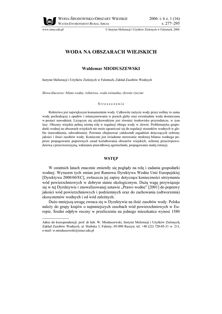 WODA-ŚRODOWISKO-OBSZARY WIEJSKIE WATER-ENVIRONMENT-RURAL AREAS www.imuz.edu.pl 2006: t. 6 z. 1 (16) s. 277–295 © Instytut Melioracji i Użytków Zielonych w Falentach, 2006 WODA NA OBSZARACH WIEJSKICH Waldemar MIODUSZEWSKI Instytut Melioracji i Użytków Zielonych w Falentach, Zakład Zasobów Wodnych Słowa kluczowe: bilans wodny, rolnictwo, woda wirtualna, zlewnie rzeczne Streszczenie Rolnictwo jest największym konsumentem wody. Całkowite zużycie wody przez rośliny to suma wody pochodzącej z opadów i retencjonowania w porach gleby oraz ewentualnie woda dostarczana w postaci nawodnień. Liczącym się użytkownikiem jest również środowisko przyrodnicze, w tym lasy. Obszary wiejskie pełnią istotną rolę w regulacji obiegu wody w zlewni. Problematyka gospodarki wodnej na obszarach wiejskich nie może ograniczać się do regulacji stosunków wodnych w glebie (nawodnienia, odwodnienia). Powinna obejmować całokształt zagadnień dotyczących ochrony jakości i ilości zasobów wody. Konieczne jest świadome sterowanie strukturą bilansu wodnego poprzez propagowanie poprawnych zasad kształtowania obszarów wiejskich, ochronę przeciwpowodziową i przeciwerozyjną, wdrażanie prawidłowej agrotechniki, propagowanie małej retencji. WSTĘP W ostatnich latach znacznie zmieniły się poglądy na rolę i zadania gospodarki wodnej. Wyrazem tych zmian jest Ramowa Dyrektywa Wodna Unii Europejskiej [Dyrektywa 2000/60/EC], zwłaszcza jej zapisy dotyczące konieczności utrzymania wód powierzchniowych w dobrym stanie ekologicznym. Dużą wagę przywiązuje się w tej Dyrektywie i znowelizowanej ustawie „Prawo wodne” [2001] do poprawy jakości wód powierzchniowych i podziemnych oraz do zachowania (odtworzenia) ekosystemów wodnych i od wód zależnych. Dużo mniejszą uwagę zwraca się w Dyrektywie na ilość zasobów wody. Polska należy do grupy krajów o najmniejszych zasobach wód powierzchniowych w Europie. Średni odpływ roczny w przeliczeniu na jednego mieszkańca wynosi 1580 Adres do korespondencji: prof. dr hab. W. Mioduszewski, Instytut Melioracji i Użytków Zielonych, Zakład Zasobów Wodnych, al. Hrabska 3, Falenty, 05-090 Raszyn; tel. +48 (22) 720-05-31 w. 211, e-mail: [email protected] 278 Woda-Środowisko-Obszary Wiejskie t. 6 z. 1 (16) m3·rok–1 [Stan…, 1996], podczas gdy w Europie ponad 4000 m3·rok–1. Wydaje się więc naturalne, że retencjonowanie wody i jej oszczędne wykorzystanie powinny być, obok ochrony jakości wód, priorytetowe w strategii rozwoju gospodarki wodnej w naszym kraju. Zasoby wody, rozumiane jako chwilowa objętość wód powierzchniowych i podziemnych, zmieniają się w przestrzeni i czasie, ale w dłuższym okresie i na większej przestrzeni ich ilość jest stała i wynika z uwarunkowań klimatycznych (ilość opadów atmosferycznych), budowy i użytkowania zlewni itp. Potencjalne zasoby wody w skali globalnej nie ulegają więc zmianie. Zwiększa się natomiast wyraźnie pobór wody przez takich użytkowników, jak: przemysł i gospodarka komunalna, leśnictwo, rolnictwo oraz środowisko przyrodnicze (np. odtwarzanie obszarów bagiennych – ekosystemów od wód zależnych – w wielu przypadkach wymaga doprowadzenia dodatkowej objętości wody na dany obszar). Największym użytkownikiem wody jest rolnictwo. Ocenia się, że na świecie ponad 70% wody pobieranej jest na potrzeby nawodnień. W Europie nie odgrywają one tak dużej roli, tym niemniej w krajach położonych na północy Europy nawadnia się 3–15% gruntów rolnych, a na południu ponad 30%. W Polsce nawadnia się nie więcej niż 1% użytków rolnych [Rocznik..., 2001]. Mówiąc o potrzebach wodnych roślin uprawnych, należy mieć na uwadze nie tylko wodę doprowadzaną w postaci sztucznych nawodnień. Znacznie większą część wody zużywanej przez rośliny stanowi bowiem woda pochodząca bezpośrednio z opadów atmosferycznych i gromadzona w glebie lub płytkich warstwach wodonośnych. Całkowite zużycie wody przez roślinność to suma ilości wody pochodzącej z opadów i retencjonowanej w porach glebowych oraz ewentualnie wody doprowadzanej w formie nawodnień. Tak rozumiane zużycie wody przez rośliny kilka, kilkanaście razy przewyższa pobór wody przez wszystkich pozostałych użytkowników. W literaturze światowej wodę pobieraną przez rośliny często określa się jako „wodę zieloną”, natomiast płynącą w rzekach – jako „wodę niebieską” [CHAPAGAIN, HOEKSTRA, 2004; RENAULT, 2002]. Na III Światowym Forum Wody w Kioto podkreślano, że największy kryzys, którego należy obawiać się w gospodarce wodnej w skali globalnej, może polegać na braku wystarczającej ilości wody do produkcji żywności dla ludności [MIODUSZEWSKI, 2003]. Wydaje się, że obawy te nie dotyczą Europy. Tym niemniej dostęp do wody może być w niedalekiej przyszłości barierą ograniczającą produkcję rolniczą w wielu krajach europejskich, w tym w Polsce. Możliwość wystąpienia braku wody do produkcji rolniczej nabiera większego prawdopodobieństwa, gdy weźmie się pod uwagę prognozowane globalne zmiany klimatu. Z drugiej natomiast strony postęp biologiczny w rolnictwie może w dużym stopniu ograniczyć potrzeby wodne roślin. Zwiększenie produkcji rolniczej nie musi odbywać się bowiem kosztem zwiększenia zużycia wody. Obszary wiejskie, w tym produkcja rolnicza, stanowią podstawowy element decydujący o strukturze bilansu wodnego. Dlatego też racjonalne gospodarowanie W. Mioduszewski: Woda na obszarach wiejskich 279 wodą na obszarach wiejskich, prawidłowe kształtowanie krajobrazu rolniczego czy stosowanie właściwych metod agrotechnicznych mogą decydować o możliwościach zaspokojenia potrzeb wodnych pozostałych użytkowników, w tym środowiska przyrodniczego [MIODUSZEWSKI, 1990]. Jednym z podstawowych elementów opracowywanych bilansów wodnych zlewni powinno być szczegółowe rozpoznanie rzeczywistych potrzeb wody niezb