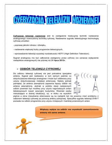 Cyfryzacja telewizji naziemnej jest to zastąpienie tradycyjnej techniki nadawania analogowego nowoczesną techniką cyfrową. Nadawanie sygnału telewizyjnego technologią cyfrową umożliwi: - poprawę jakości obrazu i dźwięku, - nadawanie większej liczby programów telewizyjnych, - wprowadzenie telewizji wysokiej rozdzielczości HDTV (High Definition Television). Sygnał analogowy ma być całkowicie zastąpiony przez cyfrowy (co oznacza wyłączenie nadajników analogowych) nie później niż 31 lipca 2013r. ODBIÓR TELEWIZJI CYFROWEJ Do odbioru telewizji cyfrowej nie jest potrzebna specjalna antena. Sygnał jest nadawany w tym samym paśmie co dotychczasowa telewizja analogowa i może być odbierany przy użyciu dotychczasowej instalacji antenowej. Należy jednak pamiętać, że antena zewnętrzna zapewnia lepszy odbiór niż antena wewnętrzna. Jednak w pobliżu stacji nadawczych odbiór powinien być możliwy przy użyciu najprostszych anten teleskopowych nawet wewnątrz budynków. Również osoby mieszkające w dobrej lokalizacji, np. w bloku na wysokim piętrze a okna mieszkania skierowane są na nadajnik też nie powinny mieć problemu z odbiorem telewizji cyfrowej za pomocą anteny pokojowej. Specyfika sygnału telewizji DVB-T pozwala na odbiór programów przy użyciu mniejszych i bardziej przenośnych anten. Większy wpływ na odbiór ma wysokość zamontowania anteny niż sama antena. Tabelka z zalecanymi antenami do odbioru w zależności od odległości. do 10 km 10-25 km 25-45 km pow. 45 km pokojowa TAK NIE NIE NIE siatkowa TAK TAK NIE NIE kierunkowa TAK TAK TAK NIE kierunkowa o dużym zysku NIE TAK TAK TAK Antena jednak to nie wszystko. Tradycyjne analogowe odbiorniki telewizyjne nie są zdolne do odbioru emisji cyfrowych. Dlatego odbiór emisji cyfrowych wiąże się z koniecznością zastosowania jednego z dwóch rozwiązań: 1) dołączenie do analogowego odbiornika telewizyjnego odpowiedniego urządzenia umożliwiającego odbiór sygnału cyfrowego (tj. urządzenia konsumenckiego służącego do odbioru cyfrowych transmisji telewizyjnych), zwanego set-top-boxem (STB) lub popularnie dekoderem DVB-T MPEG-4; odbiorcy nie będą więc zmuszeni do całkowitej wymiany posiadanego sprzętu odbiorczego, gdyż do odbioru telewizji cyfrowej może być wykorzystywany tradycyjny odbiornik telewizyjny wzbogacony o specjalny zewnętrzny dekoder, Uwaga na tanie dekodery, które mogą nie obsługiwać formatu HD. Kiedy w 2014r. telewizja publiczna będzie nadawała już tylko w formacie HD, wtedy takie dekodery staną się nieprzydatne. Dekodery kupimy już w cenie ok. 100,00 zł. Wersje bardziej rozbudowane (posiadające dodatkowe funkcje, np. nagrywanie programów, przeglądanie zdjęć) są droższe. Nie są one jednak niezbędne do odbioru telewizji cyfrowej. 2) wymiana analogowego odbiornika na cyfrowy, poprzez np. zakup w pełni zintegrowanego i zamkniętego pod względem funkcjonalnym cyfrowego odbiornika telewizyjnego (iDTV); ta opcja jest droższa od pierwszej gdyż wymaga wymiany posiadanego już sprzętu. Aby wybrać właściwy tuner należy sprawdzić wejście audio-video posiada nasz telewizor. jakie Możliwe wejścia: HDMI to złącze cyfrowe, a więc sygnał jest najwyższej jakości. Obsługuje obraz wysokiej rozdzielczości HD, oraz cyfrowy dźwięk. SCART (euro złącze) jest złączem analogowym. Przez to złącze przesyłany jest obraz i dźwięk w formie analogowej. RCA Chinch złącze składa się z jednego gniazda obrazu i złącz dźwięku - dwóch w przypadku stereo, jednego w przypadku mono. Component video złącze analogowego sygnału video. Umożliwia jednak przenoszenie obrazu wysokiej rozdzielczości HD w formie analogowej. Wystarczy, że podłączysz tuner do telewizora bez wbudowanego DVB-T MPEG-4 przez jedno z wybranych gniazd. WYŁĄCZENIA SYGNAŁU ANALOGOWEGO WOJEWÓDZTWIE ZACHODNIOPOMORSKIM TERMINY W Naziemna telewizja analogowa będzie wyłączana w 7 etapach. Zniknie zatem stopniowo na obszarze Polski obraz telewizyjny nadawany analogowo z masztów naziemnych. Z tych samych masztów jest już nadawany sygnał cyfrowy, który można odbierać za pomocą telewizorów z wbudowanym dekoderem DVB-T (MPEG-4) lub za pomocą telewizorów z dokupionym osobno dekoderem i podłączonym zewnętrznie do telewizora. W tabeli poniżej podane są terminy wyłączenia sygnału analogowego w województwie zachodniopomorskim. Nazwa miasta Wyłączenie sygnału analogowego w woj. Zachodniopomorskim (obszar wykorzystania częstotliwości) BIAŁOGARD 2013-05-20 KOSZALIN 2013-05-20 SZCZECIN 2013-03-19 ŚWINOUJŚCIE 2013-05-20 W dniu 7 listopada 2012r. nastąpiło pierwsze wyłączenie. Wyłączony został sygnał analogowy w Zielonej Górze i Żaganiu. Spowodowało to zamianę w systemie nadawania i odbioru w niektórych gminach naszego województwa. Dotyczy to gmin: Dębno, Myślibórz, Boleszkowice, Mieszkowice, Nowogródek Pomorski. Proces wyłączania naziemnej telewizji analogowej odnosi się bowiem do nadajników i może nie mieć dokładnego pokrycia z obszarem województwa. WSPARCIE DLA OSÓB STARSZYCH Zagadnienie cyfryzacji telewizji może nie być proste i jasne dla osób starszych. Zadbajmy zatem o osoby starsze w naszym otoczeniu, osoby z rodziny, znajomych, sąsiadów. Zapytajmy jaki rodzaj telewizora posiadają. Jeżeli jest to telewizor bez wbudowanego dekodera DVB-T MPEG-4- należy im pomóc w zakupie i instalacji dekodera. Przy okazji zwróćmy ich uwagę na nieuczciwych sprzedawców, akwizytorów, którzy chodzą po domach oferując do sprzedaży dekodery po zawyżonej cenie. Dekodery kupimy już w cenie ok. 100,00 zł. Wersje bardziej rozbudowane (posiadające dodatkowe funkcje, np. nagrywanie programów, przeglądanie zdjęć) będą droższe. Nie są one jednak niezbędne do odbioru telewizji cyfrowej. Jeżeli obecnie korzystasz z usług operatorów kablowych/satelitarnych i nie jesteś zainteresowany odbiorem programów telewizji naziemnej 