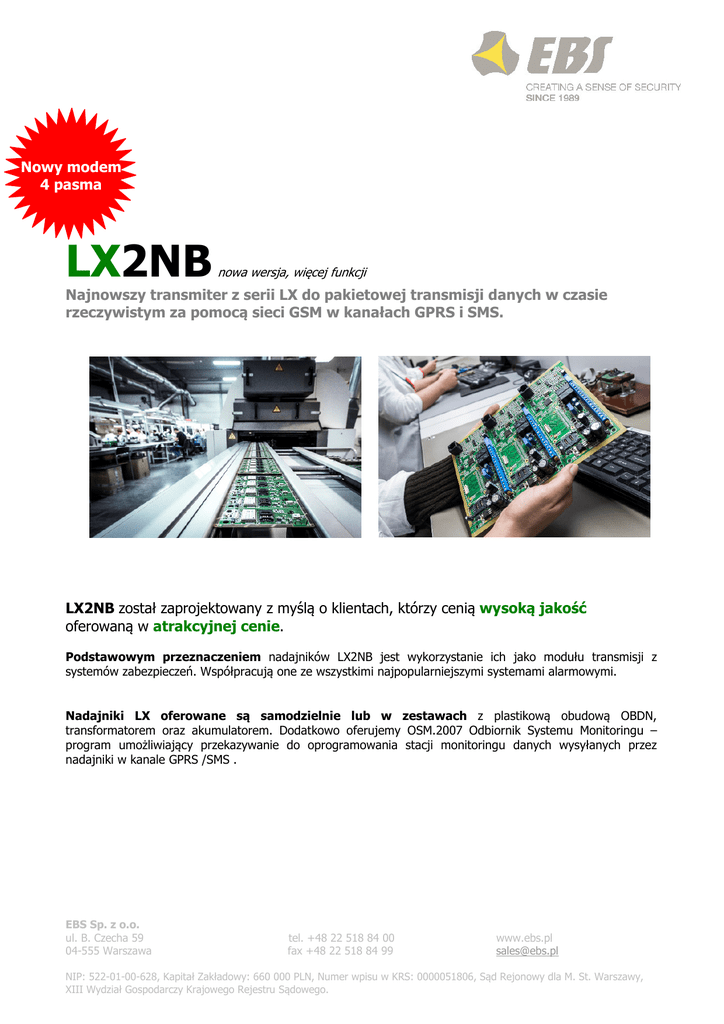 Nowy modem 4 pasma LX2NB nowa wersja, więcej funkcji Najnowszy transmiter z serii LX do pakietowej transmisji danych w czasie rzeczywistym za pomocą sieci GSM w kanałach GPRS i SMS. LX2NB został zaprojektowany z myślą o klientach, którzy cenią wysoką jakość oferowaną w atrakcyjnej cenie. Podstawowym przeznaczeniem nadajników LX2NB jest wykorzystanie ich jako modułu transmisji z systemów zabezpieczeń. Współpracują one ze wszystkimi najpopularniejszymi systemami alarmowymi. Nadajniki LX oferowane są samodzielnie lub w zestawach z plastikową obudową OBDN, transformatorem oraz akumulatorem. Dodatkowo oferujemy OSM.2007 Odbiornik Systemu Monitoringu – program umożliwiający przekazywanie do oprogramowania stacji monitoringu danych wysyłanych przez nadajniki w kanale GPRS /SMS . EBS Sp. z o.o. ul. B. Czecha 59 04-555 Warszawa tel. +48 22 518 84 00 fax +48 22 518 84 99 www.ebs.pl [email protected] NIP: 522-01-00-628, Kapitał Zakładowy: 660 000 PLN, Numer wpisu w KRS: 0000051806, Sąd Rejonowy dla M. St. Warszawy, XIII Wydział Gospodarczy Krajowego Rejestru Sądowego. PODSTAWOWE ZALETY URZĄDZENIA: KOMFORT OBSŁUGI I SZEROKA FUNKCJONALNOŚĆ Zdalna konfiguracja - łatwa i szybka rekonfiguracja urządzenia przez SMS, GPRS lub CSD Wejście telefoniczne w standardzie DTMF (ContactID, Ademco Express) - współpraca z centralami alarmowymi wyposażonymi w dialer umożliwiającą m.in. monitorowanie wejść/wyjść Wejścia parametryczne EOL/DEOL - Rozpoznawanie nie tylko stanu alarmu, ale również sabotażu czy uszkodzenia połączenia z urządzeniem podłączonym do wejścia Wysyłanie SMSów o dowolnej treści na 5 zdefiniowanych numerów telefonów komórkowych - natychmiastowe powiadamianie o wystąpieniu sytuacji alarmowych Historia zdarzeń systemowych - materiał dowodowy aż do 5000 zdarzeń pozwalający zdiagnozować przyczyny ewentualnych problemów Monitor stanu urządzenia - tryb diagnostyczny dla instalatora BEZPIECZEŃSTWO DANYCH Szyfrowanie przesyłanych danych za pomocą standardu AES - pełne bezpieczeństwo przesyłu informacji Autoryzacja SMSów konfiguracyjnych i sterujących - zabezpieczenie przed niepowołanym dostępem Kontrola połączenia GSM /GPRS - automatyczne odzyskiwanie połączenia ze stacją monitoringu Obsługa zapasowego serwera - zabezpieczenie transmisji w przypadku awarii serwera OSZCZĘDNŚĆ ENERGII I KOSZTÓW LX2NB-xR RADIOLINIA Kontrola ilości wysyłanych SMSów, retransmisja SMSów przychodzących - nadzór nad kosztami transmisji Sterowanie wyjść przez CLIP - Możliwość bezkosztowego wydawania komend na odległość FUNKCJONALNOŚĆ RADIOLINII Wbudowany odbiornik pilotów na 433.92MHz Obsługa dwóch kanałów Dwufunkcyjny pilot - sygnał z pilota umożliwia załączenia wyjścia lub aktywację funkcji PANIC Możliwość podłączenia zewnętrznej anteny w celu zwiększenia zasięgu działania Obsługa do 10 pilotów Obsługa pilotów z kodem zmiennym KeeLoq zabezpieczającym przed sabotażem EBS Sp. z o.o. ul. B. Czecha 59 04-555 Warszawa tel. +48 22 518 84 00 fax +48 22 518 84 99 www.ebs.pl [email protected] NIP: 522-01-00-628, Kapitał Zakładowy: 660 000 PLN, Numer wpisu w KRS: 0000051806, Sąd Rejonowy dla M. St. Warszawy, XIII Wydział Gospodarczy Krajowego Rejestru Sądowego. PARAMETRY NADAJNIKA LX2NB Kanały transmisji Wejścia GPRS, SMS 4 (NO/NC/EOL-NO/EOL-NC/DEOL-NO/DEOL-NC) Wejście telefoniczne w standardzie DTMF Protokoły obsługiwane przez wejście telefoniczne Wyjścia Funkcje wyjść (sposoby sterowania) TAK ContactID, Ademco Fast, DTMF 1 (OC, obciążalność max. 100Ma) - brak sygnału GSM - wykrycie zagłuszania GSM (tylko dla ublox LEON-G100) - z poziomu serwera lub poprzez SMS - przychodzący CLIP - w reakcji na aktywację wybranych wejść TAK, wbudowany odbiornik pilotów na 433.92MHz BRAK Radiolinia* Interfejs szeregowy Wielkość bufora zdarzeń alarmowych Ilość zdarzeń systemowych przechowywana w historii Znacznik czasu wystąpienia zdarzenia 5000 Zabezpieczenie transmisji GPRS/SMS do serwera Interfejs użytkownika szyfrowanie AES 2 diody LED (status połączenia, stan urządzenia, komunikacja DTMF) Konfiguracja Zdalna aktualizacja firmware Zdalny dostęp do central alarmowych Obsługiwane modemy Zdalna: GPRS, SMS, CSD Lokalna: z PC poprzez łącze RS232 (wymagany przewód: GD-PROG) TAK NIE - Cinterion BGS2-W (4-band) Parametry zasilania - PCB (bez obudowy) Napięcie zasilające 13,8VDC (dopuszczalne: 12-14VDC) Pobór prądu (średni / maksymalny) 75mA/350mA@13,8VDC Parametry zasilania - PCB w obudowie Napięcie zasilające 230VAC (dopuszczalne: 190-250VAC) Pobór mocy (średni / maksymalny) 3W/20W@230VAC TAK (data, godzina z dokładnością do 0,01s) Funkcje układu zasilającego W wersji: PCB w obudowie - tryb szybkiego ładowania akumulatora - zabezpieczenie przed nadmiernym rozładowaniem akumulatora - zabezpieczenie przed odwrotnym podłączeniem akumulatora - sygnalizacja zaniku zasilania sieciowego - sygnalizacja braku/niskiego stanu naładowania akumulatora - zabezpieczenie przed zwarciem wyjścia akumulatorowego - bezobsługowy bezpiecznik Możliwość podłączenia akumulatora TAK (w wersji: PCB w obudowie), kwasowo-ołowiowy 12V Prąd ładowania akumulatora PCB w obudowie: max 200mA lub max 1A Próg sygnalizowania zbyt niskiego zasilania sieciowego (za transformatorem / przed transformatorem) Próg sygnalizowania zbyt niskiego napięcia akumulatora Napięcie odłączenia akumulatora (zabezpieczenie przed nadmiernym rozładowaniem) 13.5VAC / 160VAC (w wersji: PCB w obudowie) Wymiary PCB: 102 x 73 x 35mm PCB w obudowie: 265 x 255 x 85mm 11VDC (w wersji: PCB w obudowie) 9,5VDC (w wersji: PCB w obudowie) * Tylko w wersji LX2NB-xR z radiolinią EBS Sp. z o.o. ul. B. Czecha 59 04-555 Warszawa tel. +48 22 518 84 00 fax +48 22 518 84 99 www.ebs.pl [email protected] NIP: 522-01-00-628, Kapitał Zakładowy: 660 000 PLN, Numer wpisu w KRS: 0000051806, Sąd Rejonowy dla M. St. Warszawy, XIII Wy