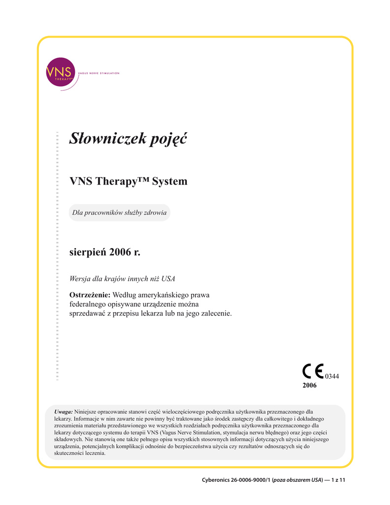 Słowniczek pojęć VNS Therapy™ System Dla pracowników służby zdrowia sierpień 2006 r. Wersja dla krajów innych niż USA Ostrzeżenie: Według amerykańskiego prawa federalnego opisywane urządzenie można sprzedawać z przepisu lekarza lub na jego zalecenie. Uwaga: Niniejsze opracowanie stanowi część wieloczęściowego podręcznika użytkownika przeznaczonego dla lekarzy. Informacje w nim zawarte nie powinny być traktowane jako środek zastępczy dla całkowitego i dokładnego zrozumienia materiału przedstawionego we wszystkich rozdziałach podręcznika użytkownika przeznaczonego dla lekarzy dotyczącego systemu do terapii VNS (Vagus Nerve Stimulation, stymulacja nerwu błędnego) oraz jego części składowych. Nie stanowią one także pełnego opisu wszystkich stosownych informacji dotyczących użycia niniejszego urządzenia, potencjalnych komplikacji odnośnie do bezpieczeństwa użycia czy rezultatów odnoszących się do skuteczności leczenia. Cyberonics 26-0006-9000/1 (poza obszarem USA) — 1 z 11 Słowniczek pojęć 26-0006-9000/1 © Copyright 2006, 2007 Cyberonics, Inc., Houston, Teksas Wszelkie prawa zastrzeżone. Cyberonics® oraz NCP® są zarejestrowanymi znakami handlowymi firmy Cyberonics, Inc. „VNS”, „VNS Therapy”, „Demipulse”, „Demipulse Duo”, i „Perennia” są zarejestrowanymi znakami handlowymi Cyberonics, Inc. Układ generatora impulsów VNS Therapy™ Pulse Generator (łącznie z jego częściami składowymi) oraz zastosowanie opisywanego układu do leczenia epilepsji i/lub depresji jest chronione przez jeden lub większą liczbę amerykańskich patentów o numerach 4,867,164, 4,979,511, 5,154,172, 5,179,950, 5,186,170, 5,222,494, 5,235,980 i 5,299,569, jak również przez patenty międzynarodowe odpowiadające wymienionym powyżej. Pozostałe patenty są w trakcie opracowywania. 2 z 11 – Cyberonics 26-0006-9000/1 (poza obszarem USA) Słowniczek pojęć ACLS Zaawansowane czynności podtrzymujące życie. AE (ang. adverse event) Zdarzenie niepożądane - jakikolwiek objaw, oznaka, choroba lub dolegliwość pojawiająca się lub występująca ze zwiększonym stopniem nasilenia i/lub częstotliwością w trakcie badania lub procedury (np. jakiekolwiek zmiany w stosunku do stanu na początku badania). AED Lek(i ) przeciwpadaczkowy(e). ARR Wskaźnik oporności na leki przeciwdepresyjne. okresy wstępne badania (depresja) D-02, faza ostra – dwie wizyty przedimplantacyjne (wizyta B1 i B2) dla obydwu grup, D-02, faza długoterminowa – okres służący ocenie skuteczności, następujący tuż przed rozpoczęciem leczenia VNS Therapy; w trakcie fazy długoterminowej okres wstępny badania dla pacjentów przypisanych do grupy leczonej w ostrej fazie badania różnił się od tego dotyczącego pacjentów przypisanych do grupy kontrolnej, poddanej jedynie leczeniu pozorowanemu; ze względu na to, że opisywany okres wstępny badania miał miejsce przed rozpoczęciem leczenia w obydwu grupach, można go porównać z analizą, grupa poddana leczeniu – w trakcie fazy długoterminowej; okres wstępny badania dla pacjentów przypisanych do grupy poddanej leczeniu w fazie ostrej był okresem przedimplantacyjnym (B1 i B2), grupa poddana leczeniu z opóźnieniem (grupa kontrolna z fazy ostrej badania poddana leczeniu pozorowanemu) – podczas fazy długoterminowej okres wstępny badania dla pacjentów przypisanych do grupy kontrolnej poddanej leczeniu pozorowanemu w fazie ostrej badania stanowiły dwie wizyty w fazie ostrej – V8 i V9 (zakończenie fazy ostrej badania), D-04 – wizyta, która odbyła się po otrzymaniu formularza świadomej zgody pacjenta. BOL Początek życia. Cyberonics 26-0006-9000/1 (poza obszarem USA) — 3 z 11 Słowniczek pojęć Skala CGI (ang. Clinical Global Impressions) (depresja) Dwie 7-punktowe skale uzupełnione narzędziem do oceny klinicznej stanu pacjenta pod względem stopnia nasilenia choroby (CGI-S) oraz poprawy ogólnej (CGI-I); skala stopnia nasilenia ma zakres od 1 – „prawidłowy, w ogóle nie jest chory” do 7 – „pośród najbardziej chorych pacjentów”; skala poprawy ma zakres od 1 – „bardzo znacząca poprawa” do 7 – „bardzo znaczące pogorszenie”. Uwaga: Skala CGI została opracowana przez NIMH, aby zapewnić wystandaryzowaną ocenę z relewantnymi klinicznie punktami zaczepienia; jest to jedno z najszerzej stosowanych krótkich narzędzi oceny w psychiatrii. depresja przewlekła lub nawracająca Obecny poważny epizod depresyjny trwający co najmniej dwa lata lub aktualny poważny epizod depresyjny u pacjenta z wywiadem wielokrotnych epizodów depresji. korzyść kliniczna (depresja) Stopień poprawy depresji mierzony wg skali HRSD24. nadzwyczajna korzyść kliniczna – co najmniej 75% zmniejszenie objawów w porównaniu z okresem wstępnym badania, bardzo znacząca korzyść kliniczna – co najmniej 50%, ale mniejsze niż 75% zmniejszenie objawów w porównaniu z okresem wstępnym badania, znacząca korzyść kliniczna - co najmniej 25%, ale mniejsze niż 50% zmniejszenie objawów w porównaniu z okresem wstępnym badania, minimalna korzyść kliniczna lub jej brak – brak lub mniejsze niż 25% zmniejszenie objawów w porównaniu z okresem wstępnym badania, pogorszenie – wzrost wartości wyniku uzyskanego wg skali HRSD24 w porównaniu z okresem początkowym badania. odpowiedź całkowita (osoba w pełni odpowiadająca na leczenie lub w pełni spełniająca kryteria remisji) (depresja) Osoby, które uzyskały mniejszy niż wcześniej określony wynik, w pełni odpowiedziały na leczenie; wyniki przedstawiające pełną odpowiedź na leczenie to bezwzględna liczba 9 lub mniej punktów wg skali HRSD24, bezwzględna liczba 10 lub mniej punktów wg skali MADRS lub bezwzględna liczba 14 lub mniej punktów wg skali IDS-SR; odpowiada to koncepcji remisji, w której choroba, w tym przypadku depresja, charakteryzuje się niewielką lub szczątkową liczbą występujących objaw