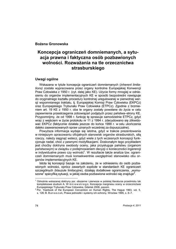 B. Gronowska BoŜena Gronowska Koncepcja ograniczeń domniemanych, a sytuacja prawna i faktyczna osób pozbawionych wolności. RozwaŜania na tle orzecznictwa strasburskiego Uwagi ogólne Wskazana w tytule koncepcja ograniczeń domniemanych (inherent limitations) została wypracowana przez organy kontrolne Europejskiej Konwencji Praw Człowieka z 1950 r. (cyt. dalej jako KE). UŜycie formy mnogiej w odniesieniu do organów implementacyjnych KE w sposób bezpośredni nawiązuje do oryginalnego kształtu procedury kontrolnej uregulowanej w pierwotnej wersji wspomnianego traktatu, tj. Europejskiej Komisji Praw Człowieka (EKPCz) oraz Europejskiego Trybunału Praw Człowieka (ETPCz). Zgodnie z brzmieniem art. 19 KE z 1950 r. oba te organy zostały powołane do Ŝycia w celu zapewnienia przestrzegania zobowiązań podjętych przez państwa–strony KE. Przypomnijmy, Ŝe od 1998 r. funkcję tę sprawuje samodzielnie ETPCz, gdyŜ wraz z wejściem w Ŝycie protokołu nr 11 z 1994 r. zdecydowano się zlikwidować EKPCz (faktycznie działała jeszcze do końca 1999 r. w celu ukończenia daleko zaawansowanych spraw uznanych wcześniej za dopuszczalne). PowyŜsza informacja wydaje się istotna, gdyŜ w trakcie prezentowania w niniejszym opracowaniu oficjalnych stanowisk organów strasburskich, siłą rzeczy, naleŜy sięgnąć wstecz, gdyŜ wiele z tych wczesnych koncepcji funkcjonuje nadal, choć z pewnymi modyfikacjami. Doskonałym tego przykładem jest choćby doktryna swobody oceny, jaka przysługuje państwu (organom państwowym) w związku z podejmowaniem decyzji o konieczności ingerencji w indywidualne prawo czy wolność1. W rezultacie takŜe analiza tzw. ograniczeń domniemanych musi konsekwentnie uwzględniać stanowisko obu organów implementacyjnych KE. Istota tej koncepcji bazuje na załoŜeniu, Ŝe w odniesieniu do osób pozbawionych wolności, oprócz zawartych explicite w standardach KE ograniczeń szczególnych (klauzule limitacyjne), działają dodatkowe ograniczenia, „wymuszone” specyfiką sytuacji, w jakiej osoba pozbawiona wolności się znajduje2. 1 2 Odnośnie wskazanej doktryny por. obszerne i pierwsze w polskiej literaturze przedmiotu tak kompleksowe studium A. W i ś n i e w s k i e g o, Koncepcja marginesu oceny w orzecznictwie Europejskiego Trybunału Praw Człowieka, Gdańsk 2008, passim. Por. Yearbook of the European Convention on Human Rights, The Hague 1963, vol. 5, s. 126; B. B a n a s z a k, Prawa jednostki i systemy ich ochrony, Wrocław 1995, s. 6–7. 74 Probacja 4, 2011 Koncepcja ograniczeń domniemanych, a sytuacja prawna i faktyczna... Pomysł na ograniczenia domniemane zawdzięczamy EKPCz, która wcześniej od Trybunału miała okazję zetknąć się z licznymi skargami pochodzącymi od osób pozbawionych wolności (tymczasowo aresztowanych oraz skazanych). W skargach tych – oprócz klasycznych zarzutów pod adresem krajowych władz penitencjarnych, np. na sposób traktowania, na warunki sanitarno-bytowe czy bardziej generalnie na poziom oferowanej w instytucji penitencjarnej pomocy terapeutyczno-medycznej – zaczęły się stopniowo pojawiać skargi o zupełnie innym zabarwieniu. Ich wspólnym mianownikiem był fakt, Ŝe wszystkie one dotyczyły zarzutu niemoŜności skorzystania przez konkretnego więźnia z przysługujących mu z mocy prawa typowych praw cywilnych, politycznych czy takŜe socjalnych3. NaleŜy w tym miejscu raz jeszcze przypomnieć, Ŝe zgodnie z tradycją współczesnych systemów wymiaru sprawiedliwości w sprawach karnych więzień traci tylko tyle praw, ilu oficjalnie pozbawiono go prawomocnym wyrokiem. W sposób najprostszy koncepcję ograniczeń domniemanych moŜna wyjaśnić następująco. Po pierwsze, w tekście KE występują liczne standardy, które zawierają własne klauzule limitacyjne, a dodatkowo mogą być one uzupełnione o ograniczenie ogólne, jakim jest derogacja w rozumieniu art. 15 KE. Podane przykłady ograniczeń mają jednoznaczną podstawę i formę prawną, która z duŜym prawdopodobieństwem zakłada umoŜliwienie dokonywania precyzyjnych ocen stosowanych przez państwo ograniczeń, czy to indywidualnych, czy teŜ o charakterze ogólnym. Warto w tym miejscu przypomnieć, Ŝe tradycyjne reguły limitacyjne formułują trzy „Ŝelazne” reguły, które muszą być łącznie spełnione w kaŜdym przypadku dokonania ograniczenia prawa jednostki (legalność, celowość i proporcjonalność)4. NaleŜy wskazać na to, Ŝe EKPCz w swoim podejściu do ograniczeń domniemanych nie była osamotniona5. Dołączył do niej ETPCz oraz Komitet Ministrów Rady Europy. To on właśnie sformułował w 1962 r. pogląd6, „Ŝe sam fakt pozbawienia wolności nie moŜe wpływać na posiadanie przez więźnia praw (…), jedynie ich realizacja moŜe być ograniczona, jeŜeli byłoby to niezgodne z celem pozbawienia wolności lub kolidowało z utrzymaniem porządku i bezpieczeństwa danego zakładu”. Z całą pewnością trudno byłoby polemizować z tak sformułowaną tezą, choć warto nieco bliŜej przyjrzeć się jej treści. W myśl powołanego dokumentu, więźniowie pozostają podmiotami praw i wolności, których nie po3 P. v a n D i j k, G. J. H. v a n H o o f, Theory and Practice of the European Convention on Human Rights, Deventer–Boston 1990, s. 230–231. 4 R. M i z e r s k i, Test legalności w systemie Europejskiej Konwencji Praw Człowieka, Warszawa 2009, s. 95–108. 5 A. R e y n a u d, Human Rights in Prisons, Strasbourg 1983, s. 199–202. 6 Resolution (62)2 of the Committee of Ministers of the Council of Europe on electoral, civil and social rights – Recommendation 195, adopted in 1962. Probacja 4, 2011 75 B. Gronowska zbawiono ich na mocy wyroku. Rzecz jednak w tym, Ŝe prawo na papierze powinno działać bez zakłóceń w praktyce, a z tym aspektem zagadnienia sprawa przedstawia się zupełnie inaczej. OtóŜ, np. wystąpienie enigmatycznej kategorii „bezpieczeństwa danego zakładu”, a w tym