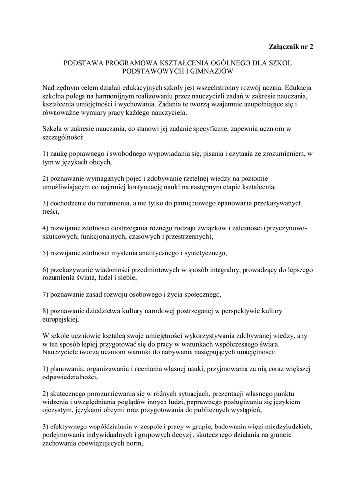 Załącznik nr 2 PODSTAWA PROGRAMOWA KSZTAŁCENIA OGÓLNEGO DLA SZKOL PODSTAWOWYCH I GIMNAZJÓW Nadrzędnym celem działań edukacyjnych szkoły jest wszechstronny rozwój ucznia. Edukacja szkolna polega na harmonijnym realizowaniu przez nauczycieli zadań w zakresie nauczania, kształcenia umiejętności i wychowania. Zadania te tworzą wzajemnie uzupełniające się i równoważne wymiary pracy każdego nauczyciela. Szkoła w zakresie nauczania, co stanowi jej zadanie specyficzne, zapewnia uczniom w szczególności: 1) naukę poprawnego i swobodnego wypowiadania się, pisania i czytania ze zrozumieniem, w tym w językach obcych, 2) poznawanie wymaganych pojęć i zdobywanie rzetelnej wiedzy na poziomie umożliwiającym co najmniej kontynuację nauki na następnym etapie kształcenia, 3) dochodzenie do rozumienia, a nie tylko do pamięciowego opanowania przekazywanych treści, 4) rozwijanie zdolności dostrzegania różnego rodzaju związków i zależności (przyczynowoskutkowych, funkcjonalnych, czasowych i przestrzennych), 5) rozwijanie zdolności myślenia analitycznego i syntetycznego, 6) przekazywanie wiadomości przedmiotowych w sposób integralny, prowadzący do lepszego rozumienia świata, ludzi i siebie, 7) poznawanie zasad rozwoju osobowego i życia społecznego, 8) poznawanie dziedzictwa kultury narodowej postrzeganej w perspektywie kultury europejskiej. W szkole uczniowie kształcą swoje umiejętności wykorzystywania zdobywanej wiedzy, aby w ten sposób lepiej przygotować się do pracy w warunkach współczesnego świata. Nauczyciele tworzą uczniom warunki do nabywania następujących umiejętności: 1) planowania, organizowania i oceniania własnej nauki, przyjmowania za nią coraz większej odpowiedzialności, 2) skutecznego porozumiewania się w różnych sytuacjach, prezentacji własnego punktu widzenia i uwzględniania poglądów innych ludzi, poprawnego posługiwania się językiem ojczystym, językami obcymi oraz przygotowania do publicznych wystąpień, 3) efektywnego współdziałania w zespole i pracy w grupie, budowania więzi międzyludzkich, podejmowania indywidualnych i grupowych decyzji, skutecznego działania na gruncie zachowania obowiązujących norm, 4) rozwiązywania problemów w sposób twórczy, 5) poszukiwania, porządkowania i wykorzystywania informacji z różnych źródeł oraz efektywnego posługiwania się technologią informacyjną, 6) odnoszenia do praktyki zdobytej wiedzy oraz tworzenia potrzebnych doświadczeń i nawyków, 7) rozwijania sprawności umysłowych oraz osobistych zainteresowań, 8) przyswajania sobie metod i technik negocjacyjnego rozwiązywania konfliktów i problemów społecznych. Nauczyciele w pracy wychowawczej, wspierając w tym zakresie obowiązki rodziców, zmierzają do tego, aby uczniowie w szczególności: 1) znajdowali w szkole środowisko wszechstronnego rozwoju osobowego (w wymiarze intelektualnym, psychicznym, społecznym, zdrowotnym, estetycznym, moralnym, duchowym), 2) rozwijali w sobie dociekliwość poznawczą, ukierunkowaną na poszukiwanie prawdy, dobra i piękna w świecie, 3) mieli świadomość życiowej użyteczności zarówno poszczególnych przedmiotów nauczania, jak i całej edukacji na danym etapie, 4) stawali się coraz bardziej samodzielni w dążeniu do dobra w jego wymiarze indywidualnym i społecznym, godząc dążenie do dobra własnego z dobrem innych, odpowiedzialność za siebie z odpowiedzialnością za innych, wolność własną z wolnością innych, 5) poszukiwali, odkrywali i dążyli na drodze rzetelnej pracy do osiągnięcia celów życiowych i wartości ważnych dla odnalezienia własnego miejsca w świecie, 6) uczyli się szacunku dla dobra wspólnego jako podstawy życia społecznego oraz przygotowywali się do życia w rodzinie, w społeczności lokalnej i w państwie, 7) przygotowywali się do rozpoznawania wartości moralnych, dokonywania wyborów i hierarchizacji wartości oraz mieli możliwość doskonalenia się, 8) kształtowali w sobie postawę dialogu, umiejętność słuchania innych i rozumienia ich poglądów; umieli współdziałać i współtworzyć w szkole wspólnotę nauczycieli i uczniów. Nauczyciele, mając na uwadze osobowy rozwój ucznia, współdziałają na rzecz tworzenia w świadomości uczniów zintegrowanego systemu wiedzy, umiejętności i postaw. Ma to szczególne zastosowanie w kształceniu zintegrowanym. Integracji wiedzy nauczanej w szkole na różnych etapach kształcenia służy wprowadzenie kształcenia zintegrowanego w klasach I—III szkoły podstawowej oraz ścieżek edukacyjnych. Działalność edukacyjna szkoły jest określona przez: 1) szkolny zestaw programów nauczania, który uwzględniając wymiar wychowawczy, obejmuje całą działalność szkoły z punktu widzenia dydaktycznego, 2) program wychowawczy szkoły, obejmujący wszystkie treści i działania o charakterze wychowawczym skierowane do uczniów, realizowany przez nauczycieli, 3) program profilaktyki dostosowany do potrzeb rozwojowych uczniów oraz potrzeb danego środowiska, obejmujący wszystkie treści i działania o charakterze profilaktycznym skierowane do uczniów, nauczycieli i rodziców. Szkolny zestaw programów nauczania, program wychowawczy szkoły oraz program profilaktyki tworzą spójną całość. Ich przygotowanie i realizacja są zadaniem zarówno całej szkoły, jak i każdego nauczyciela. Obok zadań wychowawczych i profilaktycznych nauczyciele wykonują również działania opiekuńcze odpowiednio do istniejących potrzeb. Konieczne jest podejmowanie przez nauczycieli działań mających na celu wyrównywanie szans edukacyjnych uczniów. Edukacja szkolna przebiega w następujących etapach edukacyjnych dostosowanych do okresów rozwojowych dziecka: 1) etap I — klasy I—III szkoły podstawowej, 2) etap II — klasy IV—VI szkoły podstawowej, 3) etap III — gimnazjum. Ilekroć w załączniku jest mowa o: 1) zajęciach edukacyjnych — należy przez to 