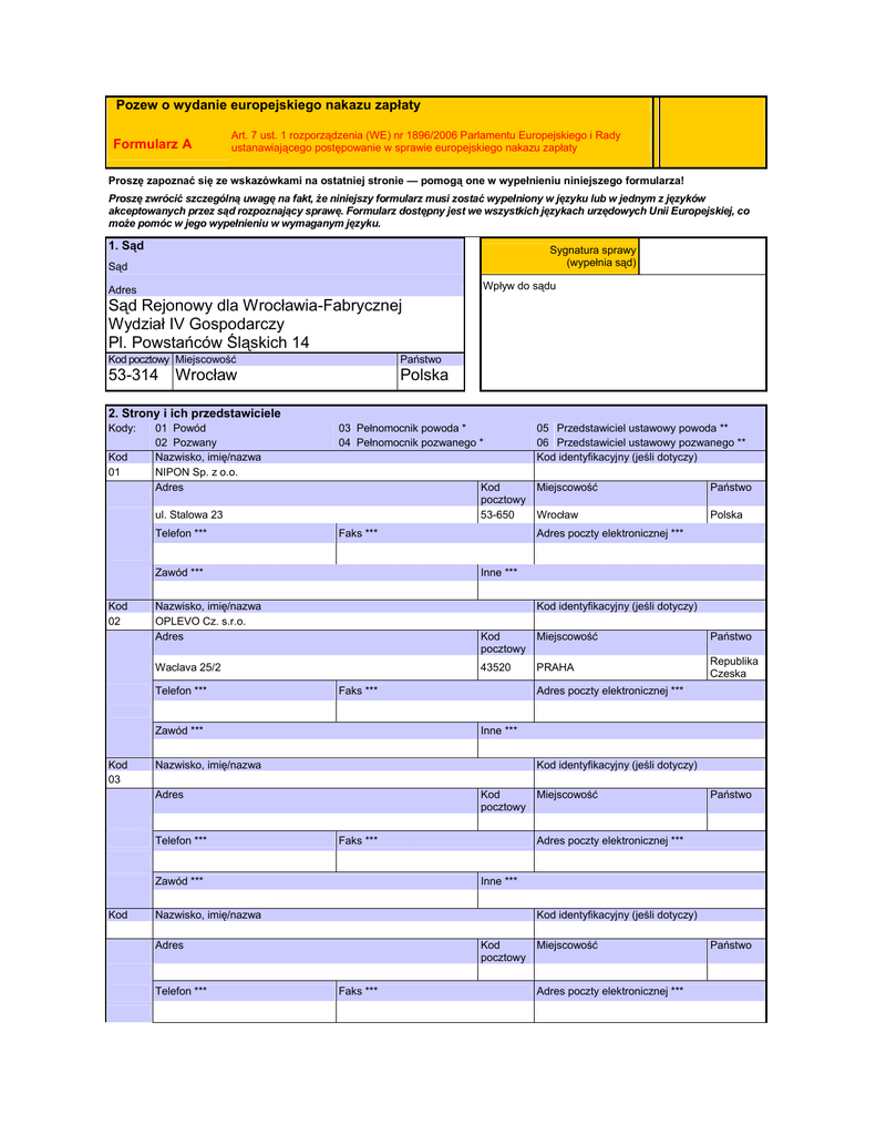 Pozew o wydanie europejskiego nakazu zapłaty Formularz A Art. 7 ust. 1 rozporządzenia (WE) nr 1896/2006 Parlamentu Europejskiego i Rady ustanawiającego postępowanie w sprawie europejskiego nakazu zapłaty Proszę zapoznać się ze wskazówkami na ostatniej stronie — pomogą one w wypełnieniu niniejszego formularza! Proszę zwrócić szczególną uwagę na fakt, że niniejszy formularz musi zostać wypełniony w języku lub w jednym z języków akceptowanych przez sąd rozpoznający sprawę. Formularz dostępny jest we wszystkich językach urzędowych Unii Europejskiej, co może pomóc w jego wypełnieniu w wymaganym języku. 1. Sąd Sygnatura sprawy (wypełnia sąd) Sąd Wpływ do sądu Adres Sąd Rejonowy dla Wrocławia-Fabrycznej Wydział IV Gospodarczy Pl. Powstańców Śląskich 14 Kod pocztowy Miejscowość Państwo 53-314 Polska Wrocław 2. Strony i ich przedstawiciele Kody: Kod 01 01 Powód 02 Pozwany Nazwisko, imię/nazwa NIPON Sp. z o.o. Adres 03 Pełnomocnik powoda * 04 Pełnomocnik pozwanego * Kod pocztowy 53-650 ul. Stalowa 23 Telefon *** Faks *** Zawód *** Kod 02 Kod pocztowy Miejscowość Państwo 43520 PRAHA Republika Czeska Adres poczty elektronicznej *** Nazwisko, imię/nazwa Kod identyfikacyjny (jeśli dotyczy) Kod pocztowy Faks *** Zawód *** Miejscowość Państwo Adres poczty elektronicznej *** Inne *** Nazwisko, imię/nazwa Kod identyfikacyjny (jeśli dotyczy) Adres Telefon *** Polska Inne *** Adres Kod Wrocław Adres poczty elektronicznej *** Faks *** Zawód *** Telefon *** Państwo Kod identyfikacyjny (jeśli dotyczy) Waclava 25/2 Kod 03 Miejscowość Inne *** Nazwisko, imię/nazwa OPLEVO Cz. s.r.o. Adres Telefon *** 05 Przedstawiciel ustawowy powoda ** 06 Przedstawiciel ustawowy pozwanego ** Kod identyfikacyjny (jeśli dotyczy) Kod pocztowy Faks *** Miejscowość Adres poczty elektronicznej *** Państwo Zawód *** * np. prawnik Inne *** ** np. rodzic, opiekun, członek zarządu *** nieobowiązkowe 3. Okoliczności uzasadniające właściwość sądu Kody: Kod 02 01 Miejsce zamieszkania/siedziba pozwanego lub współpozwanego 02 Miejsce wykonania rozpatrywanego zobowiązania 03 Miejsce wyrządzenia szkody 04 Jeżeli spór wynika z działalności filii, oddziału lub innej jednostki/siedziba filii, oddziału lub innej jednostki 05 Siedziba trustu 06 Jeżeli przyczyną sporu jest wynagrodzenie z tytułu uratowania ładunku lub frachtu — siedziba sądu, którego postanowieniem ładunek lub fracht został lub mógł zostać zatrzymany Proszę określić — wyłącznie dla kodu 14 07 Miejsce zamieszkania lub siedziba posiadacza polisy, ubezpieczonego lub beneficjenta ubezpieczenia 08 Miejsce zamieszkania lub siedziba konsumenta 09 Miejsce wykonywania pracy przez pracownika 10 Miejsce położenia zakładu, w którym zatrudniony jest dany pracownik 11 Położenie nieruchomości 12 Siedziba sądu zgodnie wybranego przez strony 13 Miejsce zamieszkania wierzyciela alimentacyjnego 14 Inne (proszę określić) 4. Transgraniczny charakter sprawy Kody: 01 Belgia 02 Republika Czeska 03 Niemcy 04 Estonia 05 Grecja Siedziba albo miejsce zamieszkania lub zwykłego pobytu powoda 18 06 Hiszpania 11 Łotwa 07 Francja 12 Litwa 08 Irlandia 13 Luksemburg 09 Włochy 14 Węgry 10 Cypr 15 Malta Siedziba albo miejsce zamieszkania lub zwykłego pobytu pozwanego 02 16 Niderlandy 21 Słowacja 17 Austria 22 Finlandia 18 Polska 23 Szwecja 19 Portugalia 24 Zjednoczone Królestwo 20 Słowenia 25 Inne (proszę określić) Państwo, w którym znajduje się siedziba sądu 18 5. Informacje dotyczące rachunku bankowego (nieobowiązkowe) 5.1 Uiszczenie opłat sądowych przez powoda Kody: 01 Przelew 02 Płatność kartą kredytową 04 Pomoc prawna 05 Inne (proszę określić) 03 Pobranie przez sąd z rachunku bankowego powoda W przypadku kodu 02 i 03 proszę wypełnić załącznik I Kod Proszę określić — w przypadku kodu 05 01 5.2 Płatność zasądzonej kwoty przez pozwanego Właściciel rachunku Nazwa banku (BIC) lub inny odpowiedni kod bankowy NIPON Sp. z o.o. INGB-PL-PW Numer rachunku Międzynarodowy numer rachunku bankowego (IBAN) 02 1050 0043 1000 0322 4370 9526 PL 02 1050 0043 1000 0322 4370 9526 EUR HUF SEK euro ungarischer Forint korona szwedzka CYP LTL SIT funt cypryjski lit litewski tolar słoweński CZK LVL SKK 6. Roszczenie główne korona czeska łat łotewski korona słowacka Waluta EUR Roszczenie odnosi się do (kod 1) 01 Umowy sprzedaży 02 Umowy najmu/dzierżawy ruchomości 03 Umowy najmu/dzierżawy nieruchomości 04 Umowy najmu lokalu użytkowego 05 Umowy o świadczenie usług — dostawy energii elektrycznej, gazu, wody, usług telekomunikacyjnych 06 Umowy o świadczenie usług — usługi medyczne 07 Umowy o świadczenie usług — transport 08 Umowy o świadczenie usług — doradztwo prawne, podatkowe i techniczne 09 Umowy o świadczenie usług — hotelarstwo, gastronomia EEK korona estońska GBP funt brytyjski MTL lir maltański PLN złoty polski Inna (zgodnie z międzynarodowym kodem bankowym) Kwota całkowita roszczenia głównego, bez odsetek i kosztów 9500 10 Umowy o świadczenie usług — naprawy 11 Umowy o świadczenie usług — usługi pośrednictwa 12 Umowy o świadczenie usług — inne (proszę określić) 13 Umowy o wykonanie robót budowlanych 14 Umowy ubezpieczenia 15 Umowy pożyczki/kredytu 16 Gwarancji lub innego zabezpieczenia (zabezpieczeń) 17 Roszczenia wynikające ze zobowiązań pozaumownych, jeżeli są przedmiotem umowy między stronami lub uznania długu (np. odszkodowanie, bezpodstawne wzbogacenie) 18 Roszczeń związanych ze współwłasnością 19 Odszkodowania wynikającego z umowy 20 Umowy o prenumeracie (gazety, czasopisma) 21 Opłaty członkowskiej 22 Umowy o pracę 23 Ugody pozasądowej 24 Zobowiązania alimentacyjnego 25 Inne (proszę określić) Powołane okoliczności (kod 2) 30 Brak płatności 31 Płatność niepełna 32 Płatność po terminie 33 Niedostarczenie towarów lub usług 35 Niezgodność towarów lub usług z 34 