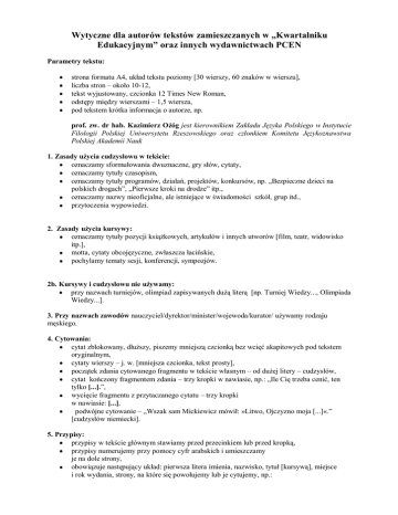 Wytyczne dla autorów tekstów zamieszczanych w „Kwartalniku Edukacyjnym” oraz innych wydawnictwach PCEN Parametry tekstu: strona formatu A4, układ tekstu poziomy [30 wierszy, 60 znaków w wierszu], liczba stron – około 10-12, tekst wyjustowany, czcionka 12 Times New Roman, odstępy między wierszami – 1,5 wiersza, pod tekstem krótka informacja o autorze, np. prof. zw. dr hab. Kazimierz Ożóg jest kierownikiem Zakładu Języka Polskiego w Instytucie Filologii Polskiej Uniwersytetu Rzeszowskiego oraz członkiem Komitetu Językoznawstwa Polskiej Akademii Nauk 1. Zasady użycia cudzysłowu w tekście: oznaczamy sformułowania dwuznaczne, gry słów, cytaty, oznaczamy tytuły czasopism, oznaczamy tytuły programów, działań, projektów, konkursów, np. „Bezpieczne dzieci na polskich drogach”, „Pierwsze kroki na drodze” itp., oznaczamy nazwy nieoficjalne, ale istniejące w świadomości szkół, grup itd., przytoczenia wypowiedzi. 2. Zasady użycia kursywy: oznaczamy tytuły pozycji książkowych, artykułów i innych utworów [film, teatr, widowisko itp.], motta, cytaty obcojęzyczne, zwłaszcza łacińskie, pochylamy tematy sesji, konferencji, sympozjów. 2b. Kursywy i cudzysłowu nie używamy: przy nazwach turniejów, olimpiad zapisywanych dużą literą [np. Turniej Wiedzy..., Olimpiada Wiedzy...]. 3. Przy nazwach zawodów nauczyciel/dyrektor/minister/wojewoda/kurator/ używamy rodzaju męskiego. 4. Cytowania: cytat zblokowany, dłuższy, piszemy mniejszą czcionką bez wcięć akapitowych pod tekstem oryginalnym, cytaty wierszy – j. w. [mniejsza czcionka, tekst prosty], początek zdania cytowanego fragmentu w tekście własnym – od dużej litery – cudzysłów, cytat kończony fragmentem zdania – trzy kropki w nawiasie, np.: „Ile Cię trzeba cenić, ten tylko [...].”, wycięcie fragmentu z przytaczanego cytatu – trzy kropki w nawiasie: [...], podwójne cytowanie – „Wszak sam Mickiewicz mówił: »Litwo, Ojczyzno moja [...]«.” [cudzysłów niemiecki]. 5. Przypisy: przypisy w tekście głównym stawiamy przed przecinkiem lub przed kropką, przypisy numerujemy przy pomocy cyfr arabskich i umieszczamy je na dole strony, obowiązuje następujący układ: pierwsza litera imienia, nazwisko, tytuł [kursywą], miejsce i rok wydania, strony, na które się powołujemy lub je cytujemy, np.: 1. Cz. Miłosz, Ziemia Ulro, Kraków 1994, s. 123. w przypadku kolejnego powołania się na ten sam utwór, piszemy: 1. 2. Cz. Miłosz, Ziemia Ulro, Kraków 1994, s. 123. Ibidem, s.126-127. gdy przywoływaną wcześniej pozycję oddziela przypis odnoszący się do innej książki, piszemy wówczas: 3. Z. Herbert, Barbarzyńca w ogrodzie, Lublin 1991, s. 33. 4. Cz. Miłosz, op. cit., s. 128. każdy cytat bądź powołanie się na opinię badacza musi być opatrzone przypisem ! gdy cytat pochodzi z pracy zawierającej kilka różnych szkiców tego samego autora, przypis wygląda następująco: 5. T. Terlecki, Światła nad ziemią jałową, [w:] Szukanie równowagi, Londyn 1988, s. 394. gdy cytat pochodzi z pracy zbiorowej, zawierającej szkice różnych autorów, przypis wygląda następująco: 6. 7. Z. Marcinów, „Urodzony wiele razy”. O poezji Bogdana Czaykowskiego, [w:] Wśród poetów współczesnych. Studia i szkice, W. Wójcik (red.), Katowice 1986, s. 148. Wśród poetów współczesnych. Studia i szkice, W. Wójcik (red.), Katowice 1986. gdy cytat pochodzi z czasopisma, jego tytuł zapisujemy w cudzysłowie, a przypis wygląda tak: 8. A. Czerniawski, Poeta fantazji, „Kontynenty” 1959, nr 10, s. 13. uwaga! możemy stosować również przypisy – omówienia, polemiki, dygresje ważne dla zrozumienia tematu, ale mające w porządku dyskursu walor dygresji i dlatego umieszczone na dole strony. gdy nie cytujemy, a streszczamy myśl kogoś innego, przypis wygląda np. tak: 9. Por.: Cz. Miłosz, op. cit., s. 154. gdy określonego fragmentu dzieła nie cytujemy z oryginału, lecz z omówienia bądź szkicu, przypis wygląda tak: 10. S. Klonowic, Flis, cytat za: S. Grabias, Język w zachowaniach społecznych, Lublin 1994, s. 146. gdy przytaczamy kilka dzieł jednego autora, przypis wygląda następująco: Cz. Miłosz, op. cit., [Ziemia Ulro], s. 234. 11. gdy wykorzystujemy zasoby internetowe, przypis ma kształt następujący: 12. J. Pietrzak, Konfrontacja Hegel – Bataille. Dialektyka versus transgresja [online], [w:] „Intenetowy Magazyn Filozoficzny Hybris” [dostęp: 2 X 2005]. Dostępny w Internecie: http://www.filozof.uni.lodz.pl/hybris/artykuly.htm. Bibliografię możemy umieścić pod tekstem będącym scenariuszem lekcji lub inną wypowiedzią pozbawioną przypisów. W innym przypadku przypisy pełnią rolę informacji bibliograficznej. przypis dotyczący wywiadu: Janusz Czapiński, Polska smuta. Wywiad. Rozmowę przeprowadził Jacek Żakowski, „Polityka” 2009, nr 16, s. 18-19. 6. Rysunki i wykresy opisujemy pod obiektem. 7. Tabele opisujemy nad obiektem. 8. Podpisów pod zdjęciami nie opatrujemy kropką. 9. W nazwiskach złożonych oznaczających jedną osobę każdy człon jest znaczeniowo równorzędny. Dlatego też piszemy je z łącznikiem. Zasada ta obejmuje zarówno połączenia przydomka (czy pseudonimu) z nazwiskiem, jak i nazwiska rodowego i mężowskiego kobiety.