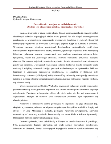 Żydowski Instytut Historyczny im. Emanuela Ringelbluma Artykuły Dr Alina Cała Żydowski Instytut Historyczny Przenikanie i wzajemne oddziaływanie. Żydzi i ich otoczenie: polskie, niemieckie, litewskie Ludność żydowska w ciągu swojej długiej historii przemieszczała się etapami wzdłuż określonych szlaków migracyjnych (które warto poznać, by nie ulegać stereotypowemu przekonaniu o równomiernym rozproszeniu wyznawców judaizmu w świecie). Starożytni Hebrajczycy wędrowali od Półwyspu Arabskiego, poprzez Egipt do Kanaanu i Babilonii. Wyznające mozaizm plemiona starożytnych Izraelczyków zamieszkiwały część ziem kanaanejskich i dopiero król Dawid zdołał, na krótko, zjednoczyć większość ziem późniejszej Palestyny, pokonując wrogów zewnętrznych oraz strukturę plemienną własnego ludu, bynajmniej, wcale nie jednolitego etnicznie. Niewola babilońska przyniosła początek diaspory. Nie oznacza to jednak, że mieszkańcy Judei i Izraela nie zamieszkiwali ościennych państw już przedtem. O ile jednak wysiedlenie ludności królestwa Izraela oznaczało utratę etnicznej i religijnej tożsamości (dając początek rozbudowanym w żydowskim folklorze legendom o „dziesięciu zaginionych pokoleniach), to osiedlone w Babilonii elity Południowego królestwa (późniejszej Judei) tożsamość tę zachowały, wzbogacając starożytny judaizm o niektóre religijne koncepcje zaratrusztyzmu, jak idea pośmiertnej nagrody lub kary, czy wiara w anioły. Wraz z rosnącymi na Bliskim Wschodzie rzymskimi wpływami grupki wyznawców judaizmu osiedlały się w granicach Imperium, zaś kultura hellenistyczna odmieniła obyczaje mieszkańców Palestyny, wzbogacając religię, ale także stając się dla niej wyzwaniem i zagrożeniem. Jednym ze skutków tych kulturowych przemian było wyłonienie się chrześcijaństwa. Kulturowe i ludnościowe centra, powstające w Imperium i na jego obrzeżach (np. skupisko wyznawców judaizmu na Majorce, na półwyspie Iberyjskim, w Galii, z drugiej zaś strony – w Azji Mniejszej i Indiach), podlegały wpływom zewnętrznym, aktywnie uczestnicząc w kulturowej wymianie. Pozostawiały one trwałe ślady w kulturze żydowskiej, która jednak potrafiła zachować religijną spójność. Ludność żydowska, która osiedliła się w Europie za czasów Imperium Rzymskiego, była, paradoksalnie, bardziej pierwotna, niż wiele później powstałych narodowości. Mieszkała w Hiszpanii, Francji i na wyspach Brytyjskich, zanim w wyniku zmieszania się 1 Żydowski Instytut Historyczny im. Emanuela Ringelbluma Artykuły wpływów celtyckich, germańskich i romańskich powstały języki oraz narody hiszpański, francuski, angielski. Żydzi są zatem ludnością autochtoniczną w Europie, co należy z całą mocą podkreślić, bowiem mocno zakorzeniony stereotyp każe nam postrzegać tę grupę tak, jakby byli świeżo przybyłymi imigrantami. Pierwsze gminy żydowskie w przedchrześcijańskiej Europie były silnie zintegrowane z otaczającą ludnością, nie wyróżniając się ani strojem, ani obyczajami. Nierzadkie były małżeństwa mieszane. To dopiero prawodawstwo chrześcijańskie oraz walka konkurencyjna między dwoma wyznaniami stały u genezy rosnącej izolacji. Jeszcze w III w. n.e. wspólny dla obu religii kult grobów Machabeuszy prowadził do zmian wyznania, z których najbardziej spektakularnym było przyjęcie (powrót do?) judaizmu przez Gamaliela, chrześcijańskiego patriarchę Jerozolimy. Mimo wrogości, obie religie ulegały także wzajemnym wpływom. Żydowscy średniowieczni myśliciele hiszpańscy przekazali Europie zachowaną w islamie tradycję arystotelesowską, bez której niemożliwy byłby dorobek filozoficzny św. Tomasza. Ruch franciszkański w pewnej mierze ukształtował żydowską religijność średniowieczną, wraz z przejęciem niektórych praktyk ascetycznych oraz koncepcji instytucjonalnej pomocy społecznej. Europejskie centra żydowskie rozprzestrzeniały się, przesuwając się coraz bardziej na zachód. Kultura żydowska przechowywała ślady tej wędrówki. Przykładem mogą być śladowe pozostałości starofrancuskiego w języku jidysz. Także kultura społeczeństw większościowych zachowywała ślady bytności Żydów na swoim terenie, można tu przywołać przykład słów pochodzących z hebrajskiego w języku niemieckim, czeskim, polskim. Największa fala migracyjna Żydów przybyła do Polski w XIII-XIV w. w wyniku prześladowań w krajach niemieckich, Czechach i na Morawach. Byli częścią wielkiego ruchu osadniczego, obejmującego także etnicznych Niemców. Obie te grupy były nosicielami wyższej techniki w rzemiosłach i handlu; przenieśli także właściwe im formy osadnicze; w przypadku Żydów, był to kahał, pełniący wiele ról społecznych: od samorządowych, poprzez filantropię, po funkcje quasi-polityczne (kontakty z władzami). Trudno przecenić wpływ umiejętności technicznych żydowskich przybyszów na polską kulturę, choć niełatwo je wyodrębnić od tych, które zawdzięczamy niemieckim osadnikom. Warto tu wspomnieć o brakteatach: monetach z hebrajskimi napisami, bitych w mennicach książęcych w XI-XIII przez żydowskich mincerzy. Jak w całej Europie, także i tu Żydzi przyczynili się do rozwoju technik obrotu pieniądzem, stając się pionierami 2 Żydowski Instytut Historyczny im. Emanuela Ringelbluma Artykuły bankierstwa. Początki drukarstwa zawdzięczamy w dużym stopniu żydowskim firmom, wydającym równolegle chrześcijańskie i judaistyczne książki. Przez cały okres historii Żydów w Polsce trwała wymiana kultury między mniejszością, a ludnością otaczającą, choć obie były nie tylko powiązane nićmi współdziałania, ale i oddzielone przejawami wzajemnej niechęci oraz zakodowanymi w kulturze chrześcijańskiej odruchami wrogości, czy wręcz przemocy. Ślady polskich, czy szerzej – słowiańskich wpływów widać przede wszystkim 