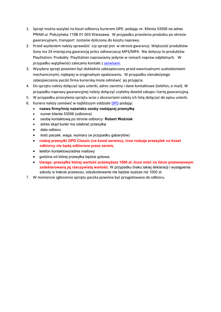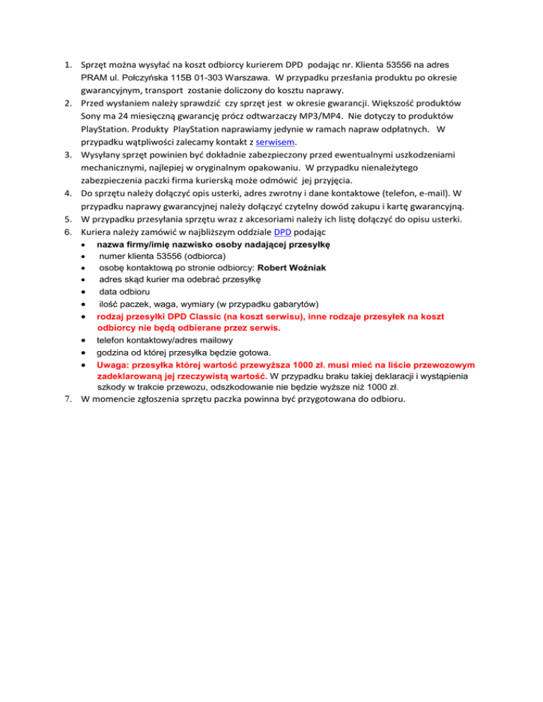 1. Sprzęt można wysyłać na koszt odbiorcy kurierem DPD podając nr. Klienta 53556 na adres PRAM ul. Połczyńska 115B 01-303 Warszawa. W przypadku przesłania produktu po okresie gwarancyjnym, transport zostanie doliczony do kosztu naprawy. 2. Przed wysłaniem należy sprawdzić czy sprzęt jest w okresie gwarancji. Większość produktów Sony ma 24 miesięczną gwarancję prócz odtwarzaczy MP3/MP4. Nie dotyczy to produktów PlayStation. Produkty PlayStation naprawiamy jedynie w ramach napraw odpłatnych. W przypadku wątpliwości zalecamy kontakt z serwisem. 3. Wysyłany sprzęt powinien być dokładnie zabezpieczony przed ewentualnymi uszkodzeniami mechanicznymi, najlepiej w oryginalnym opakowaniu. W przypadku nienależytego zabezpieczenia paczki firma kurierską może odmówić jej przyjęcia. 4. Do sprzętu należy dołączyć opis usterki, adres zwrotny i dane kontaktowe (telefon, e-mail). W przypadku naprawy gwarancyjnej należy dołączyć czytelny dowód zakupu i kartę gwarancyjną. 5. W przypadku przesyłania sprzętu wraz z akcesoriami należy ich listę dołączyć do opisu usterki. 6. Kuriera należy zamówić w najbliższym oddziale DPD podając nazwa firmy/imię nazwisko osoby nadającej przesyłkę numer klienta 53556 (odbiorca) osobę kontaktową po stronie odbiorcy: Robert Woźniak adres skąd kurier ma odebrać przesyłkę data odbioru ilość paczek, waga, wymiary (w przypadku gabarytów) rodzaj przesyłki DPD Classic (na koszt serwisu), inne rodzaje przesyłek na koszt odbiorcy nie będą odbierane przez serwis. telefon kontaktowy/adres mailowy godzina od której przesyłka będzie gotowa. Uwaga: przesyłka której wartość przewyższa 1000 zł. musi mieć na liście przewozowym zadeklarowaną jej rzeczywistą wartość. W przypadku braku takiej deklaracji i wystąpienia szkody w trakcie przewozu, odszkodowanie nie będzie wyższe niż 1000 zł. 7. W momencie zgłoszenia sprzętu paczka powinna być przygotowana do odbioru.