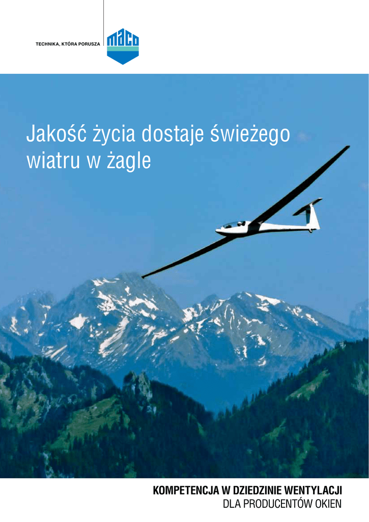 TECHNIKA, KTÓRA PORUSZA Jakość życia dostaje świeżego wiatru w żagle KOMPETENCJA W DZIEDZINIE WENTYLACJI dla producentów okien MACO – Wrębowy wentyl okienny Całkowicie nowa generacja wentylacji okiennej Wysoka jakość powietrza w pomieszczeniu jest decydującym czynnikiem dla dobrego samopoczucia i zdrowia człowieka, służy równocześnie ochronie budynku. Budowa energooszczędnego budynku wymaga hermetycznej konstrukcji. Tylko w ten 2 sposób można zrealizować znaczny potencjał oszczędności energii. Skuteczna izolacja cieplna, idealnie zamontowane nowoczesne okna są gwarantami długofalowej oszczędności energii. Nowym wyzwaniem jest zapewnienie higieny, przytulnej atmosfery i zdrowia mieszkańców za pomocą nowych inteligentnych systemów wentylacji. Tylko dzięki zdefiniowanej minimalnej wymianie powietrza można zapobiec szkodom spowodowanym przez wilgoć i jej dalszym skutkom. Bez prawidłowego wietrzenia wilgotność nie może się ulatniać ze względu na hermetyczną konstrukcję budynków. Skutkiem tego jest skraplanie się pary wodnej, nieświeże powietrze, powstawanie bakterii i pleśni. Pakiet wrębowych wentyli okiennych MACO oferuje zautomatyzowane bezpieczeństwo dzięki zdefiniowanej minimalnej wymianie powietrza dla ochrony przed wilgocią. 3 Ukryty wrębowy wentyl okienny MACO W dzisiejszym energooszczędnym budownictwie instalacje wentylacyjne są nieodzownym standardem. Nowoczesna architektura i energooszczędność idą ze sobą w parze. MACO oferuje producentom okien nowe możliwości w zakresie wietrzenia. Ukryty wrębowy wentyl okienny MACO jest najbardziej 4 sensowną alternatywą wobec scentralizowanych i zdecentralizowanych instalacji wentylacyjnych. Inteligentna, samodzielna regulacja ilości powietrza przez kryty wrębowy wentyl okienny zapewnia niezależnie od użytkownika optymalną wymianę powietrza w celu ochrony przed wilgocią. Dodatkowo użytkownik może w każdej chwili manualnie ingerować w system i wybrać ustawienie ilości wymiany powietrza od „całkowicie otwartego“ do „szczelnie zamkniętego“. MACO WENTYLACJA Okna nabierają oddechu • W każdej chwili możliwa regulacja dzięki przełączeniu aktywny/ nieaktywny • Zabezpieczenie przez przeciągiem • Montaż we wrębie okna • Uregulowana wymiana powietrza przy zamkniętym oknie • Minimalna wentylacja dla ochrony przed wilgocią • Długość 140 mm • Przepuszczalność powietrza do 8 m³/h • Aerodynamiczne działanie Korzyści dla producentów • Doradztwo MACO w zakresie wentylacji • Niewidoczny we wrębie okna • Uregulowana, kontrolowana minimalna wymiana powietrza przy zamkniętym oknie • Prosty montaż, możliwe również doposażenie • Narzędzia do regulacji wentylacji • Niezależny od użytkownika • Zgodne z DIN 1946-6 lub DIN 18017-3 • Doposażenie możliwe w każdej chwili bez specjalnych narzędzi • Nie narusza ochrony antywłamaniowej • Nie trzeba frezować ramy • Dla wszystkich powszechnie stosowanych profili okiennych Korzyści dla użytkowników • Automatycznie regulowana minimalna wymiana powietrza • Zapobiega powstawaniu bakterii i pleśni • Ochrona przed skutkami wilgoci • Korzystna cena i prosta konserwacja • Łatwy montaż • Dodatkowa blokada dla ustawienia aktywnego i nieaktywnego 5 Higrosterowany nawiewnik okienny MACO Nawiewnik okienny systemowo połączony jest z oknem. Automatycznie reguluje wymianę powietrza przy wytwarzaniu się wilgoci w pomieszczeniach wewnętrznych. By zwiększyć ilość wymiany powietrza w wentylacji przez nawiewniki okienne firma MACO wprowadza nową generację inteligentnych, higrosterowanych nawiewników okiennych. 6 System pracuje bez ingerencji z zewnątrz pod nieobecność użytkownika, jednak w każdej chwili może być przełączony w tryb aktywny lub nieaktywny. Manualne otwarcie okna nie jest już konieczne. MACO WENTYLACJA Korzyści konceptu • Ciekawe wzornictwo • Prosty i tani montaż • Automatyczna reakcja na wilgotność powietrza • Prosta konserwacja • Niezależny od użytkownika, zgodny z DIN 1946-6 • Brak szkód spowodowanych wilgocią, takich jak pleśń lub skraplanie się pary wodnej • Możliwe doposażenie okna • Nie trzeba ingerować w strukturę budynku • Opcjonalnie podwyższona izolacja dźwiękowa • Dodatkowo możliwa w każdej chwili regulacja aktywny/nieaktywny • W przypadku większego zapotrzebowania na powietrze nawiewniki można łączyć 7 Oprogramowanie do wentyli okiennych MACO – Kompetentne rozwiązanie zgodnie z DIN 1946-6 i DIN 18017-3 Chłodne powietrza zawiera mniej wilgoci niż ciepłe, dlatego chłodne powietrzy przy ocieplaniu pobiera dodatkowo wilgoć z otoczenia. Tą podstawową zasadę fizyki wykorzystuje się przy wentylacji. By do minimum zredukować utratę energii, działania wentylacji muszą być dokładnie zaplanowane i uregulowane. Dla zdrowego klimatu w mieszkaniu zgodnie z najnowszymi standardami budownictwa powietrze musi być wymieniane co dwie godziny przez przynajmniej 8 10 minut za pomocą otwartego okna. Wówczas w niekontrolowany sposób traci się dużą część energii. Zazwyczaj w ciągu dnia mieszkańców nie ma w domu, więc wentylacja uzależniona od użytkowników nie jest ani sensowna, ani wykonalna. Dla nowo budowanych lub modernizowanych budynków trzeba niezależnie od oczekiwanego zachowania użytkowników zawsze stworzyć koncepcję wentylacji. Istotna zasada brzmi: w obszarze wentylacji nie ma popularnych standardowych przypadków. Konieczne działania muszą być zawsze indywidualnie rozpoznane i skrojone na miarę. Program ustala dane wymagania i pomaga wybrać działania zgodnie z zapotrzebowaniem. Narzędzie zostało opracowane i wykonane wspólnie z fachowcami i profesorami fizyki budowlanej. Bazuje na normach DIN 1946-6: “Wentylacja mieszkań“ i DIN 18017-3: „Wentylacja pomieszczeń bez okien“. Indywidualne techniczne problemy w zakresie wentylacji są ro