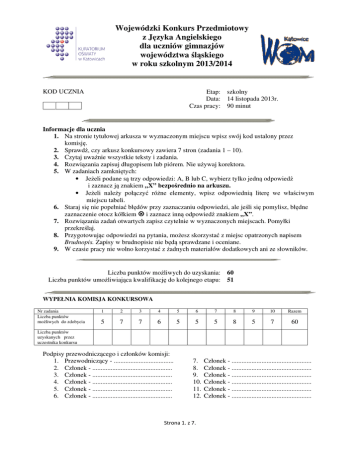 Wojewódzki Konkurs Przedmiotowy z Języka Angielskiego dla uczniów gimnazjów województwa śląskiego w roku szkolnym 2013/2014 KOD UCZNIA Etap: szkolny Data: 14 listopada 2013r. Czas pracy: 90 minut Informacje dla ucznia 1. Na stronie tytułowej arkusza w wyznaczonym miejscu wpisz swój kod ustalony przez komisję. 2. Sprawdź, czy arkusz konkursowy zawiera 7 stron (zadania 1 – 10). 3. Czytaj uważnie wszystkie teksty i zadania. 4. Rozwiązania zapisuj długopisem lub piórem. Nie używaj korektora. 5. W zadaniach zamkniętych: • Jeżeli podane są trzy odpowiedzi: A, B lub C, wybierz tylko jedną odpowiedź i zaznacz ją znakiem „X” bezpośrednio na arkuszu. • Jeżeli należy połączyć różne elementy, wpisz odpowiednią literę we właściwym miejscu tabeli. 6. Staraj się nie popełniać błędów przy zaznaczaniu odpowiedzi, ale jeśli się pomylisz, błędne zaznaczenie otocz kółkiem i zaznacz inną odpowiedź znakiem „X”. 7. Rozwiązania zadań otwartych zapisz czytelnie w wyznaczonych miejscach. Pomyłki przekreślaj. 8. Przygotowując odpowiedzi na pytania, możesz skorzystać z miejsc opatrzonych napisem Brudnopis. Zapisy w brudnopisie nie będą sprawdzane i oceniane. 9. W czasie pracy nie wolno korzystać z żadnych materiałów dodatkowych ani ze słowników. Liczba punktów możliwych do uzyskania: 60 Liczba punktów umożliwiająca kwalifikację do kolejnego etapu: 51 WYPEŁNIA KOMISJA KONKURSOWA Nr zadania Liczba punktów możliwych do zdobycia 1 2 3 4 5 6 7 8 9 10 Razem 5 7 7 6 5 5 5 8 5 7 60 Liczba punktów uzyskanych przez uczestnika konkursu Podpisy przewodniczącego i członków komisji: 1. Przewodniczący - .................................... 2. Członek - ................................................ 3. Członek - ................................................ 4. Członek - ................................................ 5. Członek - ................................................ 6. Członek - ................................................ 7. 8. 9. 10. 11. 12. Strona 1. z 7. Członek - ................................................ Członek - ................................................ Członek - ................................................ Członek - ................................................ Członek - ................................................ Członek - ................................................ Zadanie 1 (0 – 5) Połącz wyrazy tak, aby utworzyły zwroty. Wpisz odpowiednie litery obok cyfr w tabeli. Dwa z wyrazów oznaczonych A – G nie pasują do żadnego ze słów w pierwszej kolumnie (1 – 5). Przetłumacz powstałe zwroty na język polski. Za każdą pełną poprawną odpowiedź otrzymasz 1 punkt. 1. sigh with A crosswords 1. 2. safety B pin 2. 3. for C order 3. 4. out of D accident 4. 5. do E sale 5. F relief G debt ............... p. / 5p. Zadanie 2 (0 – 7) W każdym ze zdań pogrubiono dwa wyrazy. Podkreśl ten z nich, który utworzy prawidłową wypowiedź. Za każdą poprawną odpowiedź otrzymasz 1 punkt. Dinner’s ready. Can you lie / lay the table, please? Our cleaning lady makes / does the ironing every Friday. Anna is very tall / high. She’s a basketball player. I really respect / appreciate all the help you’ve given me with my project. You’re the most honest / serious person I know. I’ve never seen you cheat. This bakery is famous / popular for their strawberry cheesecake. When we get to the shop, could you remember / remind me to buy some milk? ............... p. / 7p. Zadanie 3 (0 – 7) Dopasuj słowa z dwóch kolumn tak aby utworzyć poprawne wyrażenia, a następnie uzupełnij odpowiednimi wyrażeniami podane niżej zdania. Za każde poprawnie uzupełnione zdanie otrzymasz 1 punkt. 1. shopping A. card 2. alarm B. water 3. factory C. tag 4. tap D. list 5. credit E. workers 6. price F. clock 7. cotton G. fields 1. 2. 3. 4. 5. 6. 7. 1. Do you write a ............................................... before you go to the supermarket to buy food. 2. In the past, slaves worked in the …………………..........................................… of the USA. 3. Set the …………………................................................…........... for 6 a.m. instead of 7 a.m. 4. You can pay in cash or by ……………...................................................................…………. 5. ……………….................................................................…….. often do quite repetitive jobs. 6. ……………….........................……. may contain some substances causing health problems. 7. This shirt hasn’t got a ……….........................………………. I don’t know how much it is. ............... p. / 7p. Strona 2. z 7. Zadanie 4 (0 – 6) Czasowniki podane w nawiasach wpisz w odpowiedniej formie. Za każdą poprawną odpowiedź otrzymasz 1 punkt. 1. He (sit) ................................................................................... in a café when I saw him. 2. Would you mind (open) ...................................................................... the door for me? 3. They (talk) .................................................................. in the headmaster's office for two hours now. 4. Look! That boy (walk) .......................................................... on the roof of the church!. 5. By the time they got home, the children (go) ...................................................... to bed. 6. If you had a dog you (not be) ....................................................... afraid of the burglars. ............... p. / 6p. Zadanie 5 (0 – 5) Wybierz jedną spośród trzech podanych możliwości, tak aby po wstawieniu jej w miejsce wykropkowane powstała całość poprawna pod względem gramatycznym. Zaznacz literę A, B lub C znakiem „X”. Za każdą poprawną odpowiedź otrzymasz 1 punkt. 1. Do you think we have given them too ..................................? A. 