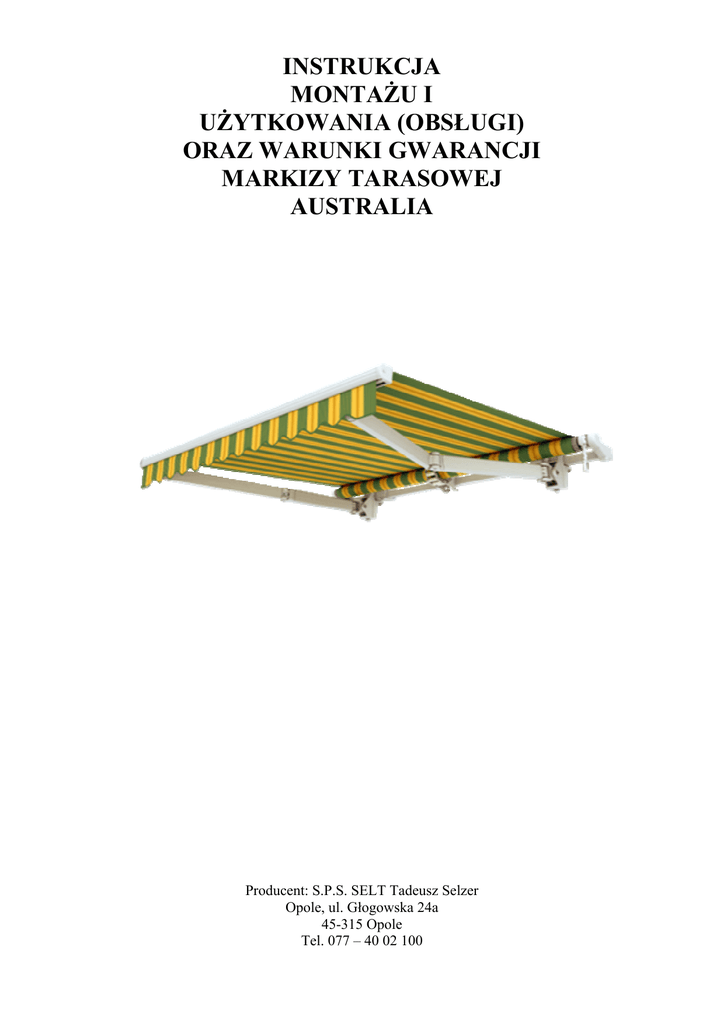 INSTRUKCJA MONTAŻU I UŻYTKOWANIA (OBSŁUGI) ORAZ WARUNKI GWARANCJI MARKIZY TARASOWEJ AUSTRALIA Producent: S.P.S. SELT Tadeusz Selzer Opole, ul. Głogowska 24a 45-315 Opole Tel. 077 – 40 02 100 SPIS TREŚCI 1. WPROWADZENIE 1.1. SYMBOLE I OZNACZENIA STOSOWANE W INSTRUKCJI 2. BEZPIECZEŃSTWO 2.1. OGÓLNE WARUNKI BEZPIECZEŃSTWA 2.2. URZĄDZENIA BEZPIECZEŃSTWA (elementy opcjonalne) 2.3. RYZYKO ZRANIENIA, USZKODZENIA CIAŁA. 3. WARUNKI PRACY I UŻYTKOWANIA MARKIZY 4. TRANSPORT 5. MONTAŻ, INSTALACJA 5.1. INSTRUKCJA MONTAŻU 6. WYKAZ CZĘŚCI 7. OPIS PRODUKTU 8. WARUNKI PRACY 9. KONSERWACJA, OPAKOWANIE 10. WARUNKI GWARANCJI ZAŚLEPKA BELKI PRZEDNIEJ BELKA PRZEDNIA TKANINA POKRYWA BOCZNA UCHWYT RAMIENIA RAMIĘ MARKIZY PROFIL STALOWY 2 1. WPROWADZENIE • Niniejsza INSTRUKCJA MONTAŻU I UŻYTKOWANIA oraz WARUNKI GWARANCJI jest integralną częścią markizy tarasowej AUSTRALIA i została napisana dla jej użytkowników. • Fundamentalną rzeczą jest właściwa obsługa i użytkowania przedmiotowej markizy. • Zabrania się usuwania, dodawania i jakiejkolwiek modyfikacji stron i zawartości niniejszej instrukcji. • Instrukcja ta musi być łatwo dostępna w całości tak długo jak długo markiza AUSTRALIA jest użytkowana. • W przypadku zniszczenia lub zagubienia instrukcji prosimy o kontakt ze sprzedawcą celem otrzymania jej kopii. • Producent zastrzega sobie prawo do zmian konstrukcyjnych produktu i odpowiednich zmian w przynależnej do niego instrukcji montażu i użytkowania wraz z warunkami gwarancji bez powiadomienia. • Producenta zastrzega sobie prawo własności przedmiotowej instrukcji montażu i użytkowania wraz z warunkami gwarancji. • Dokonywanie jakichkolwiek zmian lub modyfikacji wyrobu przez osoby trzecie bez zgody producenta skutkuje utartą jego gwarancji. • Przeczytaj i zachowaj instrukcję obsługi. 1.1. SYMBOLE STOSOWANE W NINIEJSZEJ INSTRUKCJI: i Informacje i środki bezpieczeństwa Instrukcje i ogólne uwagi dotyczące obsługi i bezpieczeństwa. Niewłaściwe użytkowanie markizy może mieć negatywny wpływ na całość konstrukcji i skutkować zmniejszeniem jej właściwości użytkowych, a co za tym idzie pogorszeniem bezpieczeństwa użytkowania. UWAGA ! Wykrzyknik umieszczony w trójkącie równoramiennym ma zwrócić uwagę użytkownika na ważne czynności dotyczące obsługi, konserwacji itp. podane w materiałach załączonych z produktem. Przed rozpoczęciem użytkowania wyrobu należy dokładnie zapoznać się z INSTRUKCJĄ OBSŁUGI. Postępowanie zgodnie z niniejszą INSTRUKCJĄ jest istotne dla bezpieczeństwa osób użytkujących markizę. 2. BEZPIECZEŃSTWO 2.1. OGÓLNE ZASADY BEZPIECZEŃSTWA. W przypadku wystąpienia opadów deszczu, śniegu lub wiatru należy bezzwłocznie zamknąć markizę. Nie zastosowanie się do powyższego zalecenia zwiększa prawdopodobieństwo uszkodzenia, zniszczenia markizy lub wystąpienia wypadku. Bezwzględnie zabrania się demontażu urządzeń zabezpieczających (patrz rozdział urządzenia zabezpieczające). Markizy z napędem elektrycznych są sterowane (otwierane, zamykane) przy pomocy przełączników, urządzeń zdalnego sterowania – pilotów. Wszystkie urządzenia sterujące należy przechowywać poza zasięgiem dzieci oraz nie pozwalać dzieciom na bawienie się urządzeniami sterującymi markizy. Zawsze należy upewnić się, że podczas otwierania i zamykania markizy nikt pod nią nie przebywa. Często kontrolować instalację pod kątem zużycia lub uszkodzenia przewodów. Nie używać jeśli niezbędna jest naprawa. Nie wolno umieszczać jakichkolwiek przedmiotów, rzeczy itp. zarówno na tkaninie markizowej jak i na konstrukcji markizy. Niedopuszczalne jest przytrzymywanie lub wieszanie czy też przyczepianie czegokolwiek do markizy. W przypadku nieprawidłowego działania lub awarii markizy należy skontaktować się ze sprzedawcą lub serwisem. Nie wolno uruchamiać, dokonywać samodzielnych napraw wadliwie działającej markizy. Zabrania się dokonywania jakichkolwiek zmian lub modyfikacji wyrobu przez osoby trzecie bez zgody producenta, zwiększa to ryzyko odniesienia obrażeń i skutkuje utartą gwarancji wyrobu. Wszystkie czynności czyszczenia tkaniny, mycia konstrukcji mogą odbywać się wyłącznie po odcięciu zasilania elektrycznego markizy. Instalacja elektryczna, pierwsze programowanie napędu markizy oraz specjalistyczne czynności obsługi mogą być dokonywane wyłącznie przez specjalistyczne autoryzowane firmy. 2.2. DODATKOWE URZĄDZENIA ZABEZPIECZAJĄCE –OPCJA WYŁĄCZNIE DLA MARKIZ Z NAPĘDEM ELEKTRYCZNYM. Czujnik wiatrowy – w przypadku silnego wiatru markiza zamyka się automatycznie. Siła wiatru tzn. prędkość wiatru, przy której czujnik wysyła sygnał o zamknięciu markizy nastawiana jest przez w czasie programowania inicjującego pracę markizy zgodnie z załączoną instrukcją obsługi czujnika. 3 Czujnik słoneczny – opcja automatycznego otwierania markizy w czasie silnego nasłonecznienia, przy której czujnik wysyła sygnał o otwarciu markizy nastawiana jest przez w czasie programowania inicjującego pracę markizy zgodnie z załączoną instrukcją obsługi czujnika. Czujnik wiatrowy, wiatrowo-słoneczny – ustawianie parametrów czujnika zgodnie z załączoną Instrukcją Obsługi. Opcja „zamykania w czasie wiatru” ma pierwszeństwo w stosunku do „opcji słońca”. Czujnik wiatrowy, słoneczny lub wiatrowo-słoneczny nigdy nie zabezpieczy markizy przed ryzykiem uszkodzenia markizy przed gwałtownymi podmuchami wiatru przekraczającymi nastawy „zamykania”. 2.3. RYZYKO ZRANIENIA, USZKODZENIA CIAŁA. Ryzyko uszkodzenia dłoni, palców zwłaszcza w markizach z ramionami składanymi w czasie otwierania i zamykania markizy. Celem uniknięcia tego typu obrażeń należy mocować markizę na takiej wysokości od podłoża aby po otworzeniu jej najniższa część znajdowała się w odległości co najmniej 2200mm od podłoża. 2200mm 3. WARUN