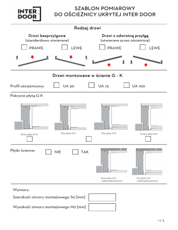 SZABLON POMIAROWY DO OŚCIEŻ OŚCIEŻNICY UKRYTEJ INTER DOOR Rodzaj drzwi Drzwi bezprzylgowe (standardowo otwierane) PRAWE Drzwi z odwrotną przylgą (otwierane przez ościeżnicę) LEWE PRAWE LEWE Drzwi montowane w ścianie G - K Profil ościeżnicowy: UA 50 UA 75 UA 100 Pokrycie płytą G-K Płytki ścienne: NIE TAK Wymiary: Szerokość otworu montażowego S0 [mm] Wysokość otworu montażowego H0 [mm] 1/2 SZABLON POMIAROWY DO OŚCIEŻ OŚCIEŻNICY UKRYTEJ INTER DOOR Rodzaj drzwi Drzwi bezprzylgowe (standardowo otwierane) PRAWE Drzwi z odwrotną przylgą (otwierane przez ościeżnicę) LEWE PRAWE LEWE Drzwi montowane w ścianie murowanej Grubość muru [mm] (grubość finalna po położeniu tynków) Płytki ścienne: NIE TAK Grubość muru Wymiary: Szerokość otworu montażowego S0 [mm] Wysokość otworu montażowego H0 [mm] 2/2