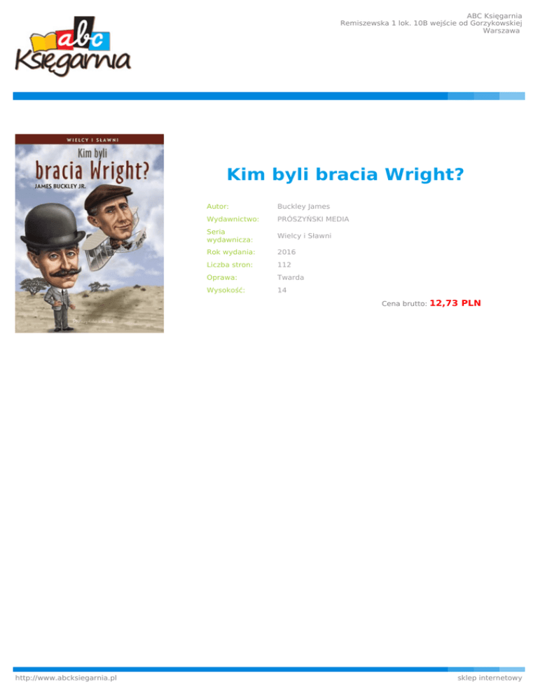 ABC Księgarnia Remiszewska 1 lok. 10B wejście od Gorzykowskiej Warszawa Kim byli bracia Wright? Autor: Buckley James Wydawnictwo: PRÓSZYŃSKI MEDIA Seria wydawnicza: Wielcy i Sławni Rok wydania: 2016 Liczba stron: 112 Oprawa: Twarda Wysokość: 14 Cena brutto: http://www.abcksiegarnia.pl 12,73 PLN sklep internetowy