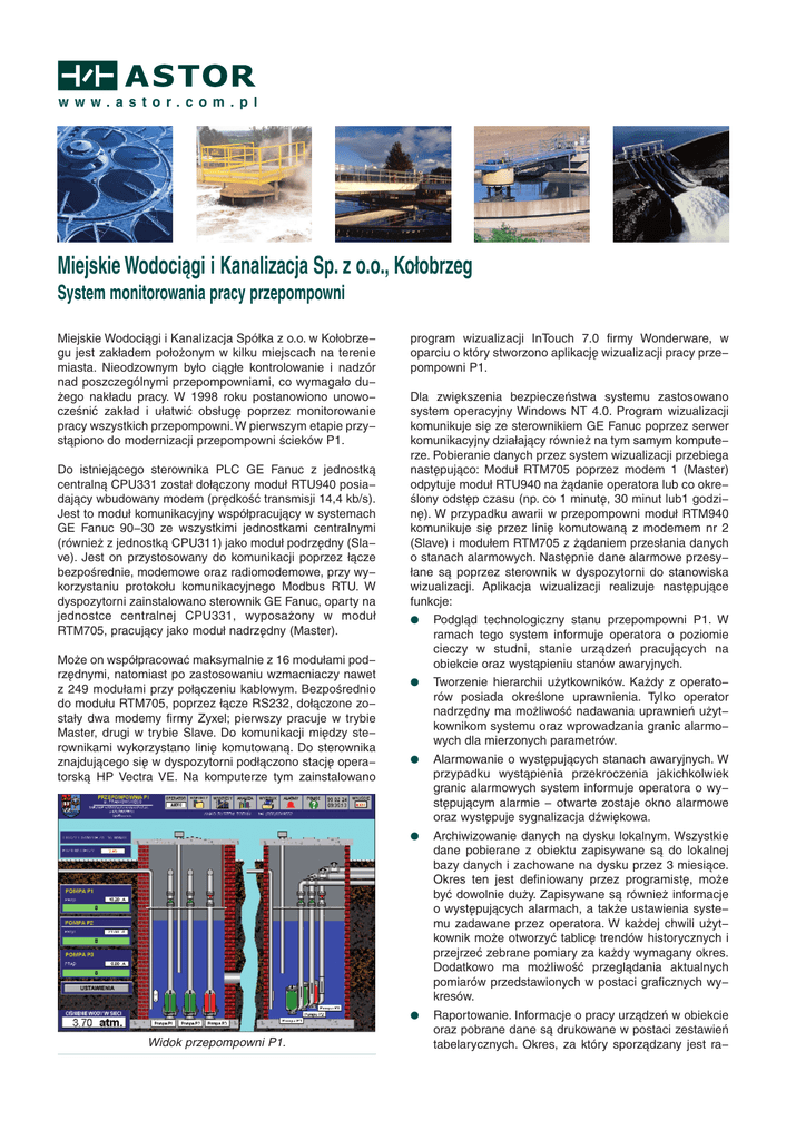 w w w. a s t o r. c o m . p l Miejskie Wodociągi i Kanalizacja Sp. z o.o., Kołobrzeg System monitorowania pracy przepompowni Miejskie Wodociągi i Kanalizacja Spółka z o.o. w Kołobrze− gu jest zakładem położonym w kilku miejscach na terenie miasta. Nieodzownym było ciągłe kontrolowanie i nadzór nad poszczególnymi przepompowniami, co wymagało du− żego nakładu pracy. W 1998 roku postanowiono unowo− cześnić zakład i ułatwić obsługę poprzez monitorowanie pracy wszystkich przepompowni. W pierwszym etapie przy− stąpiono do modernizacji przepompowni ścieków P1. Do istniejącego sterownika PLC GE Fanuc z jednostką centralną CPU331 został dołączony moduł RTU940 posia− dający wbudowany modem (prędkość transmisji 14,4 kb/s). Jest to moduł komunikacyjny współpracujący w systemach GE Fanuc 90−30 ze wszystkimi jednostkami centralnymi (również z jednostką CPU311) jako moduł podrzędny (Sla− ve). Jest on przystosowany do komunikacji poprzez łącze bezpośrednie, modemowe oraz radiomodemowe, przy wy− korzystaniu protokołu komunikacyjnego Modbus RTU. W dyspozytorni zainstalowano sterownik GE Fanuc, oparty na jednostce centralnej CPU331, wyposażony w moduł RTM705, pracujący jako moduł nadrzędny (Master). Może on współpracować maksymalnie z 16 modułami pod− rzędnymi, natomiast po zastosowaniu wzmacniaczy nawet z 249 modułami przy połączeniu kablowym. Bezpośrednio do modułu RTM705, poprzez łącze RS232, dołączone zo− stały dwa modemy firmy Zyxel; pierwszy pracuje w trybie Master, drugi w trybie Slave. Do komunikacji między ste− rownikami wykorzystano linię komutowaną. Do sterownika znajdującego się w dyspozytorni podłączono stację opera− torską HP Vectra VE. Na komputerze tym zainstalowano Widok przepompowni P1. program wizualizacji InTouch 7.0 firmy Wonderware, w oparciu o który stworzono aplikację wizualizacji pracy prze− pompowni P1. Dla zwiększenia bezpieczeństwa systemu zastosowano system operacyjny Windows NT 4.0. Program wizualizacji komunikuje się ze sterownikiem GE Fanuc poprzez serwer komunikacyjny działający również na tym samym kompute− rze. Pobieranie danych przez system wizualizacji przebiega następująco: Moduł RTM705 poprzez modem 1 (Master) odpytuje moduł RTU940 na żądanie operatora lub co okre− ślony odstęp czasu (np. co 1 minutę, 30 minut lub1 godzi− nę). W przypadku awarii w przepompowni moduł RTM940 komunikuje się przez linię komutowaną z modemem nr 2 (Slave) i modułem RTM705 z żądaniem przesłania danych o stanach alarmowych. Następnie dane alarmowe przesy− łane są poprzez sterownik w dyspozytorni do stanowiska wizualizacji. Aplikacja wizualizacji realizuje następujące funkcje: ● Podgląd technologiczny stanu przepompowni P1. W ramach tego system informuje operatora o poziomie cieczy w studni, stanie urządzeń pracujących na obiekcie oraz wystąpieniu stanów awaryjnych. ● Tworzenie hierarchii użytkowników. Każdy z operato− rów posiada określone uprawnienia. Tylko operator nadrzędny ma możliwość nadawania uprawnień użyt− kownikom systemu oraz wprowadzania granic alarmo− wych dla mierzonych parametrów. ● Alarmowanie o występujących stanach awaryjnych. W przypadku wystąpienia przekroczenia jakichkolwiek granic alarmowych system informuje operatora o wy− stępującym alarmie − otwarte zostaje okno alarmowe oraz występuje sygnalizacja dźwiękowa. ● Archiwizowanie danych na dysku lokalnym. Wszystkie dane pobierane z obiektu zapisywane są do lokalnej bazy danych i zachowane na dysku przez 3 miesiące. Okres ten jest definiowany przez programistę, może być dowolnie duży. Zapisywane są również informacje o występujących alarmach, a także ustawienia syste− mu zadawane przez operatora. W każdej chwili użyt− kownik może otworzyć tablicę trendów historycznych i przejrzeć zebrane pomiary za każdy wymagany okres. Dodatkowo ma możliwość przeglądania aktualnych pomiarów przedstawionych w postaci graficznych wy− kresów. ● Raportowanie. Informacje o pracy urządzeń w obiekcie oraz pobrane dane są drukowane w postaci zestawień tabelarycznych. Okres, za który sporządzany jest ra− port, może mieć dowolny zakres. Operatorzy mogą również drukować informacje o bieżącym stanie w obiekcie. Przedstawiony system zakładu został zaprojektowany i wdrożony w roku 1998 przez firmę Anko−System z Torunia. W najbliższej przyszłości przewiduje się uruchomienie ko− lejnej stacji przepompowni z wykorzystaniem linii komuto− wanej bądź radiomodemów. Zainstalowanie sterowników i wizualizacji unowocześniło zakład, ułatwiło pracę operato− rom, zmniejszyło liczbę występujących awarii, co w znacz− nej mierze wpłynęło na wzrost zadowolenie klientów MWiK w Kołobrzegu. ELEMENTY SYSTEMU 90-30 InTouch Zbigniew Czyżniewski, Mariusz Gurgoń − Anko−System Toruń Struktura systemu monitorowania przepompowni P1. w w w. a s t o r. c o m . p l