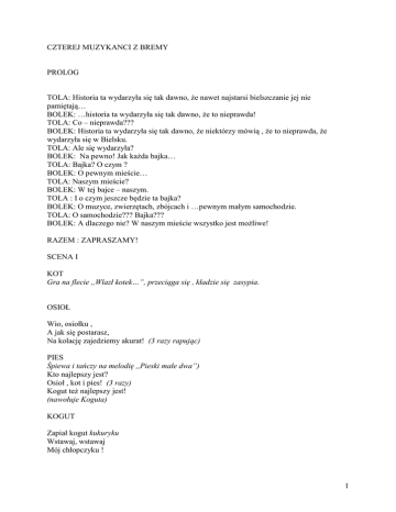 CZTEREJ MUZYKANCI Z BREMY PROLOG TOLA: Historia ta wydarzyła się tak dawno, że nawet najstarsi bielszczanie jej nie pamiętają… BOLEK: …historia ta wydarzyła się tak dawno, że to nieprawda! TOLA: Co – nieprawda??? BOLEK: Historia ta wydarzyła się tak dawno, że niektórzy mówią , że to nieprawda, że wydarzyła się w Bielsku. TOLA: Ale się wydarzyła? BOLEK: Na pewno! Jak każda bajka… TOLA: Bajka? O czym ? BOLEK: O pewnym mieście… TOLA: Naszym mieście? BOLEK: W tej bajce – naszym. TOLA : I o czym jeszcze będzie ta bajka? BOLEK: O muzyce, zwierzętach, zbójcach i …pewnym małym samochodzie. TOLA: O samochodzie??? Bajka??? BOLEK: A dlaczego nie? W naszym mieście wszystko jest możliwe! RAZEM : ZAPRASZAMY! SCENA I KOT Gra na flecie ,,Wlazł kotek…”, przeciąga się , kładzie się zasypia. OSIOŁ Wio, osiołku , A jak się postarasz, Na kolację zajedziemy akurat! (3 razy rapując) PIES Śpiewa i tańczy na melodię ,,Pieski małe dwa”) Kto najlepszy jest? Osioł , kot i pies! (3 razy) Kogut też najlepszy jest! (nawołuje Koguta) KOGUT Zapiał kogut kukuryku Wstawaj, wstawaj Mój chłopczyku ! 1 Każde zwierzę prezentuje się najpierw osobna, później wszystkie naraz śpiewają ( i grają) swoje piosenki aż wchodzą Narratorzy. Jeden z nich przepędza zwierzęta. SCENA II NARRATOR 1 A kysz, sio, a kysz…. NARRATOR 2 Niektórzy ludzie są naprawdę paskudni! Wszyscy niby to lubią zwierzęta , ale wystarczy zapytać , które najbardziej, a zaraz okazuje się , że chodzi im o pieczone kurczaki. NARRATOR 2 Pewien osioł przez całe lata dźwigał ciężkie worki, marząc o spokojnej starości. Kiedy się jednak zestarzał – jego pan, zamiast wysłać zwierzę na zasłużoną emeryturę, zaczął przemyśliwać, czy nie dałoby się przerobić go na pyszne kiełbaski. OSIOŁ O nie ! Zupełnie inaczej wyobrażałem sobie spokojną starość! Myślałem , że spędzę ją na łące, wśród pachnących kwiatów, a nie w sklepie mięsnym wśród szynek i parówek ! NARRATOR 1 Więc gdy tylko nadarzyła się okazja, uciekł od swego niewdzięcznego właściciela. OSIOŁ Ciekaw jestem tylko , z czego ja teraz będę żył???? Zauważa drogowskaz (Bielsko – Biała). O! Bielsko! Gdzie jak gdzie , ale w Bielsku stworzenie równie uzdolnione jak ja nie zginie. Czemuż nie miałbym zarabiać na przykład jako taksówka? Albo jeszcze lepiej – jako uliczny muzykant ! Wchodzi Pies i siada pod drogowskazem . NARRATOR 2 Osły może nie są obdarzone najpiękniejszymi głosami na świecie , ale za to bardzo donośnymi- a to już wystarczy , aby zacząć karierę ulicznego śpiewaka. 2 Osioł obchodzi drogowskaz i zauważa siedzącego psa. OSIOŁ(do Psa) Coś nie tak? PIES Nie , dlaczego? Po prostu zestarzałem się i wyrzucono mnie z domu, ale to przecież nic wielkiego ! OSIOŁ I pewnie nie wiesz, co teraz robić? PIES Ależ skąd , wiem. Zamierzam mianowicie spędzić najbliższe dni na drapaniu się na przemian raz jedną, a raz drugą łapą. Lepsze takie zajęcie niż inne. OSIOŁ Eeee…to już lepiej chodź ze mną. Pójdziemy do Bielska i będziemy tam zarabiać jako muzykanci. PIES Z braku lepszych propozycji mogę ci towarzyszyć. Ruszają w drogę i spotykają Kota. PIES Chyba naprawdę się zestarzałem. Widzę Kota , a nie chce mi się go gonić. KOT Oho! Latka płyną. Widzę psa , a nie chce mi się uciekać. PIES Niech zgadnę – zestarzałeś się i wyrzucono cię z domu? KOT Tak. Podobno nie nadaje się już do łowienia myszy. 3 PIES No i fajnie. Przyda nam się trzeci muzykant! Ruszają w drogę i widzą nadbiegającego Koguta. NARRATOR 1 Patrzcie ! NARRATOR 2 Albo zwariował albo uprawia jogging ! KOGUT Ani jedno ani drugie. Po prostu jestem zdenerwowany i nie mogę usiedzieć na miejscu. PIES, KOT, OSIOŁ ZESTARZAŁEŚ SIĘ I WYRZUCONO CIĘ Z DOMU???? KOGUT Gorzej ! Zestarzałem się i chcą ze mnie zrobić rosół! Zwierzęta ruszają w drogę. SCENA III NARRATOR 1 Pomysł muzykowania w Bielsku wydał się Kogutowi dużo atrakcyjniejszy od spędzenia ostatnich chwil życia w garnku, dlatego z radością dołączył do sympatycznej trójki. NARRATOR 2 I tak oto powstała słynna zwierzęca orkiestra. OSIOŁ Uwaga ! Próba! Wszyscy naraz śpiewają i grają WSZYSCY Kto najlepszy jest? 4 Osioł , kot i pies! (3 razy) Kogut też najlepszy jest! OSIOŁ Czeka nas wielka sława! KOT Ludzie oddadzą ostatni grosz, żebyśmy tylko zechcieli im śpiewać. OSIOŁ A nawet jeśli nie – to na pewno oddadzą ostatni grosz, żebyśmy tylko zechcieli przestać im śpiewać ! SCENA IV NARRATOR 1 Zbliżała się noc, a do Bielska wciąż było daleko. NARRATOR 2 W oddali w lesie zauważyli …jakieś auto. Na scenę wjeżdża Maluch. NARRATOR 1 przebierając się za zbójcę Gdy podeszli ostrożnie pod chatkę na leśnej polanie, w rozjarzonych oknach ujrzeli zbójców. NARRATOR 2 przebierając się za zbójcę Skąd wiadomo , że byli to zbójcy? NARRATOR 1 Phi! Też pytanie! Przecież każde dziecko wie , jak wyglądają zbójcy – ZBÓJECKO! NARRATOR 2 Zbójecko!!!! NARRATOR 1 Zbóje pełna gębą! Muzykanci podchodzą do chaty zbójców. 5 PIES Ale miło by się tu mieszkało! KOT Ba! KOGUT Właśnie! OSIOŁ Niezły pomysł…Szepcze pozostałym coś na ucho OSIOŁ Trzy – czte- ry! Dają ,,koncert”, a zbójcy uciekają przerażeni. Podczas ucieczki jeden ze zbójców staje się z powrotem Narratorem. PIES O, zostawili kolację! KOT I pieniądze! OSIOŁ Jutro je policzymy. KOGUT A teraz jemy i spać! Kładą się . SCENA V ZBÓJCA po ucieczce do Narratora Coś potwornego! 6 Jakaś wiedźma poorała mi twarz pazurami, przy drzwiach stoi zbir, który wbił mi nóż w łydkę, na podwórzu czai się przeraźliwie silny potwór, który o mało nie pozbawił mnie pupy, najgorsze jednak , że… NARRATOR 1 Że… ZBÓJCA Że…że … na dachu sędzia i krzyczy ,, Do aresztu, stary byku”! NARRATOR 2 Kukuryku- kukuryku? ZBÓJCA Do aresztu , stary by