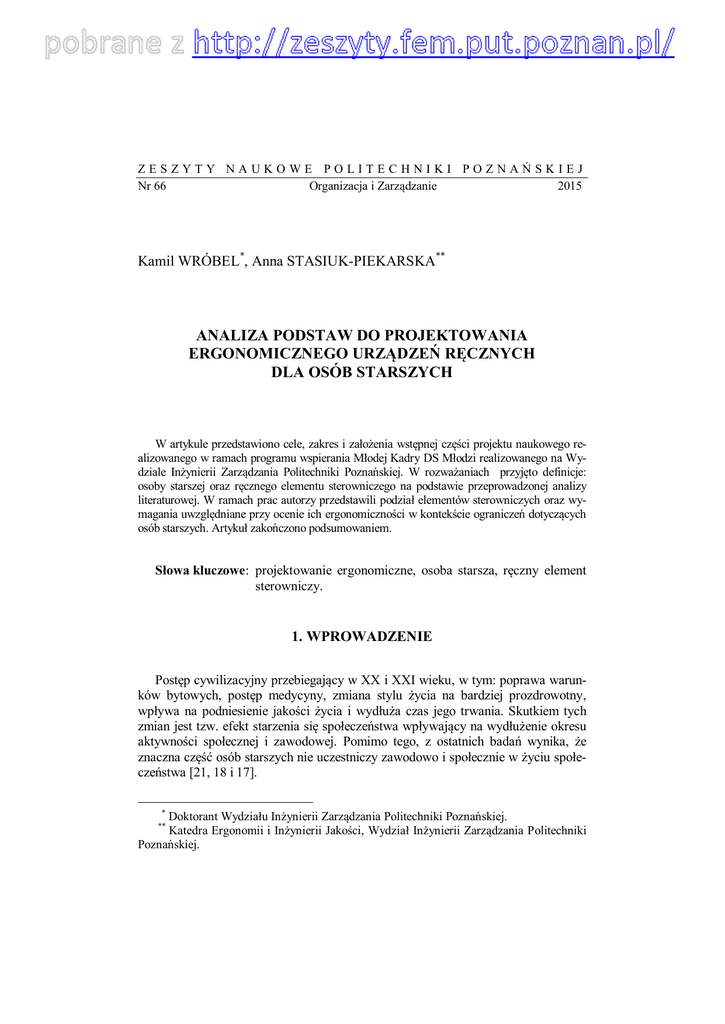 ZESZYTY NAUKOWE POLITECHNIKI POZNAŃSKIEJ Nr 66 Organizacja i Zarządzanie 2015 Kamil WRÓBEL*, Anna STASIUK-PIEKARSKA** ANALIZA PODSTAW DO PROJEKTOWANIA ERGONOMICZNEGO URZĄDZEŃ RĘCZNYCH DLA OSÓB STARSZYCH W artykule przedstawiono cele, zakres i założenia wstępnej części projektu naukowego realizowanego w ramach programu wspierania Młodej Kadry DS Młodzi realizowanego na Wydziale Inżynierii Zarządzania Politechniki Poznańskiej. W rozważaniach przyjęto definicje: osoby starszej oraz ręcznego elementu sterowniczego na podstawie przeprowadzonej analizy literaturowej. W ramach prac autorzy przedstawili podział elementów sterowniczych oraz wymagania uwzględniane przy ocenie ich ergonomiczności w kontekście ograniczeń dotyczących osób starszych. Artykuł zakończono podsumowaniem. Słowa kluczowe: projektowanie ergonomiczne, osoba starsza, ręczny element sterowniczy. 1. WPROWADZENIE Postęp cywilizacyjny przebiegający w XX i XXI wieku, w tym: poprawa warunków bytowych, postęp medycyny, zmiana stylu życia na bardziej prozdrowotny, wpływa na podniesienie jakości życia i wydłuża czas jego trwania. Skutkiem tych zmian jest tzw. efekt starzenia się społeczeństwa wpływający na wydłużenie okresu aktywności społecznej i zawodowej. Pomimo tego, z ostatnich badań wynika, że znaczna część osób starszych nie uczestniczy zawodowo i społecznie w życiu społeczeństwa [21, 18 i 17]. * Doktorant Wydziału Inżynierii Zarządzania Politechniki Poznańskiej. Katedra Ergonomii i Inżynierii Jakości, Wydział Inżynierii Zarządzania Politechniki Poznańskiej. ** 148 Kamil Wróbel, Anna Stasiuk-Piekarska Zauważa się, że polskie firmy nie są świadome nadchodzących zmian, których obecnie początek możemy obserwować w zmieniającej się strukturze demograficznej. Wyniki analizy potrzeb osób starszych w zakresie aktywacji zawodowej wskazują na niedostosowanie narzędzi pracy do osób starszych. Powodem tego jest brak skutecznych metod projektowania, w tym metod oceny ergonomicznej zorientowanych na potrzeby osób starszych [10].To właśnie nieodpowiednie dostosowanie narzędzi pracy stanowi główne problemy w zapewnieniu odpowiednich warunków aktywizacji zawodowej i społecznej analizowanej grupy demograficznej. Wpływa to m. in. na niską konkurencyjność osób starszych na rynku pracy. Jednym z problemów dostosowania urządzeń jest niedostosowanie ręcznych elementów sterowniczych (RES) do ich wymagań [24]. Celem niniejszego artykułu jest zdefiniowanie pojęcia osoby starszej i jej kategorii, zdefiniowanie ręcznych elementów sterowniczych, kategorii i sposobów ich aktywacji, a także przedstawienie wymagań w projektowaniu ergonomicznym ręcznych elementów sterowniczych dla osób starszych. 2. OSOBA STARSZA W ERGONOMII Ludzie nierozerwalnie związani są z procesami dojrzewania, którego efektem jest faza życia zwana starością. Osobę w tej fazie życia określa się jako osobę starszą. Rozważając problem projektowania ergonomicznego dla osób starszych, należy zdefiniować granice tego pojęcia oraz wyróżniające je własności. Cechy podeszłego wieku często nie mają charakteru dyskretnego. Podlegają one jednak ciągłym i długotrwałym zmianom utrudniając wyznaczenie jednoznacznych granic [4]. Pojęcie starości nie jest jednoznaczne, ponieważ jej subiektywna granica przesuwa się wraz z dojrzewaniem [40]. Jej niejednoznaczność wynika również z coraz dłuższej średniej życia, która uległa wyraźnemu wydłużeniu, jak i z indywidualnego tempa starzenia się ludzi, co wyraźnie widoczne jest pomiędzy populacją kobiet i mężczyzn [22]. Dla potrzeb klasyfikacyjno-projektowych wprowadzić należy umowną granicę starości. Wyróżnić można kilka kategorii, które mogą służyć jako kryterium do jej określenia [4, 42]: – biologiczne – moment spadku lub osiągnięcia określonej wartości przez wybrane funkcje fizjologiczne organizmu uwarunkowane limitem Hayflicka, promieniowaniem, wolnymi rodnikami, brakiem czynników wzrostu i niewłaściwą aktywacją genów, – społeczne – moment utraty, osłabienia posiadanych lub nabycia nowych funkcji w społeczeństwie, uwarunkowany m. in. trybem życia, – prawne – moment nabycia lub utraty określonych przywilejów prawnych o charakterze społeczno-ekonomicznym – moment przejścia na emeryturę, – metrykalne będące uproszczenie powyższych. Analiza podstaw do projektowania ergonomicznego urządzeń ręcznych … 149 Przyjmuje się, że starzenie się to proces postępującego upośledzenia funkcji organizmu, któremu towarzyszy utrata zdolności adaptacyjnych do zmian środowiskowych, spadek wydolności organizmu i zwiększenie się prawdopodobieństwa śmierci. Powoduje to coraz większe uzależnienie osoby starszej od pomocy innych ludzi. Natomiast starość jest utożsamiana z wiekiem kalendarzowym lub biologicznym [42]. W literaturze dotyczącej starości wskazuje się między innymi na następujące granice metrykalne: – od 45 lat [26], – od 55 lat [3], – od 60 lat [38, 19]. W powszechnym rozumieniu okres starości rozpoczyna się wraz z osiągnięciem wieku emerytalnego. Granica ta również ulega przesunięciu z powodu wydłużenia się średniej długości życia. Na wiek emerytalny mają także wpływ tzw. przywileje emerytalne określonych grup zawodowych. Dlatego kryterium prawne traci znaczenie w określaniu granic starości. Ponadto należy pamiętać, że kryterium prawne ściśle wynika z kryterium biologicznego, społecznego i ekonomicznego populacji danego państwa, a w różnych państwach wiek emerytalny jest inny. W literaturze można znaleźć trzy grupy osób starszych [22]: – osoba starsza (65–74 lat), – osoba stara (75–85 lat), – osoba bardzo stara (powyżej 85 roku życia). Ponadto w literaturze znaleźć można rozwinięcia kategorii starości nawet na cztery etapy [1]: – od 60 do 69 lat – starość pocz