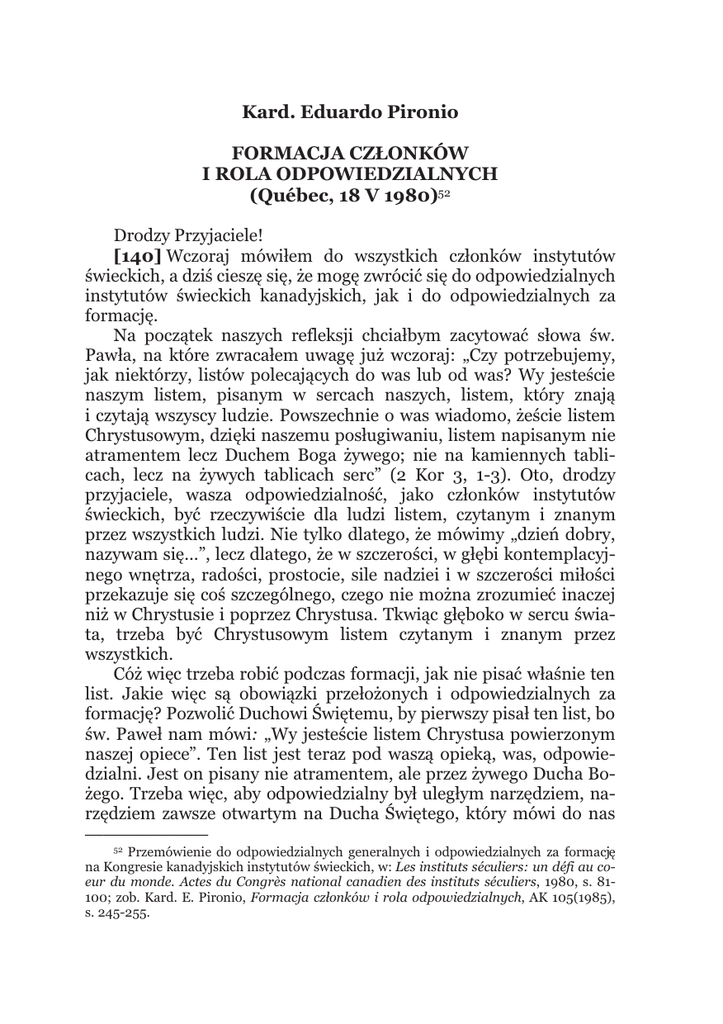 Kard. Eduardo Pironio FORMACJA CZŁONKÓW I ROLA