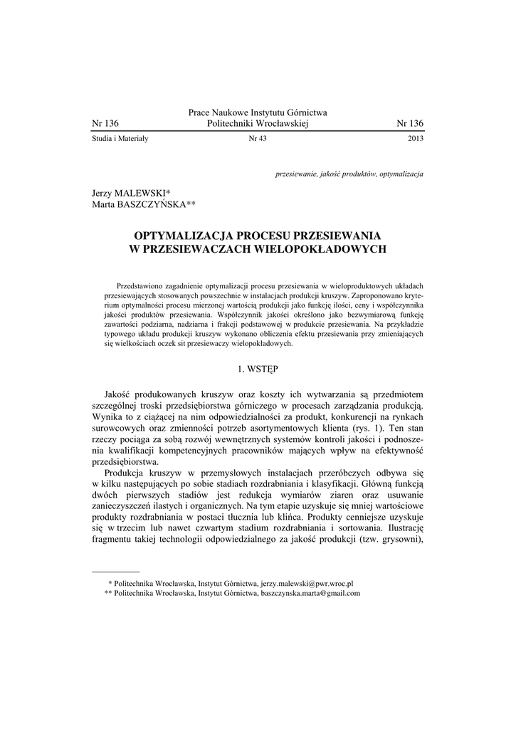 Prace Naukowe Instytutu Górnictwa Politechniki Wrocławskiej Nr 136 Studia i Materiały Nr 43 Nr 136 2013 przesiewanie, jakość produktów, optymalizacja Jerzy MALEWSKI* Marta BASZCZYŃSKA** OPTYMALIZACJA PROCESU PRZESIEWANIA W PRZESIEWACZACH WIELOPOKŁADOWYCH Przedstawiono zagadnienie optymalizacji procesu przesiewania w wieloproduktowych układach przesiewających stosowanych powszechnie w instalacjach produkcji kruszyw. Zaproponowano kryterium optymalności procesu mierzonej wartością produkcji jako funkcję ilości, ceny i współczynnika jakości produktów przesiewania. Współczynnik jakości określono jako bezwymiarową funkcję zawartości podziarna, nadziarna i frakcji podstawowej w produkcie przesiewania. Na przykładzie typowego układu produkcji kruszyw wykonano obliczenia efektu przesiewania przy zmieniających się wielkościach oczek sit przesiewaczy wielopokładowych. 1. WSTĘP Jakość produkowanych kruszyw oraz koszty ich wytwarzania są przedmiotem szczególnej troski przedsiębiorstwa górniczego w procesach zarządzania produkcją. Wynika to z ciążącej na nim odpowiedzialności za produkt, konkurencji na rynkach surowcowych oraz zmienności potrzeb asortymentowych klienta (rys. 1). Ten stan rzeczy pociąga za sobą rozwój wewnętrznych systemów kontroli jakości i podnoszenia kwalifikacji kompetencyjnych pracowników mających wpływ na efektywność przedsiębiorstwa. Produkcja kruszyw w przemysłowych instalacjach przeróbczych odbywa się w kilku następujących po sobie stadiach rozdrabniania i klasyfikacji. Główną funkcją dwóch pierwszych stadiów jest redukcja wymiarów ziaren oraz usuwanie zanieczyszczeń ilastych i organicznych. Na tym etapie uzyskuje się mniej wartościowe produkty rozdrabniania w postaci tłucznia lub klińca. Produkty cenniejsze uzyskuje się w trzecim lub nawet czwartym stadium rozdrabniania i sortowania. Ilustrację fragmentu takiej technologii odpowiedzialnego za jakość produkcji (tzw. grysowni), __________ * Politechnika Wrocławska, Instytut Górnictwa, [email protected] ** Politechnika Wrocławska, Instytut Górnictwa, [email protected] 100 oddzielonej zwykle od 1 stadium – układu wstępnego kruszenia – zbiornikiem dużej pojemności przedstawia rysunek 6. Główne cechy jakościowe finalnych produktów to odpowiednie uziarnienie, płaskość oraz kształt ziaren badanych według norm PN EN. Jednocześnie wielkość ziaren oraz ich kształt istotnie wpływają na sprawność procesów klasyfikacji (sortowania). Podstawowym problemem jest w tym wypadku uzyskanie odpowiednich proporcji nadziarna, podziarna i frakcji podstawowej w finalnych produktach układów przesiewających. Oznacza to, że w takich produktach zawartość frakcji nominalnej �1��2 musi być nie mniejsza od pewnej wartości c, a ilość podziarna (ziaren mniejszych od �1) i nadziarna b (ziaren większych od �2) jest również ograniczona do pewnych założonych granic ustalonych w odpowiednich normach branżowych oraz wymaganiach i specyfikacjach technicznych odbiorcy. Producent kruszywa staje więc przed problemem sprostania tym wymaganiom przy jak największych korzyściach handlowych. Jest to typowe zadanie optymalizacyjne, ponieważ jakość produktów (struktura uziarnienia, kształt ziaren) oraz ich ilość pozostają do siebie w relacjach przeciwnych i wzajemnie zależnych (rys. 2). Rys. 1. Zależność jakościowo-ilościowa kopalnictwa, przeróbki i zastosowań w górnictwie skalnym Fig. 1. Dependence of quality-quantitative in quarrying, mineral processing and applications in rock mining W całości jest to proces bardzo złożony i jego optymalizacja w praktyce odbywa się metodą prób i błędów. O ile zagadnienie modelowania tego typu operacji jest dość dobrze rozpoznane teoretycznie i praktycznie [1–3], to optymalizacja takiego zagadnienia nie jest już sprawą oczywistą i prostą. Problem leży w sformułowaniu odpo- 101 wiedniego kryterium optymalizacji. W artykule tym przedstawiono koncepcję takiego kryterium i pokazano sposób jego wykorzystania na przykładach liczbowych analizy typowego układu przeróbczego kruszyw. Jego konstrukcja może być rozwijana w oparciu o znajomość technologii produkcji kruszyw i dobrego rozpoznania wymagań jakościowych odbiorców. 2. PRAKTYKA PRZESIEWANIA Instalacje przemysłowe zaprojektowane w celu otrzymania szerokiego asortymentu, uzyskują produkty na kilku kolejnych, wielopokładowych przesiewaczach. Na przykład frakcje 2-5, 5-8, 8-11, 11-16, 16-22 można uzyskać w układzie dwóch przesiewaczy (rys. 3). Nominalna, najmniejsza szerokość frakcji produktów przesiewania wynosi tu zaledwie 3 mm, co sprawia, że producenci mają wielkie trudności w uzyskaniu przy takim programie produkcji właściwej struktury uziarnienia instalacjach przeróbczych. #22 #16 #11 #8 #5 #2 Rys. 2. Jakość i ilość jako zagadnienie optymalizacyjne Fig. 2. The quality and quantity as an optimization issue Rys. 3. Typowe układy sit w przesiewaczach Fig. 3. Typical sieves systems at screens 102 Technologowie próbują ten problem rozwiązywać różnymi sposobami. Przede wszystkich ucieczką od produkcji wąskich frakcji na rzecz sortymentów o szerszym uziarnieniu, np. 2-8, 8-16. Ale tam, gdzie tego nie można zrobić manipuluje się wielkościami oczek sit sąsiednich pokładów albo różnicowaniem tych średnic w poszczególnych segmentach jednego pokładu [2]. Praktyczny przykład takiego rozwiązania przedstawia rys. 4. Widzimy tu zróżnicowanie wielkości oczek sit w pionie i poziomie drogi przepływu przesiewanej nadawy. Całość procesu dochodzenia do pożądanych efektów odbywa się metodą prób i błędów. Efekty takiego postępowania są najczęściej niezadowalające, ponieważ nie sposób jest w warunkach produkcyjnych wypróbować wszelkie możliwe kombinacje parametrów przesiewania z uwzględnieniem Rys. 4. Przykład z praktyki produkcyjnej wpływu kruszarek na ten p