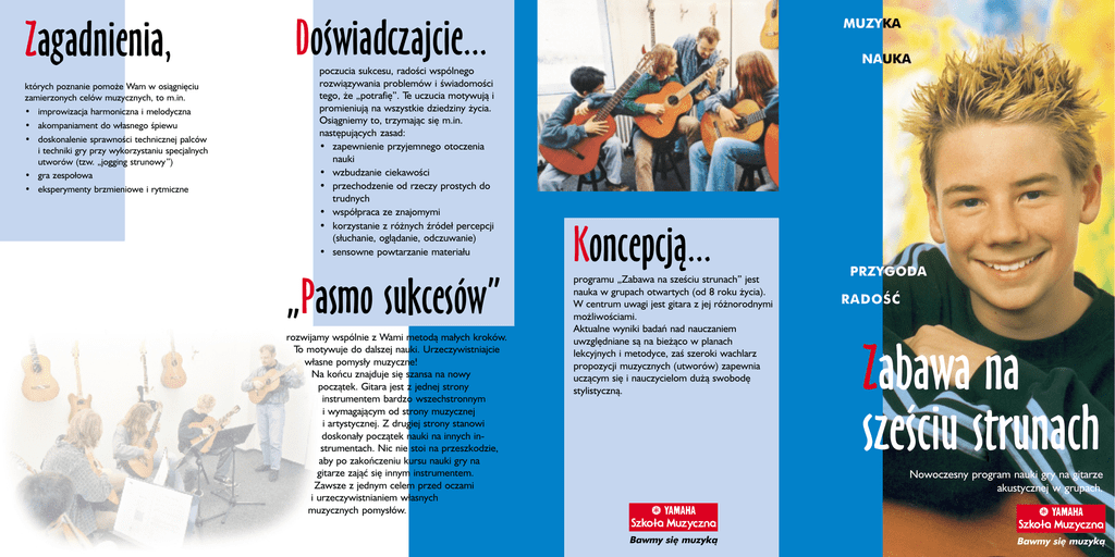 Zagadnienia, których poznanie pomoże Wam w osiągnięciu zamierzonych celów muzycznych, to m.in. • improwizacja harmoniczna i melodyczna • akompaniament do własnego śpiewu • doskonalenie sprawności technicznej palców i techniki gry przy wykorzystaniu specjalnych utworów (tzw. „jogging strunowy”) • gra zespołowa • eksperymenty brzmieniowe i rytmiczne MUZYKA Doświadczajcie... poczucia sukcesu, radości wspólnego rozwiązywania problemów i świadomości tego, że „potrafię”. Te uczucia motywują i promieniują na wszystkie dziedziny życia. Osiągniemy to, trzymając się m.in. następujących zasad: • zapewnienie przyjemnego otoczenia nauki • wzbudzanie ciekawości • przechodzenie od rzeczy prostych do trudnych • współpraca ze znajomymi • korzystanie z różnych źródeł percepcji (słuchanie, oglądanie, odczuwanie) • sensowne powtarzanie materiału „Pasmo sukcesów” rozwijamy wspólnie z Wami metodą małych kroków. To motywuje do dalszej nauki. Urzeczywistniajcie własne pomysły muzyczne! Na końcu znajduje się szansa na nowy początek. Gitara jest z jednej strony instrumentem bardzo wszechstronnym i wymagającym od strony muzycznej i artystycznej. Z drugiej strony stanowi doskonały początek nauki na innych instrumentach. Nic nie stoi na przeszkodzie, aby po zakończeniu kursu nauki gry na gitarze zająć się innym instrumentem. Zawsze z jednym celem przed oczami i urzeczywistnianiem własnych muzycznych pomysłów. NAUKA Koncepcją... programu „Zabawa na sześciu strunach” jest nauka w grupach otwartych (od 8 roku życia). W centrum uwagi jest gitara z jej różnorodnymi możliwościami. Aktualne wyniki badań nad nauczaniem uwzględniane są na bieżąco w planach lekcyjnych i metodyce, zaś szeroki wachlarz propozycji muzycznych (utworów) zapewnia uczącym się i nauczycielom dużą swobodę stylistyczną. PRZYGODA RADOŚĆ Zabawa na sześciu strunach Nowoczesny program nauki gry na gitarze akustycznej w grupach. Bawmy się muzyką Bawmy się muzyką Zabawa na sześciu strunach Samodzielnie... Orkan rozeznacie w jaki sposób najskuteczniej można się uczyć. Pomożemy Wam w tym. Od ponad 40 lat prowadzimy badania w zakresie pedagogiki muzycznej, aby skuteczne, choć jednocześnie łatwe i przyjemne, metody uczenia się, przybliżyć każdemu. Bez przesady możemy powiedzieć, że: jesteśmy ekspertami w dziedzinie nauczania grupowego. Szczególnie ważne jest dla nas twórcze podejście do elementów muzyki. Ta dziedzina, jak żadna inna, przydaje się w kształceniu gitarzystów, w wyrabianiu ich reakcji na odmienne sytuacje muzyczne. Siła wiatru 11. Liście wirują w powietrzu. Wichura szaleje z rykiem wzdłuż ulicy. Ogień trzaska wesoło w kominku. Przyjemne ciepło wypełnia pokój. Dźwięk gitary okrągły, miękki i ciepły wprowadza błogi nastrój. Brzmi znana melodia. Sen? Wspólne O trzaskający ogień w kominku i 11-stopniowy orkan niech martwią się inni. My znajdziemy właściwy dźwięk przy kominku, przy ognisku lub w sali koncertowej. uczenie daje więcej radości, zupełnie inaczej niż w szkole. W małych grupach, z nowoczesnymi podręcznikami i ciekawymi playback’ami na CD. Praktyka przed teorią, Tak brzmi podstawowa zasada naszych sprawdzonych koncepcji i metod, według których można nauczyć się łatwiej i szybciej. Nie marnujcie swojego czasu na nudne i bezsensowne ćwiczenia. Grajcie atrakcyjne utwory muzyczne od pierwszej lekcji. Wasze rodziny, przyjaciele i znajomi będą zaskoczeni. Z naszym programem „Zabawa na sześciu strunach” osiągniecie swoje muzyczne cele stopniowo i pewnie. Prowadzeni przez Waszego doradcę i towarzystwie Waszej grupy lekcyjnej.