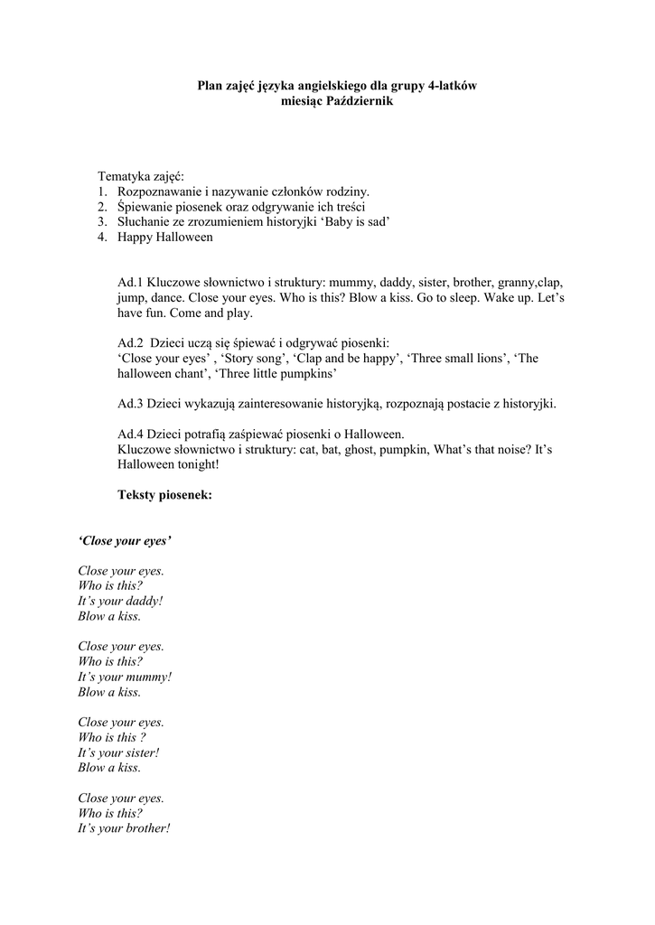 Plan zajęć języka angielskiego dla grupy 4-latków miesiąc Październik Tematyka zajęć: 1. Rozpoznawanie i nazywanie członków rodziny. 2. Śpiewanie piosenek oraz odgrywanie ich treści 3. Słuchanie ze zrozumieniem historyjki ‘Baby is sad’ 4. Happy Halloween Ad.1 Kluczowe słownictwo i struktury: mummy, daddy, sister, brother, granny,clap, jump, dance. Close your eyes. Who is this? Blow a kiss. Go to sleep. Wake up. Let’s have fun. Come and play. Ad.2 Dzieci uczą się śpiewać i odgrywać piosenki: ‘Close your eyes’ , ‘Story song’, ‘Clap and be happy’, ‘Three small lions’, ‘The halloween chant’, ‘Three little pumpkins’ Ad.3 Dzieci wykazują zainteresowanie historyjką, rozpoznają postacie z historyjki. Ad.4 Dzieci potrafią zaśpiewać piosenki o Halloween. Kluczowe słownictwo i struktury: cat, bat, ghost, pumpkin, What’s that noise? It’s Halloween tonight! Teksty piosenek: ‘Close your eyes’ Close your eyes. Who is this? It’s your daddy! Blow a kiss. Close your eyes. Who is this? It’s your mummy! Blow a kiss. Close your eyes. Who is this ? It’s your sister! Blow a kiss. Close your eyes. Who is this? It’s your brother! Blow a kiss. ‘Story song’ Hush baby, don’t cry! Baby, baby, go to sleep. Daddy’s here, mummy’s here, Sister’s here, brother’s here, Cheeky’s here, Cheeky’s here! Close your eyes and go to sleep. ‘The Halloween chant’ What’s that noise? What’s that niose? It’s Halloween tonight! Look! It’s a cat. Miaow, miaow, miaow? What’s that noise? What’s that niose? It’s Halloween tonight! Look! It’s a bat. Flap, flap, flap! What’s that niose? What’s that noise? It’s Halloween tonight! Look! it’s a ghost. Woo, woo, woo! ‘Three little pumpkins’ One, two, three, little pumpkins. One, two, three little pumpkins. One two three little pumpkins Three little pumpkins for Halloween. Three, two, one little pumpkin. Three, two, one little pumpkin. Three, two, one little pumpkin. One little pumpkin for Halloween.