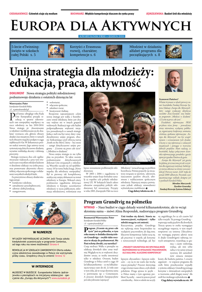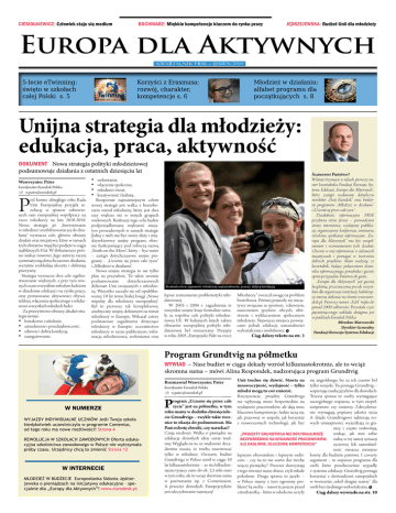 CIESIOŁKIEWICZ: Człowiek staje się medium BOCHNIARZ: Miękkie kompetencje kluczem do rynku pracy JĘDRZEJEWSKA: Budżet Unii dla młodzieży Europa dla Aktywnych KWARTALNIK FRSE – JESIEŃ 2010 5-lecie eTwinning: święto w szkołach całej Polski s. 5 Korzyści z Erasmusa: rozwój, charakter, kompetencje s. 6 Młodzież w działaniu: alfabet programu dla początkujących s. 8 Unijna strategia dla młodzieży: edukacja, praca, aktywność Dokument Nowa strategia polityki młodzieżowej podsumowuje działania z ostatnich dziesięciu lat • wolontariat, Wawrzyniec Pater • włączenie społeczne, koordynator Eurodesk Polska • młodzież i świat, [email protected] • kreatywność i kulturę. P od koniec ubiegłego roku Rada Unii Europejskiej przyjęła rezolucję w sprawie odnowionych ram europejskiej współpracy na rzecz młodzieży na lata 2010-2018. Nowa strategia pt. „Inwestowanie w młodzież i mobilizowanie jej do działania” wyznacza cele, główne obszary działań oraz inicjatywy, które w ramach tych obszarów mają być podjęte w ciągu najbliższych 8 lat. W dokumencie próżno szukać nowości. Jego autorzy raczej systematyzują dotychczasowe działania, wyraźnie rozkładają akcenty i definiują priorytety. Strategia wyznacza dwa cele ogólne: stwarzanie większych, a przy tym równych szans wszystkim młodym ludziom w dziedzinie edukacji i na rynku pracy; oraz promowanie aktywności obywatelskiej, włączenia społecznego i solidarności wszystkich młodych ludzi. Za priorytetowe obszary działań strategia uznaje: • kształcenie i szkolenie, • zatrudnienie i przedsiębiorczość, • zdrowie i dobrą kondycję, • zaangażowanie, Bezspornie najważniejszym celem nowej strategii jest walka z bezrobociem wśród młodzieży, które jest dwa razy większe niż w innych grupach wiekowych. Realizacji tego celu będzie podporządkowana większość inicjatyw prowadzonych w ramach strategii. Jedną z nich ma być nowy duży i międzysektorowy unijny program, obecnie funkcjonujący pod roboczą nazwą „Youth on the Move”, który – być może – zastąpi dotychczasowe unijne programy – „Uczenie się przez całe życie” i „Młodzież w działaniu”. Nowa unijna strategia to nie tylko plan na przyszłość. To także swoiste podsumowanie dotychczasowych dokonań Unii związanych z młodzieżą. Wszystko zaczęło się od opublikowanej 10 lat temu białej księgi „Nowe impulsy dla młodzieży europejskiej”. Był to pierwszy tak kompleksowy, analityczny unijny dokument na temat młodzieży w Europie. Wskazał cztery podstawowe zagadnienia dotyczące młodzieży w Europie: uczestnictwo młodzieży w życiu publicznym, informacja młodzieżowa, wolontariat oraz Bruksela chce zapewnić młodzieży wykształcenie, pracę i dobrą kondycję lepsze zrozumienie problematyki młodzieżowej. W 2003 i 2004 r. zagadnienia te wszystkie unijne kraje formalnie uznały za wspólne cele polityki młodzieżowej UE. W kolejnych latach zakres obszarów europejskiej polityki młodzieżowej był rozszerzany. Przyjęty w roku 2005 „Europejski Pakt na rzecz Młodzieży” zwracał uwagę na problem bezrobocia. Później pojawiły się inicjatywy związane ze sportem, zdrowiem, nauczaniem języków obcych, ubóstwem i wykluczeniem społecznym młodzieży. Najwięcej miejsca poświęcano jednak edukacji, uznawalności wykształcenia i mobilności. • Ciąg dalszy tekstu na str. 3 Szanowni Państwo! Właśnie trzymacie w rękach pierwszy numer kwartalnika Fundacji Rozwoju Systemu Edukacji „Europa dla Aktywnych”, który zastąpi wydawany dotychczas newsletter „Twój Eurodesk” oraz biuletyny programów „Młodzież w działaniu” i „Uczenie się przez całe życie”. Działalność informacyjna FRSE przybiera różne formy – prowadzimy strony internetowe, wydajemy publikacje, organizujemy konferencje, seminaria, szkolenia, spotkania informacyjne. „Europa dla Aktywnych” ma być uzupełnieniem i wzmocnieniem tych działań. Chcemy w niej informować o ciekawych inicjatywach i pomagać w tworzeniu dobrych projektów. Mam nadzieję, że kwartalnik, będący połączeniem dziennika informacyjnego, poradnika i gazety opinii przypadnie Państwu do gustu. „Europa dla Aktywnych” jest gazetą bezpłatną, przeznaczoną przede wszystkim dla organizacji i instytucji. Subskrypcji można dokonać na stronie www.eurodesk.pl. Pierwszy numer „EdA” trafia do ponad 2000 odbiorców. Pozostała część pięciotysięcznego nakładu dostępna jest w punktach Eurodesk Polska. Mirosław Marczewski Dyrektor Generalny Fundacji Rozwoju Systemu Edukacji Program Grundtvig na półmetku wywiad – Nasz budżet w ciągu dekady wzrósł kilkunastokrotnie, ale to wciąż skromna suma – mówi Alina Respondek, nadzorująca program Grundtvig Rozmawiał Wawrzyniec Pater koordynator Eurodesk Polska [email protected] W NUMERZE WYJAZDY INDYWIDUALNE UCZNIÓW Jeśli Twoja szkoła kiedykolwiek uczestniczyła w programie Comenius, od tego roku ma nowe możliwości! Strona 4 REWOLUCJA W SZKOŁACH ZAWODOWYCH Oferta edukacyjna szkolnictwa zawodowego w Polsce nie wytrzymała próby czasu. Urzędnicy chcą to zmienić Strona 12 W INTERNECIE MŁODZIEŻ W BUDŻECIE Europosłanka Sidonia Jędrzejewska o pieniądzach na inicjatywy edukacyjne – specjalnie dla „Europy dla Aktywnych”! www.eurodesk.pl P rogram „Uczenie się przez całe życie” jest na półmetku, w tym roku mamy w dodatku dziesięciolecie Grundtviga – zwykle takie rocznice to okazja do podsumowań. Ma Pani ochotę chwalić, czy narzekać? Czuję niedosyt. Walka o pieniądze na edukację dorosłych idzie coraz trudniej. Wygląda na to, że większość decydentów uważa, że trzeba inwestować tylko w młodzież. Owszem, budżet Grundtviga w Polsce urósł w ciągu 10 lat kilkunastokrotnie – ze stu kilkudziesięciu tysięcy euro do ok. 2,5 mln euro w tym roku, ale to wciąż skromna suma w porównaniu np. z Comeniuse