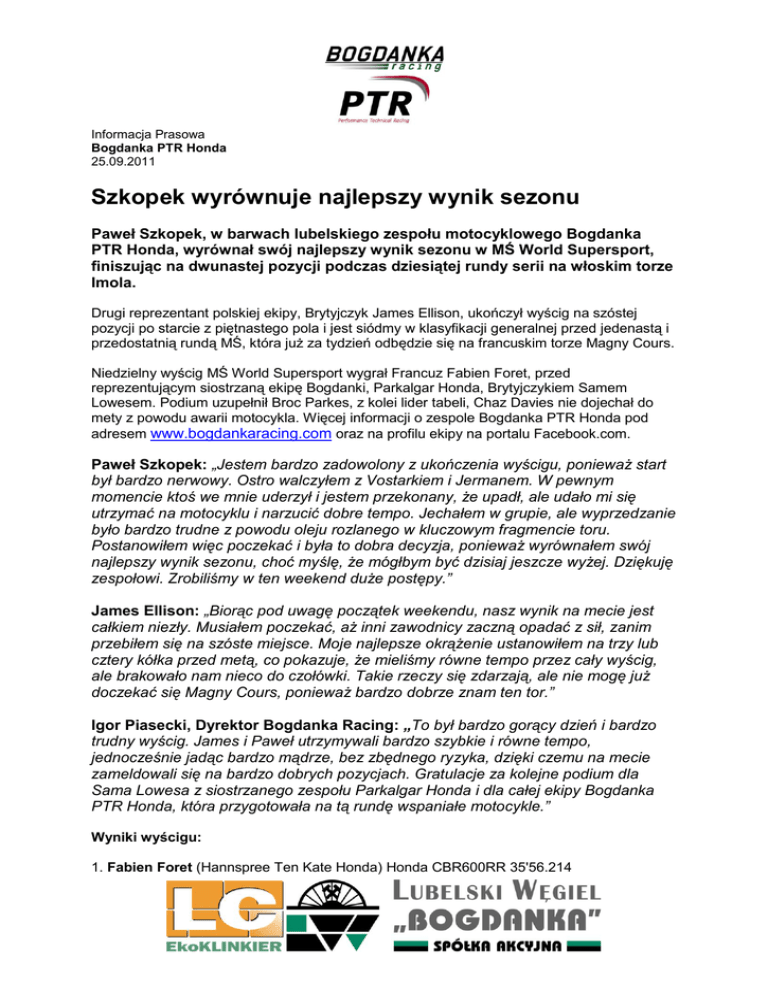 Informacja Prasowa Bogdanka PTR Honda 25.09.2011 Szkopek wyrównuje najlepszy wynik sezonu Paweł Szkopek, w barwach lubelskiego zespołu motocyklowego Bogdanka PTR Honda, wyrównał swój najlepszy wynik sezonu w MŚ World Supersport, finiszując na dwunastej pozycji podczas dziesiątej rundy serii na włoskim torze Imola. Drugi reprezentant polskiej ekipy, Brytyjczyk James Ellison, ukończył wyścig na szóstej pozycji po starcie z piętnastego pola i jest siódmy w klasyfikacji generalnej przed jedenastą i przedostatnią rundą MŚ, która już za tydzień odbędzie się na francuskim torze Magny Cours. Niedzielny wyścig MŚ World Supersport wygrał Francuz Fabien Foret, przed reprezentującym siostrzaną ekipę Bogdanki, Parkalgar Honda, Brytyjczykiem Samem Lowesem. Podium uzupełnił Broc Parkes, z kolei lider tabeli, Chaz Davies nie dojechał do mety z powodu awarii motocykla. Więcej informacji o zespole Bogdanka PTR Honda pod adresem www.bogdankaracing.com oraz na profilu ekipy na portalu Facebook.com. Paweł Szkopek: „Jestem bardzo zadowolony z ukończenia wyścigu, ponieważ start był bardzo nerwowy. Ostro walczyłem z Vostarkiem i Jermanem. W pewnym momencie ktoś we mnie uderzył i jestem przekonany, że upadł, ale udało mi się utrzymać na motocyklu i narzucić dobre tempo. Jechałem w grupie, ale wyprzedzanie było bardzo trudne z powodu oleju rozlanego w kluczowym fragmencie toru. Postanowiłem więc poczekać i była to dobra decyzja, ponieważ wyrównałem swój najlepszy wynik sezonu, choć myślę, że mógłbym być dzisiaj jeszcze wyżej. Dziękuję zespołowi. Zrobiliśmy w ten weekend duże postępy.” James Ellison: „Biorąc pod uwagę początek weekendu, nasz wynik na mecie jest całkiem niezły. Musiałem poczekać, aż inni zawodnicy zaczną opadać z sił, zanim przebiłem się na szóste miejsce. Moje najlepsze okrążenie ustanowiłem na trzy lub cztery kółka przed metą, co pokazuje, że mieliśmy równe tempo przez cały wyścig, ale brakowało nam nieco do czołówki. Takie rzeczy się zdarzają, ale nie mogę już doczekać się Magny Cours, ponieważ bardzo dobrze znam ten tor.” Igor Piasecki, Dyrektor Bogdanka Racing: „To był bardzo gorący dzień i bardzo trudny wyścig. James i Paweł utrzymywali bardzo szybkie i równe tempo, jednocześnie jadąc bardzo mądrze, bez zbędnego ryzyka, dzięki czemu na mecie zameldowali się na bardzo dobrych pozycjach. Gratulacje za kolejne podium dla Sama Lowesa z siostrzanego zespołu Parkalgar Honda i dla całej ekipy Bogdanka PTR Honda, która przygotowała na tą rundę wspaniałe motocykle.” Wyniki wyścigu: 1. Fabien Foret (Hannspree Ten Kate Honda) Honda CBR600RR 35'56.214 2. Sam Lowes (Parkalgar Honda) Honda CBR600RR 35'56.380 3. Broc Parkes (Kawasaki Motocard.com) Kawasaki ZX-6R 35'58.713 4. Florian Marino (Hannspree Ten Kate Honda) Honda CBR600RR 36'00.047 5. David Salom (Kawasaki Motocard.com) Kawasaki ZX-6R 36'02.539 6. James Ellison (Bogdanka PTR Honda) Honda CBR600RR 36'18.086 7. Vittorio Iannuzzo (Lorenzini by Leoni) Kawasaki ZX-6R 36'22.040 8. Miguel Praia (Parkalgar Honda) Honda CBR600RR 36'23.767 9. Stefano Cruciani (Puccetti R. Kawasaki Italia) Kawasaki ZX-6R 36'26.258 10. Danilo Dell'Omo (Suriano Racing Team) Triumph Daytona 675 36'27.354 11. Gino Rea (Step Racing Team) Honda CBR600RR 36'28.426 12. Paweł Szkopek (Bogdanka PTR Honda) Honda CBR600RR 36'29.059 13. Patrik Vostàrek (Prorace) Honda CBR600RR 36'29.616 14. Ondrej Jezek (SMS Racing) Honda CBR600RR 36'38.851 15. Imre Toth (Team Hungary Toth) Honda CBR600RR 36'39.391 *** Przygotowanie i dystrybucja w imieniu Bogdanka PTR Honda / kontakt dla mediów: Media4Racing Michał Fiałkowski , [email protected] , tel. kom. 782 676 126