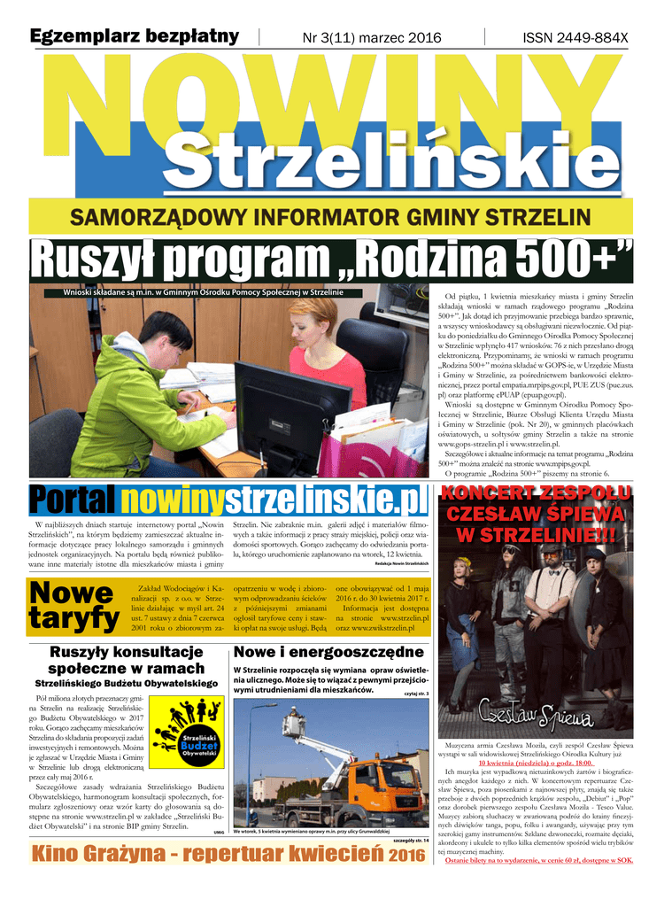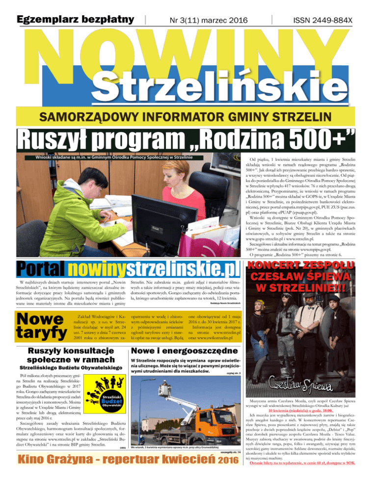 Egzemplarz bezpłatny Nr 3(11) marzec 2016 ISSN 2449-884X Ruszył program „Rodzina 500+” Wnioski składane są m.in. w Gminnym Ośrodku Pomocy Społecznej w Strzelinie Portal nowinystrzelinskie.pl W najbliższych dniach startuje internetowy portal „Nowin Strzelińskich”, na którym będziemy zamieszczać aktualne informacje dotyczące pracy lokalnego samorządu i gminnych jednostek organizacyjnych. Na portalu będą również publikowane inne materiały istotne dla mieszkańców miasta i gminy Nowe taryfy Zakład Wodociągów i Kanalizacji sp. z o.o. w Strzelinie działając w myśl art. 24 ust. 7 ustawy z dnia 7 czerwca 2001 roku o zbiorowym za- Ruszyły konsultacje społeczne w ramach Strzelin. Nie zabraknie m.in. galerii zdjęć i materiałów filmowych a także informacji z pracy straży miejskiej, policji oraz wiadomości sportowych. Gorąco zachęcamy do odwiedzania portalu, którego uruchomienie zaplanowano na wtorek, 12 kwietnia. Pół miliona złotych przeznaczy gmina Strzelin na realizację Strzelińskiego Budżetu Obywatelskiego w 2017 roku. Gorąco zachęcamy mieszkańców Strzelina do składania propozycji zadań inwestycyjnych i remontowych. Można je zgłaszać w Urzędzie Miasta i Gminy w Strzelinie lub drogą elektroniczną przez cały maj 2016 r. Szczegółowe zasady wdrażania Strzelińskiego Budżetu Obywatelskiego, harmonogram konsultacji społecznych, formularz zgłoszeniowy oraz wzór karty do głosowania są dostępne na stronie www.strzelin.pl w zakładce „Strzeliński Budżet Obywatelski” i na stronie BIP gminy Strzelin. UMiG Redakcja Nowin Strzelińskich opatrzeniu w wodę i zbiorowym odprowadzaniu ścieków z późniejszymi zmianami ogłosił taryfowe ceny i stawki opłat na swoje usługi. Będą one obowiązywać od 1 maja 2016 r. do 30 kwietnia 2017 r. Informacja jest dostępna na stronie www.strzelin.pl oraz www.zwikstrzelin.pl W Strzelinie rozpoczęła się wymiana opraw oświetlenia ulicznego. Może się to wiązać z pewnymi przejściowymi utrudnieniami dla mieszkańców. czytaj str. 3 We wtorek, 5 kwietnia wymieniano oprawy m.in. przy ulicy Grunwaldzkiej szczegóły str. 14 Kino Grażyna - repertuar kwiecień 2016 Sobota 1 .04.2016 KONCERT ZESPOŁU CZESŁAW ŚPIEWA W STRZELINIE!!! Nowe i energooszczędne Strzelińskiego Budżetu Obywatelskiego Piątek Od piątku, 1 kwietnia mieszkańcy miasta i gminy Strzelin składają wnioski w ramach rządowego programu „Rodzina 500+”. Jak dotąd ich przyjmowanie przebiega bardzo sprawnie, a wszyscy wnioskodawcy są obsługiwani niezwłocznie. Od piątku do poniedziałku do Gminnego Ośrodka Pomocy Społecznej w Strzelinie wpłynęło 417 wniosków. 76 z nich przesłano drogą elektroniczną. Przypominamy, że wnioski w ramach programu „Rodzina 500+” można składać w GOPS-ie, w Urzędzie Miasta i Gminy w Strzelinie, za pośrednictwem bankowości elektronicznej, przez portal empatia.mrpips.gov.pl, PUE ZUS (pue.zus. pl) oraz platformę ePUAP (epuap.gov.pl). Wnioski są dostępne w Gminnym Ośrodku Pomocy Społecznej w Strzelinie, Biurze Obsługi Klienta Urzędu Miasta i Gminy w Strzelinie (pok. Nr 20), w gminnych placówkach oświatowych, u sołtysów gminy Strzelin a także na stronie www.gops-strzelin.pl i www.strzelin.pl. Szczegółowe i aktualne informacje na temat programu „Rodzina 500+” można znaleźć na stronie www.mpips.gov.pl. O programie „Rodzina 500+” piszemy na stronie 6. Niedziela 2 .04.2016 Poniedziałek 3 .04.2016 Muzyczna armia Czesława Mozila, czyli zespół Czesław Śpiewa wystąpi w sali widowiskowej Strzelińskiego Ośrodka Kultury już 10 kwietnia (niedziela) o godz. 18:00. Ich muzyka jest wypadkową nietuzinkowych żartów i biograficznych anegdot każdego z nich. W koncertowym repertuarze Czesław Śpiewa, poza piosenkami z najnowszej płyty, znajdą się także przeboje z dwóch poprzednich krążków zespołu, „Debiut” i „Pop” oraz dorobek pierwszego zespołu Czesława Mozila - Tesco Value. Muzycy zabiorą słuchaczy w zwariowaną podróż do krainy finezyjnych dźwięków tanga, popu, folku i awangardy, używając przy tym szerokiej gamy instrumentów. Szklane dzwoneczki, rozmaite dęciaki, akordeony i ukulele to tylko kilka elementów spośród wielu trybików tej muzycznej machiny. Ostanie bilety na to wydarzenie, w cenie 60 zł, dostępne w SOK. tani 4 .04.2016 2 Nr 3(11) marzec 2016 Poprawią bezpieczeństwo i wizerunek STRZELIN Rusza akcja „Wiosenne Sprzątanie w Gminie Strzelin” W marcu, w strzelińskim rynku zamontowano stylowe słupki zabezpieczające. To drugi Szanowni Państwo, etap wprowadzania nowej organizacji ruchu Nadeszła wiosna, pora drogowego w tej części miasta. roku kiedy każdy z nas planu- Słupki mają poprawić bezpieczeństwo pieszych i kierowców oraz wizerunek centralnej części Strzelina. - Po 6 miesiącach od wprowadzenia organizacji, obserwujemy, że wielu kierowców nie respektuje obowiązujących przepisów. Parkują m.in. na polach wyłączonych z ruchu, zastawiają dojścia dla pieszych, mimo że donice z krzewami są jasnym sygnałem, iż pomiędzy nimi nie wolno parkować, zastawiają też wjazdy na drogi wewnętrzne rynku – mówi Katarzyna Jachowicz z Urzędu Miasta i Gminy w Strzelinie. W rynku zamontowano łącznie 60 słupków. - Jest to znacząca zmiana w wizerunku rynku, tak samo jak oznakowanie poziome. Myślę, że mieszkańcy na pewno szybko się do niej przyzwyczają. Część słupków jest składana, co umożliwi w razie konieczności przejazd pojazdom uprzywilejowanym oraz służbom miejskim – wyjaśnia Katarzyna Jachowicz. - W przyszłości planujemy, aby takie same żeliwne słupki z herbem Strzelina, były montowane również w innych częściach miasta – dodaje urzędniczka. UMiG Wydawca: Strzeliński Ośrodek Kultury Adres i siedziba redakcji: ul. Mickiewicza 2, 57-100 Strzelin Tel.: 71 39 215 34, 721 095 818, E-mail: [email protected] Redaktor naczelny: Mirosława Szychowiak Redagują