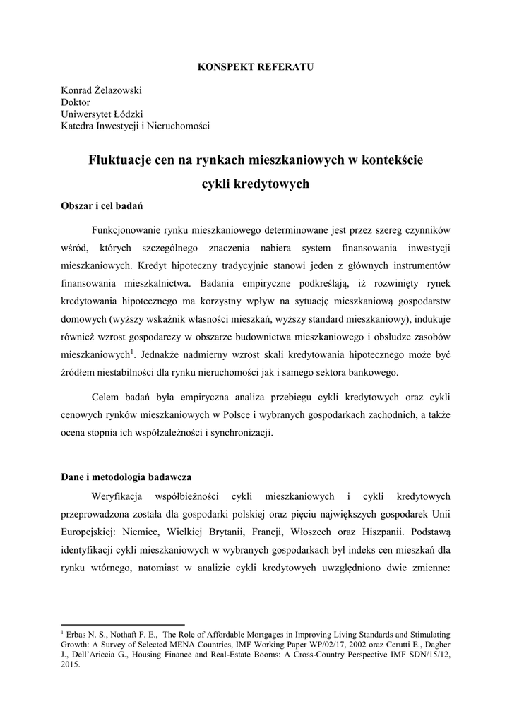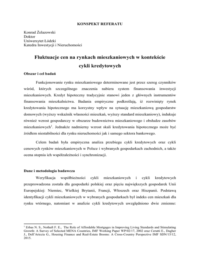 KONSPEKT REFERATU Konrad Żelazowski Doktor Uniwersytet Łódzki Katedra Inwestycji i Nieruchomości Fluktuacje cen na rynkach mieszkaniowych w kontekście cykli kredytowych Obszar i cel badań Funkcjonowanie rynku mieszkaniowego determinowane jest przez szereg czynników wśród, których szczególnego znaczenia nabiera system finansowania inwestycji mieszkaniowych. Kredyt hipoteczny tradycyjnie stanowi jeden z głównych instrumentów finansowania mieszkalnictwa. Badania empiryczne podkreślają, iż rozwinięty rynek kredytowania hipotecznego ma korzystny wpływ na sytuację mieszkaniową gospodarstw domowych (wyższy wskaźnik własności mieszkań, wyższy standard mieszkaniowy), indukuje również wzrost gospodarczy w obszarze budownictwa mieszkaniowego i obsłudze zasobów mieszkaniowych1. Jednakże nadmierny wzrost skali kredytowania hipotecznego może być źródłem niestabilności dla rynku nieruchomości jak i samego sektora bankowego. Celem badań była empiryczna analiza przebiegu cykli kredytowych oraz cykli cenowych rynków mieszkaniowych w Polsce i wybranych gospodarkach zachodnich, a także ocena stopnia ich współzależności i synchronizacji. Dane i metodologia badawcza Weryfikacja współbieżności cykli mieszkaniowych i cykli kredytowych przeprowadzona została dla gospodarki polskiej oraz pięciu największych gospodarek Unii Europejskiej: Niemiec, Wielkiej Brytanii, Francji, Włoszech oraz Hiszpanii. Podstawą identyfikacji cykli mieszkaniowych w wybranych gospodarkach był indeks cen mieszkań dla rynku wtórnego, natomiast w analizie cykli kredytowych uwzględniono dwie zmienne: 1 Erbas N. S., Nothaft F. E., The Role of Affordable Mortgages in Improving Living Standards and Stimulating Growth: A Survey of Selected MENA Countries, IMF Working Paper WP/02/17, 2002 oraz Cerutti E., Dagher J., Dell’Ariccia G., Housing Finance and Real-Estate Booms: A Cross-Country Perspective IMF SDN/15/12, 2015. zadłużenie gospodarstw domowych z tytułu kredytów hipotecznych oraz zadłużenie gospodarstw domowych z tytułu kredytów bankowych ogółem2 (por. tabela 1). Tab. 1. Charakterystyka danych uwzględnionych w procedurze badawczej Zmienna HPI – indeks jednopodstawowy cen mieszkań rynku wtórnego (2010=100) Przedział czasowy 1Q1981-4Q2015 Kraj Źródło danych Francja, Hiszpania, Niemcy, Wielka Brytania, Włochy Polska OECD Housing Prices database CI - indeks jednopodstawowy zadłużenia gospodarstw domowych z tyt. kredytów bankowych ogółem (2010=100) 1Q1981-4Q2015 Francja, Hiszpania, Niemcy, Wielka Brytania, Włochy MI - indeks jednopodstawowy zadłużenia gospodarstw domowych z tyt. kredytów hipotecznych (2010=100) 1Q2003-4Q2015 Francja, Hiszpania, Niemcy, Włochy Wielka Brytania Polska PKO BP S.A., Kwartalne raporty rynku mieszkaniowego BIS Credit to the nonfinancial sector database EBC Banks balance sheet: Households house loans Bank of England Narodowy Bank Polski Źródło: opracowanie własne Przedstawione szeregi czasowe zostały w pierwszej kolejności wyrównane sezonowo z zastosowaniem procedury TRAMO-SEATS. Do wyodrębnienia komponentu cyklicznego wykorzystano filtr częstotliwościowy Hodricka – Prescotta (filtr HP)3. W kolejnym etapie wyodrębnione cykle mieszkaniowe i kredytowe poddane zostały procedurze datowania. Punkty zwrotne zidentyfikowano z wykorzystaniem 4-kwartalnych okien czasowych: Cykl osiąga w kwartale t szczyt gdy: Xt-4 , … Xt-1 < Xt > Xt+1 , … Xt+4 Cykl osiąga w kwartale t dno gdy: Xt-4 , … Xt-1 > Xt < Xt+1 , … Xt+4. Ponadto przyjęto, iż minimalna długość trwania faz cyklu wynosi 4-kwartały, natomiast minimalna długość trwania pełnego cyklu wynosi 8 kwartałów. Zweryfikowana została także przemienność występowania punktów zwrotnych. W przypadku występowania po sobie kolejnych górnych (dolnych) punktów zwrotnych w analizie uwzględniono wartości najwyższe (najniższe)4. Ze względu na brak danych w zakresie cen nieruchomości przed 2003r. analiza dla rynku polskiego przeprowadzona została wyłącznie w przedziale czasowym 1Q2003-4Q2015. 3 Hodrick R.J., Prescott E.C. , Postwar U.S. Business Cycles: An Empirical Investigation, Journal of Money Credit and Banking, vol. 29, no. 1, 1997. 4 Borowiec J., Synchronizacja cykli koniunkturalnych w strefie euro, Prace Naukowe Uniwersytetu Ekonomicznego we Wrocławiu Nr 233, Wrocław 2011, s. 49. 2 Analiza poziomu współzależności i synchronizacji cykli przeprowadzona została z zastosowaniem współczynników cross-korelacji oraz konkordancji. Pierwsza miara w ocenie siły współzależności dwóch cykli uwzględnia kierunek i dynamikę ich przebiegu. Indeks konkordancji określa poziom synchronizacji dwóch cykli biorąc pod uwagę zgodność ich faz. Informuje on przez jaką część badanego okresu dwa cykle pozostawały w tej samej fazie (wzrostowej lub spadkowej). Indeks konkordancji wyznaczany jest na podstawie formuły5: (1) gdzie: CI- indeks konkordancji Sit - faza cyklu w okresie t dla rynku i (przyjmuje wartość 1 w fazie wzrostowej oraz 0 w fazie spadkowej) Sjt - faza cyklu w okresie t dla rynku j (przyjmuje wartość 1 w fazie wzrostowej oraz 0 w fazie spadkowej) T – horyzont czasowy analizy. Wyniki badań Przebieg cykli mieszkaniowych i kredytowych w badanych gospodarkach przedstawiony został na rys. 1-6, natomiast wyniki analizy współzależności i synchronizacji cykli zawierają tab. 2 oraz tab. 3. Rys. 1 Cenowy cykl mieszkaniowy oraz cykle kredytowe w Niemczech 5 Akimov A., Stevenson S., Young J., 2015, Synchronisation and commonalities in metropolitan housing market cycles, Urban Studies Vol. 52, Issue 9, pp. 1665-1682. Rys. 2 Cenowy cykl mieszkaniowy oraz cykle kredytowe w Hiszpanii Rys. 3 Cenowy cykl mieszkaniowy oraz cykle kredytowe we Francji Rys. 4 Cenowy cykl mieszkaniowy oraz cykle kredytowe w Wielkiej Brytanii Rys. 5 Cenowy cykl mieszkaniowy oraz cykle kredytowe we Włoszech Rys. 6 Cenowy cykl mieszkaniowy oraz cykl kredytow
