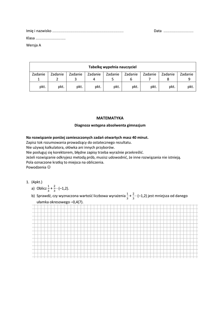 Imię i nazwisko …………………………………………………………………………………………… Data ………………………………..…… Klasa ………………………………..…… Wersja A Tabelkę wypełnia nauczyciel Zadanie 1 Zadanie 2 Zadanie 3 Zadanie 4 Zadanie 5 Zadanie 6 Zadanie 7 Zadanie 8 Zadanie 9 pkt. pkt. pkt. pkt. pkt. pkt. pkt. pkt. pkt. MATEMATYKA Diagnoza wstępna absolwenta gimnazjum Na rozwiązanie poniżej zamieszczonych zadań otwartych masz 40 minut. Zapisz tok rozumowania prowadzący do ostatecznego rezultatu. Nie używaj kalkulatora, ołówka ani innych przyborów. Nie posługuj się korektorem, błędne zapisy trzeba wyraźnie przekreślić. Jeżeli rozwiązanie odkryjesz metodą prób, musisz udowodnić, że inne rozwiązania nie istnieją. Pola oznaczone kratką to miejsca na obliczenia. Powodzenia 1. (4pkt.) a) Oblicz + ∙ (–1,2). b) Sprawdź, czy wyznaczona wartość liczbowa wyrażenia + ∙ (–1,2) jest mniejsza od danego ułamka okresowego –0,4(7). 2. (5pkt.) Oblicz √32 : √2 – 3-10 ∙ 38 ∙ (3√3)2 – 5 . 3. (4pkt.) a) Rozwiąż równanie –2(x – ) – = . b) Sprawdź, czy rozwiązanie równania –2(x – ) – = spełnia nierówność x > – 0,3. 4. (2pkt.) W klasie jest 32 uczniów, w tym 20 dziewcząt. Jaki procent wszystkich uczniów stanowią chłopcy? 5. (3pkt.) Suma dwóch liczb jest równa 4. Jedna z tych liczb jest o 14 mniejsza od dwukrotności drugiej. Wyznacz te liczby. Zapisz i rozwiąż odpowiedni układ równań. 6. (5pkt.) Długość jednej z przyprostokątnych trójkąta prostokątnego jest równa √7 . Wiadomo, że stosunek długości przeciwprostokątnej do długości drugiej z przyprostokątnych wynosi 4 : 3. Oblicz długość przeciwprostokątnej tego trójkąta. 7. (3pkt.) Na podwórku rosną drzewa: akacja A, sosna S i jodła J. Wszystkie drzewa rosną w odległości 6 m od siebie. Znajdź punkt, w którym mógłby stanąć Janek, aby do każdego drzewa miał jednakową drogę. Oblicz tę odległość. Opisz sposób postępowania. Wykorzystaj rysunek. S A B 8. (2pkt.) Bok kwadratu zwiększono 3 razy. Ile razy zwiększyło się pole kwadratu? 9. (3pkt.) Piaskownica dla dzieci w kształcie prostokąta ma 3,5 m długości, 2 m szerokości i 1m głębokości. Ile piasku trzeba przywieść, aby napełnić piaskownicę w głębokości? Imię i nazwisko …………………………………………………………………………………………… Data ………………………………..…… Klasa ………………………………..…… Wersja B Tabelkę wypełni nauczyciel Zadanie 1 Zadanie 2 Zadanie 3 Zadanie 4 Zadanie 5 Zadanie 6 Zadanie 7 Zadanie 8 Zadanie 9 pkt. pkt. pkt. pkt. pkt. pkt. pkt. pkt. pkt. MATEMATYKA Diagnoza wstępna absolwenta gimnazjum Na rozwiązanie poniżej zamieszczonych zadań otwartych masz 40 minut. Zapisz tok rozumowania prowadzący do ostatecznego rezultatu. Nie używaj kalkulatora, ołówka ani innych przyborów. Nie posługuj się korektorem, błędne zapisy trzeba wyraźnie przekreślić. Jeżeli rozwiązanie odkryjesz metodą prób, musisz udowodnić, że inne rozwiązania nie istnieją. Pola oznaczone kratką to miejsca na obliczenia. Powodzenia 1. (4pkt.) a) Oblicz 1 + ∙ (–2,8). b) Sprawdź, czy wyznaczona wartość liczbowa wyrażenia 1 + ∙ (–2,8) jest mniejsza od danego ułamka okresowego –1,1(5). 2. (5pkt.) Oblicz 7 – √8 ∙ √2 – 26 ∙ 2-8 ∙ (2√2)2 . 3. (4pkt.) a) Rozwiąż równanie + = –2(x – ). b) Sprawdź, czy rozwiązanie równania + = –2(x – ) spełnia nierówność x > – 0,6. 4. (2pkt.) W klasie jest 32 uczniów, w tym 14 chłopców. Jaki procent wszystkich uczniów stanowią dziewczęta? 5. (3pkt.) Różnica dwóch liczb jest równa 8. Jedna z tych liczb jest o 3 większa od dwukrotności drugiej. Wyznacz te liczby. Zapisz i rozwiąż odpowiedni układ równań. 6. (5pkt.) Długość jednej z przyprostokątnych trójkąta prostokątnego jest równa √5 . Wiadomo, że stosunek długości drugiej przyprostokątnej do długości przeciwprostokątnej wynosi 2 : 3. Oblicz długość przeciwprostokątnej tego trójkąta. 7. (3pkt.) W wesołym miasteczku kolejka jeździ od strzelnicy S do karuzeli K i dalej do sklepu z upominkami U. Strzelnica, karuzela i sklep z upominkami znajdują się w odległości 60 m od siebie. Uwzględniając załączony rysunek wyjaśnij, w którym miejscu wesołego miasteczka odległość do każdego z tych miejsc jest taka sama? Oblicz tę odległość. Objaśnij tok rozumowania. S K U 8. (2pkt.) Bok kwadratu zwiększono 4 razy. Ile razy zwiększyło się pole kwadratu? 9. (3pkt.) Basen w kształcie prostokąta ma 50 m długości, 30 m szerokości i 12 m głębokości. Ile wody znajduje się w basenie, jeżeli napełniony jest w głębokości ? Schemat punktowania Numer zadania 1. 2. 3. 4. 5. 6. Badana umiejętność Mnożenie ułamka zwykłego przez dziesiętny Odejmowanie ułamków Wykonanie przekształcenia umożliwiającego porównanie ułamka dziesiętnego okresowego ze zwykłym Porównywanie ułamków ujemnych Dzielenie (mnożenie pierwiastków) Potęgowanie iloczynu, w którym jeden z czynników to pierwiastek kwadratowy Mnożenie potęg o tej samej podstawie Obliczanie pierwiastka z liczby mieszanej Dodawanie i odejmowanie liczb wymiernych Przekształcanie nierówności do postaci ax = b 8. 9. 1 1 1 1 1 1 2 (1p, gdy wystąpi drobny błąd rachunkowy) 7. Liczba Typ zadania punktów 1 1 1 P Rozwiązanie równania ax = b Porównanie ułamków zwykłych o różnych mianownikach Obliczenia procentowe Otrzymanie odpowiedniego procentu Wprowadzenie oznaczeń i zbudowanie układu równań Rozwiązanie układu równań liniowych Przyjęcie oznaczeń zgodnie z warunkami zadania Wykorzystanie stosunku długości odcinków do zapisania równania Zastosowanie twierdzenie Pitagorasa Wykonanie odpowiednich obliczeń umożliwiających rozwiązanie zadania Obliczeni