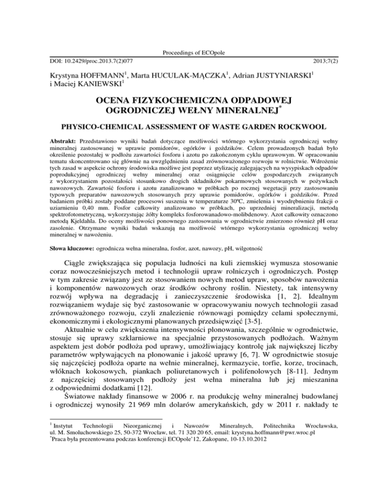 Proceedings of ECOpole DOI: 10.2429/proc.2013.7(2)077 2013;7(2) Krystyna HOFFMANN1, Marta HUCULAK-MĄCZKA1, Adrian JUSTYNIARSKI1 i Maciej KANIEWSKI1 OCENA FIZYKOCHEMICZNA ODPADOWEJ OGRODNICZEJ WEŁNY MINERALNEJ* PHYSICO-CHEMICAL ASSESSMENT OF WASTE GARDEN ROCKWOOL Abstrakt: Przedstawiono wyniki badań dotyczące możliwości wtórnego wykorzystania ogrodniczej wełny mineralnej zastosowanej w uprawie pomidorów, ogórków i goździków. Celem prowadzonych badań było określenie pozostałej w podłożu zawartości fosforu i azotu po zakończonym cyklu uprawowym. W opracowaniu tematu skoncentrowano się głównie na uwzględnieniu zasad zrównoważonego rozwoju w rolnictwie. Wdrożenie tych zasad w aspekcie ochrony środowiska możliwe jest poprzez utylizację zalegających na wysypiskach odpadów poprodukcyjnej ogrodniczej wełny mineralnej oraz osiągnięcie celów gospodarczych związanych z wykorzystaniem pozostałości stosunkowo drogich składników pokarmowych stosowanych w pożywkach nawozowych. Zawartość fosforu i azotu zanalizowano w próbkach po rocznej wegetacji przy zastosowaniu typowych preparatów nawozowych stosowanych przy uprawie pomidorów, ogórków i goździków. Przed badaniem próbki zostały poddane procesowi suszenia w temperaturze 30ºC, zmielenia i wyodrębnieniu frakcji o uziarnieniu 0,40 mm. Fosfor całkowity analizowano w próbkach, po uprzedniej mineralizacji, metodą spektrofotometryczną, wykorzystując żółty kompleks fosforowanadowo-molibdenowy. Azot całkowity oznaczono metodą Kjeldahla. Do oceny możliwości ponownego zastosowania w ogrodnictwie zmierzono również pH oraz zasolenie. Otrzymane wyniki badań wskazują na możliwość wtórnego wykorzystania ogrodniczej wełny mineralnej w nawożeniu. Słowa kluczowe: ogrodnicza wełna mineralna, fosfor, azot, nawozy, pH, wilgotność Ciągle zwiększająca się populacja ludności na kuli ziemskiej wymusza stosowanie coraz nowocześniejszych metod i technologii upraw rolniczych i ogrodniczych. Postęp w tym zakresie związany jest ze stosowaniem nowych metod upraw, sposobów nawożenia i komponentów nawozowych oraz środków ochrony roślin. Niestety, tak intensywny rozwój wpływa na degradację i zanieczyszczenie środowiska [1, 2]. Idealnym rozwiązaniem wydaje się być zastosowanie w opracowywaniu nowych technologii zasad zrównoważonego rozwoju, czyli znalezienie równowagi pomiędzy celami społecznymi, ekonomicznymi i ekologicznymi planowanych przedsięwzięć [3-5]. Aktualnie w celu zwiększenia intensywności plonowania, szczególnie w ogrodnictwie, stosuje się uprawy szklarniowe na specjalnie przystosowanych podłożach. Ważnym aspektem jest dobór podłoża pod uprawy, umożliwiający kontrolę jak największej liczby parametrów wpływających na plonowanie i jakość uprawy [6, 7]. W ogrodnictwie stosuje się najczęściej podłoża oparte na wełnie mineralnej, kermazycie, torfie, korze, trocinach, włóknach kokosowych, piankach poliuretanowych i polifenolowych [8-11]. Jednym z najczęściej stosowanych podłoży jest wełna mineralna lub jej mieszanina z odpowiednimi dodatkami [12]. Światowe nakłady finansowe w 2006 r. na produkcję wełny mineralnej budowlanej i ogrodniczej wynosiły 21 969 mln dolarów amerykańskich, gdy w 2011 r. nakłady te 1 Instytut Technologii Nieorganicznej i Nawozów Mineralnych, Politechnika Wrocławska, ul. M. Smoluchowskiego 25, 50-372 Wrocław, tel. 71 320 20 65, email: [email protected] * Praca była prezentowana podczas konferencji ECOpole’12, Zakopane, 10-13.10.2012 588 Krystyna Hoffmann, Marta Huculak-Mączka, Adrian Justyniarski i Maciej Kaniewski wynosiły już 25 466 mln dolarów amerykańskich. W Polsce nakłady finansowe na produkcję wełny wzrosły z 169,83 mln dolarów amerykańskich w 2006 r. do 200,31 mln dolarów amerykańskich w 2011 r., co stanowiło 3,15% nakładów w Europie i 0,79% na świecie [13]. Wełna mineralna, znana również pod nazwą wełna skalna, jest otrzymywana przez stapianie skał bazaltowych i przekształcanie wytopu w włókna poprzez wyciąganie, walcowanie. Otrzymane w ten sposób włókna, o niewielkiej średnicy, rozdmuchiwane są gorącym powietrzem, w wyniku czego otrzymuje się włókna o średnicy rzędu µm. Ze względu na małą gęstość i przewodność cieplną oraz porowatość i dogodne możliwości obróbki, takie jak cięcie czy formowanie, początkowo wełna mineralna stosowana była w budownictwie jako izolator cieplny [14-16]. Pod koniec XX w. opracowano metody modyfikacji właściwości, umożliwiające zastosowanie jej w uprawach ogrodniczych. Zaletami ogrodniczej wełny mineralnej są: możliwość kontroli pH, temperatury, wilgotności. W porównaniu z podłożami organicznymi ogrodnicza wełna mineralna charakteryzuje się lepszymi właściwościami ochronnymi przed patogenami [17]. Uprawy roślin prowadzi się na podłożu z ogrodniczej wełny mineralnej uformowanej w odpowiednie bloki, małe startery upraw, maty bądź małe kostki zabezpieczone odpowiednio foliami przed stratami wody i roztworów nawozowych. Sposób uprawy różni się w zależności od gatunku roślin. Główne różnice są w stosowanych nawozach, porowatości używanej wełny oraz wilgotności [6]. Właściwości te determinują usieciowanie systemów korzennych roślin. Wełna stosowana jest często do dwu- lub kilkukrotnej uprawy, co zwiększa jakość wybranych gatunków roślin [7]. Problemem stosowania w ogrodnictwie wełny mineralnej jest jej utylizacja oraz wtórne użycie. Nie ma obecnie metody, która kompleksowo rozwiązywałaby ten problem. Znana jest możliwość wtórnego zastosowania ogrodniczej wełny mineralnej poprzez traktowanie jej parą wodną. Niestety, tak regenerowana wełna nie ma takich właściwości fizykochemicznych jak wełna produkcyjna [18]. Materiały i metody Celem niniejszych badań było określenie możliwości ponownego wykorzystania odpadowej wełny mineralnej w nawożen