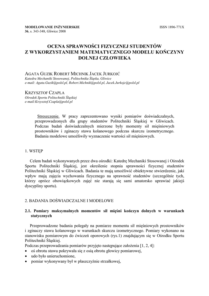 MODELOWANIE INśYNIERSKIE 36, s. 343-348, Gliwice 2008 ISSN 1896-771X OCENA SPRAWNOŚCI FIZYCZNEJ STUDENTÓW Z WYKORZYSTANIEM MATEMATYCZNEGO MODELU KOŃCZYNY DOLNEJ CZŁOWIEKA AGATA GUZIK ROBERT MICHNIK JACEK JURKOJĆ Katedra Mechaniki Stosowanej, Politechnika Śląska, Gliwice e-mail: [email protected], [email protected], [email protected] KRZYSZTOF CZAPLA Ośrodek Sportu Politechniki Śląskiej e-mail:[email protected] Streszczenie. W pracy zaprezentowano wyniki pomiarów doświadczalnych, przeprowadzonych dla grupy studentów Politechniki Śląskiej w Gliwicach. Podczas badań doświadczalnych mierzone były momenty sił mięśniowych prostowników i zginaczy stawu kolanowego podczas skurczu izometrycznego. Badania modelowe umoŜliwiły wyznaczenie wartości sił mięśniowych. 1. WSTĘP Celem badań wykonywanych przez dwa ośrodki: Katedrę Mechaniki Stosowanej i Ośrodek Sportu Politechniki Śląskiej, jest określenie stopnia sprawności fizycznej studentów Politechniki Śląskiej w Gliwicach. Badania te mają umoŜliwić obiektywne stwierdzenie, jaki wpływ mają zajęcia wychowania fizycznego na sprawność studentów (szczególnie tych, którzy oprócz obowiązkowych zajęć nie starają się sami amatorsko uprawiać jakiejś dyscypliny sportu). 2. BADANIA DOŚWIADCZALNE I MODELOWE 2.1. Pomiary maksymalnych momentów sił mięśni kończyn dolnych w warunkach statycznych Przeprowadzone badania polegały na pomiarze momentu sił mięśniowych prostowników i zginaczy stawu kolanowego w warunkach skurczu izometrycznego. Pomiary wykonano na stanowisku pomiarowym do ćwiczeń oporowych (rys.1) znajdującym się w Ośrodku Sportu Politechniki Śląskiej. Podczas przeprowadzania pomiarów przyjęto następujące załoŜenia [1, 2, 4]: • oś obrotu stawu pokrywała się z osią obrotu głowicy pomiarowej, • udo było unieruchomione, • pomiar wykonywany był w płaszczyźnie strzałkowej, 344 • A. GUZIK, R. MICHNIK, J. JURKOJĆ, K. CZAPLA pomiary wykonano dla kątów 15°, 30° i 45° dla zginaczy stawu kolanowego oraz 45°, 60° i 75° dla prostowników stawu kolanowego. Dla tych kątów wartości momentów sił mięśniowych uzyskują największe wartości. Do dalszej analizy brano pod uwagę maksymalne momenty sił mięśniowych. Rys. 1. Stanowisko pomiarowe 2.2. Model kończyny dolnej Model kończyny dolnej składa się z dwóch brył sztywnych modelujących udo i podudzie [3]. Segmenty połączone są ze sobą za pomocą pary kinematycznej V klasy, reprezentującej staw kolanowy. W modelu uwzględniono pięć grup mięśni działających w obrębie stawu kolanowego (rys.2). Rys. 2. Model fizyczny kończyny dolnej z uwzględnionymi mięśniami Rys. 3. Rozkład sił działających na podudzie ZałoŜono, Ŝe siły generowane przez mięśnie oddziałują na odpowiednie człony siłą o zmiennej wartości i kierunku, który wynika z aktualnego połoŜenia ich punktów zaczepu, zgodnie z modelem Hilla. ZałoŜono, Ŝe siły mięśniowe zginaczy stawu kolanowego działają wzdłuŜ prostych linii łączących przyczepy końcowe i początkowe mięśni, podczas gdy siły mięśniowe prostowników działają na rzepkę, natomiast siła o kierunku działania równoległym do więzadła rzepkowego - na podudzie (rys. 3). OCENA SPRAWNOŚCI FIZYCZNEJ STUDENTÓW Z WYKORZYSTANIEM MATEMATYCZNEGO…345 Zagadnienie identyfikacji sił poszczególnych mięśni zginaczy i prostowników stawu kolanowego zostało rozwiązane przy wykorzystaniu metod optymalizacyjnych. Funkcja celu została sformułowana następująco: n min ∑ Fi 2 (1) i =1 gdzie.: Fi – wartości sił mięśniowych. Zadanie optymalizacyjne zostało rozwiązane przy wykorzystaniu dodatkowych równań wynikających z funkcjonowania układu mięśniowego oraz fizjologii mięśni: n M = ∑ ri Fi (2) i =1 0 < ui < 1 (3) gdzie: M – wypadkowy moment sił mięśniowych działających na staw kolanowy wyznaczony na stanowisku pomiarowym, ri – ramiona sił mięśniowych, ui - pobudzenie sił mięśniowych. Podczas obliczeń wykorzystano model typu Hilla. ZałoŜono, Ŝe siła mięśniowa składa się z elementu pasywnego i aktywnego [1, 2]. F =uFA+FB (4) gdzie: FA – składowa aktywna siły mięśniowej, FB – składowa pasywna siły mięśniowej. Składowa pasywna zaleŜy od długości mięśnia, natomiast składowa aktywna od przekroju fizjologicznego mięśnia, długości mięśnia i jego pobudzenia. 3. WYNIKI BADAŃ DOŚWIADCZALNYCH I MODELOWYCH Badania doświadczalne przeprowadzono na grupie 216 studentów Politechniki Śląskiej (70 kobiet i 146 męŜczyzn), którzy uczestniczyli w obowiązkowych zajęciach z wychowania fizycznego i nie uprawiali wyczynowo sportu. Studentki Studenci Liczba badanych 70 146 Tabela.1. Dane badanych osób Wysokość Wiek [lata] Masa [kg] BMI ciała [cm] 20 167,06±6,48 58,47±9,14 20,89±2,55 20 180,36±5,97 75,12±10,08 23,10±2,98 Badane osoby podzielono na dwie grupy ze względu na płeć: studenci i studentki. Dla kaŜdej grupy wyznaczono wartości średnie maksymalnych momentów sił mięśniowych działających w obrębie stawu kolanowego podczas skurczu izometrycznego, a takŜe wartości sił mięśniowych zginaczy i prostowników stawu kolanowego, które zostały wyznaczone w procesie identyfikacji. Następnie dokonano analizy porównawczej z uwzględnieniem podziału na płeć. Wyniki badań doświadczalnych i modelowych przedstawiono na wykresach kolumnowych (rys. 4, rys. 5). 346 A. GUZIK, R. MICHNIK, J. JURKOJĆ, K. CZAPLA 3.1. Wartości średnie maksymalnych momentów sił mięśni zginaczy i prostowników stawu kolanowego zginanie w stawie kolanowym 120 100 moment [Nm] 80 60 40 20 studenci 0 15 studentki 30 45 kąt [deg] Rys. 4. Uśrednione wartości maksymalnych momentów sił mięśniowych zginaczy stawu kolanowego prostowanie w stawie kolanowym 250 moment [Nm] 200 150 100 50 studenci 0 45 studentki 60 kąt [deg] 75 Rys. 5. Uśrednione wartości maksymalnych momentów sił mię