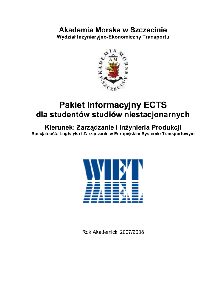 Akademia Morska w Szczecinie Wydział Inżynieryjno-Ekonomiczny Transportu Pakiet Informacyjny ECTS dla studentów studiów niestacjonarnych Kierunek: Zarządzanie i Inżynieria Produkcji Specjalność: Logistyka i Zarządzanie w Europejskim Systemie Transportowym Rok Akademicki 2007/2008 Spis treści Informacje ogólne _________________________________________________________________ 5 Szczecin _______________________________________________________________________ 5 Położenie i specyfika miasta ____________________________________________________ 5 Historia miasta Szczecina _______________________________________________________ 5 Akademia Morska w Szczecinie____________________________________________________ 7 Dane teleadresowe ____________________________________________________________ 7 Informacje podstawowe ________________________________________________________ 7 Władze Uczelni ______________________________________________________________ 7 Lokalizacja __________________________________________________________________ 7 Rys historyczny, rozwój i funkcjonowanie Uczelni ___________________________________ 8 Organizacja roku akademickiego 2007/2008 ________________________________________ 10 Plan zjazdów________________________________________________________________ 10 Terminy rozliczeń: ___________________________________________________________ 10 Wydział Inżynieryjno-Ekonomiczny Transportu ____________________________________ 11 Dane teleadresowe ___________________________________________________________ 11 Informacje podstawowe _______________________________________________________ 11 Władze Wydziału ____________________________________________________________ 11 Jednostki dydaktyczne ________________________________________________________ 11 Struktura organizacyjna _____________________________________________________ 11 Kontakt telefoniczny oraz adresy e-mail: ________________________________________ 12 Misja Wydziału _____________________________________________________________ 12 Kierunki i specjalności ________________________________________________________ 12 Sylwetka absolwenta kierunku Zarządzanie i Inżynieria Produkcji ______________________ 12 Zasady rekrutacji na Akademię Morską (zatwierdzone na posiedzeniu Senatu w dniu 24.05.2006 roku, znowelizowane w dniu 17.01.2007) __________________________________________ 13 Zasady ogólne i kryteria kwalifikacyjne _________________________________________ 13 Zasady szczegółowe rekrutacji na Wydział Inżynieryjno-Ekonomiczny Transportu. ______ 16 Opłaty ___________________________________________________________________ 17 Wprowadzenie do systemu ECTS ____________________________________________________ 18 Wstęp ________________________________________________________________________ 18 Czym są punkty ECTS? _________________________________________________________ 18 Jak działa ECTS? ______________________________________________________________ 18 Zasady przyznawania punktów studentom _________________________________________ 19 Konwersja ocen ________________________________________________________________ 20 Finansowanie udziału w programie ECTS __________________________________________ 20 Koordynatorzy ECTS ___________________________________________________________ 20 Informacje o programach studiów ___________________________________________________ 21 Przyznawane kwalifikacje _______________________________________________________ 21 Warunki przyjęć _______________________________________________________________ 21 Organizacja procesu dydaktycznego_______________________________________________ 22 Informacje ogólne o programie studiów___________________________________________ 22 Procedury zapewnienia jakości kształcenia ________________________________________ 22 Liczebność grup studenckich ___________________________________________________ 22 Stosowane metody dydaktyczne_________________________________________________ 23 Oferta kształcenia w językach obcych ____________________________________________ 23 3 Indywidualizacja kształcenia, oferta kształcenia i udogodnienia dla studentów niepełnosprawnych ____________________________________________________________ 23 Porównanie planu studiów z wymaganiami określonymi przez standardy kształcenia dla kierunku Zarządzanie i Inżynieria Produkcji, specjalność: Logistyka i zarządzanie w Europejskim Systemie Transportowym _______________________________________________________ 24 Plan studiów wraz z liczbą punktów ECTS na rok akademicki 2007/2008 – studia niestacjonarne I-go stopnia ______________________________________________________ 25 Specjalność: Logistyka i Zarządzanie w Europejskim Systemie Transportowym ___________ 25 Rok I ____________________________________________________________________ 25 Rok II ____________________________________________________________________ 25 Rok III ___________________________________________________________________ 26 Rok IV ___________________________________________________________________ 26 Przebieg realizacji pracy dyplomowej ______________________________________________ 27 Informacje ogólne dla studentów ____________________________________________________ 28 Warunki socjalno-bytowe ________________________________________________________ 28 Zakwaterowanie _____________________________________________________________ 28 Dom Studencki KORAB _____________________________________________________ 28 Dom studencki PASAT ______________________________________________________ 28 Cennik opłat za zamieszkanie w pokojach studenckich _____________________________ 29 Wyżywienie ________________________________________________________________ 29 Stołówka studencka _________________________________________________________ 29 Bufet ____________________________________________________________________ 29 Opieka zdrowotna ________________________________________________________