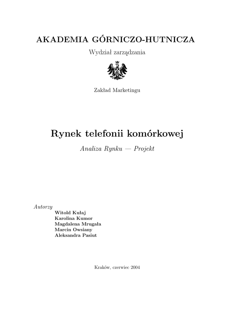 AKADEMIA GÓRNICZO-HUTNICZA Wydział zarządzania Zakład Marketingu Rynek telefonii komórkowej Analiza Rynku — Projekt Autorzy Witold Kułaj Karolina Kumor Magdalena Mrugała Marcin Owsiany Aleksandra Pasiut Kraków, czerwiec 2004 SPIS TREŚCI 2 Spis treści 1 Opis rynku 1.1 Rynek ogólny . . . . . . . . . . . . . . . 1.1.1 Penetracja telefonii komórkowej w 1.1.2 Rynek ogółem . . . . . . . . . . . 1.2 Przedsiębiorstwa występujące na rynku . 1.3 Perspektywy rozwoju . . . . . . . . . . . . . . . Polsce . . . . . . . . . . . . . . . . . . . . . . . . . . . . . . . . . . . . . . . . . . . . . . . . . . . . . . . . . . . . . . . . . . . . . . . . . . . . . . . . . . . . . . . 3 3 3 4 6 7 2 Segmentacja 8 3 Rynek docelowy 9 4 Ankieta 10 5 Przeprowadzenie ankiety 15 6 Opracowanie wyników 15 7 Wnioski 7.1 Ocena trafności wyboru kryteriów podziału wybranego segmentu rynku . . 7.1.1 Płeć . . . . . . . . . . . . . . . . . . . . . . . . . . . . . . . . . . . 7.1.2 Dysponowana kwota przeznaczona na miesięczny rachunek za telefon 7.2 Przeszkody i trudności w opracowaniu projektu . . . . . . . . . . . . . . . 7.3 Błędy przy prowadzeniu badań . . . . . . . . . . . . . . . . . . . . . . . . 7.4 Opinia o rynku telefonii komórkowej w Polsce . . . . . . . . . . . . . . . . 20 20 20 21 21 21 22 8 Literatura 23 1 OPIS RYNKU 1 3 Opis rynku Telekomunikacja komórkowa jest najszybciej rosnącym segmentem rynku telekomunikacyjnego. Liczba abonentów praktycznie podwaja się co roku. Pomimo ogólnego kryzysu gospodarczego szybko rozwijana jest infrastruktura komórkowa. Źródło: [2, 9, 4]. 1.1 Rynek ogólny Rynkiem ogólnym jest rynek usług telekomunikacji komórkowej w Polsce. Jest obecnie zdominowany przez cyfrowy standard GSM 900/1800 MHz, który wyparł stosowany wcześniej analogowy system NMT, wykorzystujący pasmo 450 MHz (Sieć taką posiada nadal w Polsce PTK Centertel). Źródło: [7]. 1.1.1 Penetracja telefonii komórkowej w Polsce Tabela 1 oraz wykres 1 przedstawiają wskaźniki penetracji telefonii komórkowej w polsce w latach 1995-2002. Źródło: [5]. Jak widać wzrost jest bardzo dynamiczny, jest to spowodowane dużą popularnością telefonów komórkowych w społeczeństwie. Początkowo posiadanie telefonu było związane z prestiżem. Ponadto telefon komórkowy jest stosunkowo tanim, wygodnym i bezpiecznym urządzeniem. Stąd obserwujemy obecnie zupełną zmianę zachowań komunikacyjnych ludzi — dzięki szybkiemu rozwojowi infrastruktury komórkowej, przesłanie wiadomości jest możliwe w praktycznie dowolnym miejscu i czasie. Rok Penetracja 1995 0,2% 1996 0,6% 1997 2,1% 1998 5,0% 1999 10,2% 2000 17,5% 2001 24,9% 2002 36,0% Tablica 1: Penetracja telefonii komórkowej w Polsce. Źródło: [5] 1 OPIS RYNKU 4 Rysunek 1: Penetracja telefonii komórkowej w Polsce. Źródło: [5] Pod koniec roku 2004 szacuje sie osiągnięcie wskaźnika 53%. Znaczyłoby to, że pod koniec roku 2004 liczba użytkowników „komórek” w polsce powinna przekroczyć 20 milionów, z czego prawie 70% stanowiliby użytkownicy usług bezabonamentowych (pre-paid). Źródło: [5] W roku 2001 44% nowych klientów korzystało z usług pre-paid. W roku 2002 było to już 53%. Świadczy to o dominacji jaką ten rodzaj usług osiągnął na rynku, a co za tym idzie jak bardzo „lubiana” jest to przez użytkowników usługa. Zjawisko to jest jednak bardzo niekorzystne dla operatorów, którzy stosują szeroko zakrojone programy lojalnościowe, mające nakłonić klientów do przejścia na usługi abonamentowe. Źródło: [5, 7, 6, 4, 9] 1.1.2 Rynek ogółem Sumaryczne przychody wszystkich operatorów oraz ilość abonentów w latach 1998-2002 przedstawiona jest na rysunku 2. 1 OPIS RYNKU 5 Rysunek 2: Przychody polskich operatorów sieci komórkowych i liczba abonentów. Źródło: [5] Na podstawie tych danych można obliczyć średni roczny przychód dostarczany przez jednego klienta. Jest on przedstawiony na rysunku 3. Rysunek 3: Średnioroczny przychód generowany przez jednego klienta. Źródło: opracowanie własne na podstawie [5] Poprzez obniżanie kosztów utrzymania telefonów komórkowych (tańsze aparaty i niższe taryfy) operatorzy bardzo szybko pozyskują klientów. Z drugiej jednak strony przychody uzyskiwane z przeciętnego abonenta drastycznie maleją (przychody z jednego klienta spadły w ciągu pięciu lat aż ... raza). Jest to związane z powszechnym zjawiskiem przechodzenia abonentów z usług typu post-paid na usługi typu pre-paid. Tendencja ta jest także wyraźnie widoczna na rynku globalnym, i wygląda na to, że mimo desperackich kroków operatorów nic nie jest w stanie jej zatrzymać. 1 OPIS RYNKU 1.2 6 Przedsiębiorstwa występujące na rynku W Polsce funkcjonuje trzech operatorów sieci komórkowych (w nawiasach: marki): • PTK Centertel (Idea), • Polska Telefonia Cyfrowa (Era, Heyah), • Polkomtel (Plus). Wszyscy oni notują w każdym roku dynamicznie rosnące przychody z działalności telekomunikacyjnej (patrz tabela 2 i rysunek 4). Źródło: [5, 7, 6, 13, 8] Operator PTC, Sp. z o.o. Polkomtel S.A. PTK Centertel Sp. z o.o. Przychody (mln $) 2001 2002 2003 1062 1209 1378 1055 1178 1362 579 848 1192 Tablica 2: Przychody polskich operatorów sieci komórkowych Rysunek 4: Przychody polskich operatorów sieci komórkowych Wszystkie trzy firmy na chwilę obecną posiadają zbliżone udziały w rynku pod względem liczby abonentów. Wynika to z szybkiej pogoni PTK Centertel, odrabiającego straty z poprzednich lat do pozostałych dwóch operatorów. Struktura rynku na koniec roku 2002 przedstawiona jest na rysunku 5. Źródło: [5] 1 OPIS RYNKU 7 Rysunek 5: Struktura rynku na koniec 2002 roku pod względem liczby abonentów Brak jest jednoznacznych danych na temat marki „Heyah”, która pojawiła się na rynku bardzo niedawno: Wysoki rangą przedstawiciel PTC powiedział [. . . ] - Nie chcemy drażnić konkurencji i nie podajemy danych. Może ją to skłonić do bard