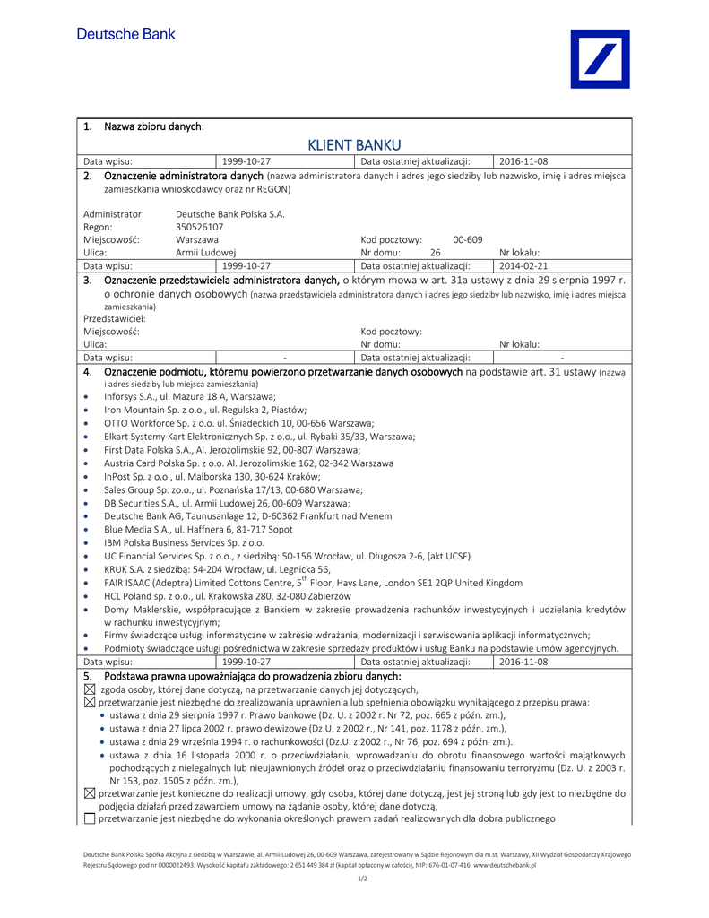 1. Nazwa zbioru danych: KLIENT BANKU Data wpisu: 2. 1999-10-27 Data ostatniej aktualizacji: 2016-11-08 Oznaczenie administratora danych (nazwa administratora danych i adres jego siedziby lub nazwisko, imię i adres miejsca zamieszkania wnioskodawcy oraz nr REGON) Administrator: Regon: Miejscowość: Ulica: Data wpisu: 3. Deutsche Bank Polska S.A. 350526107 Warszawa Armii Ludowej 1999-10-27 Kod pocztowy: 00-609 Nr domu: 26 Data ostatniej aktualizacji: Nr lokalu: 2014-02-21 Oznaczenie przedstawiciela administratora danych, o którym mowa w art. 31a ustawy z dnia 29 sierpnia 1997 r. o ochronie danych osobowych (nazwa przedstawiciela administratora danych i adres jego siedziby lub nazwisko, imię i adres miejsca zamieszkania) Przedstawiciel: Miejscowość: Ulica: Data wpisu: 4. • • • • • • • • • • • • • • • • • - Kod pocztowy: Nr domu: Data ostatniej aktualizacji: Nr lokalu: - Oznaczenie podmiotu, któremu powierzono przetwarzanie danych osobowych na podstawie art. 31 ustawy (nazwa i adres siedziby lub miejsca zamieszkania) Inforsys S.A., ul. Mazura 18 A, Warszawa; Iron Mountain Sp. z o.o., ul. Regulska 2, Piastów; OTTO Workforce Sp. z o.o. ul. Śniadeckich 10, 00-656 Warszawa; Elkart Systemy Kart Elektronicznych Sp. z o.o., ul. Rybaki 35/33, Warszawa; First Data Polska S.A., Al. Jerozolimskie 92, 00-807 Warszawa; Austria Card Polska Sp. z o.o. Al. Jerozolimskie 162, 02-342 Warszawa InPost Sp. z o.o., ul. Malborska 130, 30-624 Kraków; Sales Group Sp. zo.o., ul. Poznańska 17/13, 00-680 Warszawa; DB Securities S.A., ul. Armii Ludowej 26, 00-609 Warszawa; Deutsche Bank AG, Taunusanlage 12, D-60362 Frankfurt nad Menem Blue Media S.A., ul. Haffnera 6, 81-717 Sopot IBM Polska Business Services Sp. z o.o. UC Financial Services Sp. z o.o., z siedzibą: 50-156 Wrocław, ul. Długosza 2-6, (akt UCSF) KRUK S.A. z siedzibą: 54-204 Wrocław, ul. Legnicka 56, th FAIR ISAAC (Adeptra) Limited Cottons Centre, 5 Floor, Hays Lane, London SE1 2QP United Kingdom HCL Poland sp. z o.o., ul. Krakowska 280, 32-080 Zabierzów Domy Maklerskie, współpracujące z Bankiem w zakresie prowadzenia rachunków inwestycyjnych i udzielania kredytów w rachunku inwestycyjnym; • Firmy świadczące usługi informatyczne w zakresie wdrażania, modernizacji i serwisowania aplikacji informatycznych; • Podmioty świadczące usługi pośrednictwa w zakresie sprzedaży produktów i usług Banku na podstawie umów agencyjnych. Data wpisu: 1999-10-27 Data ostatniej aktualizacji: 2016-11-08 5. Podstawa prawna upoważniająca do prowadzenia zbioru danych: zgoda osoby, której dane dotyczą, na przetwarzanie danych jej dotyczących, przetwarzanie jest niezbędne do zrealizowania uprawnienia lub spełnienia obowiązku wynikającego z przepisu prawa: • ustawa z dnia 29 sierpnia 1997 r. Prawo bankowe (Dz. U. z 2002 r. Nr 72, poz. 665 z późn. zm.), • ustawa z dnia 27 lipca 2002 r. prawo dewizowe (Dz.U. z 2002 r., Nr 141, poz. 1178 z późn. zm.), • ustawa z dnia 29 września 1994 r. o rachunkowości (Dz.U. z 2002 r., Nr 76, poz. 694 z późn. zm.). • ustawa z dnia 16 listopada 2000 r. o przeciwdziałaniu wprowadzaniu do obrotu finansowego wartości majątkowych pochodzących z nielegalnych lub nieujawnionych źródeł oraz o przeciwdziałaniu finansowaniu terroryzmu (Dz. U. z 2003 r. Nr 153, poz. 1505 z późn. zm.), przetwarzanie jest konieczne do realizacji umowy, gdy osoba, której dane dotyczą, jest jej stroną lub gdy jest to niezbędne do podjęcia działań przed zawarciem umowy na żądanie osoby, której dane dotyczą, przetwarzanie jest niezbędne do wykonania określonych prawem zadań realizowanych dla dobra publicznego Deutsche Bank Polska Spółka Akcyjna z siedzibą w Warszawie, al. Armii Ludowej 26, 00-609 Warszawa, zarejestrowany w Sądzie Rejonowym dla m.st. Warszawy, XII Wydział Gospodarczy Krajowego Rejestru Sądowego pod nr 0000022493. Wysokość kapitału zakładowego: 2 651 449 384 zł (kapitał opłacony w całości), NIP: 676-01-07-416. www.deutschebank.pl 1/2 przetwarzanie jest niezbędne do wypełnienia prawnie usprawiedliwionych celów realizowanych przez administratorów danych albo odbiorców danych, a przetwarzanie nie narusza praw i wolności osoby, której dane dotyczą. Data wpisu: 1999-10-27 Data ostatniej aktualizacji: 2012-10-18 6. Cel przetwarzania danych w zbiorze: Prowadzenie działalności bankowej. Dane ze zbioru będą służyć celom archiwalnym, statystycznym i marketingowym. Data wpisu: 1999-10-27 Data ostatniej aktualizacji: - 7. Opis kategorii osób, których dane są przetwarzane w zbiorze: 8. Zakres danych przetwarzanych w zbiorze Osoby zlecające wykonanie czynności bankowych oraz osoby, które uczestniczą w realizacji tych czynności. Data wpisu: 1999-10-27 Data ostatniej aktualizacji: nazwiska i imiona imiona rodziców data urodzenia miejsce urodzenia adres zamieszkania lub pobytu numer ewidencyjny PESEL Numer Identyfikacji Podatkowej miejsce pracy zawód wykształcenie seria i numer dowodu osobistego numer telefonu Pozostałe dane, oprócz wymienionych powyżej: • język klienta, • relacja klienta do Banku, • adres do korespondencji, adres e-mail, nr telefonu komórkowego, służbowego i nr faksu, • inne dokumenty tożsamości, • data wystawienia i wystawca dokumentu tożsamości, • obywatelstwo, • płeć, • nazwisko rodowe, • nazwisko matki i nazwisko rodowe matki, • stan cywilny, • ilość dzieci, • współmałżonek, • ilość osób na utrzymaniu, • wspólnota majątkowa, • stosunek do służby wojskowej, • zwrot, • tytuł, • kraj rezydencji podatkowej, • numer rezydencji podatkowej w kraju rezydencji podatkowej, • numer księgi wieczystej, • warunki mieszkaniowe oraz informacja dotycząca prawa do zajmowanego lokalu, • wysokość i rodzaj otrzymywanego dochodu, • forma zatrudnienia i okres zatrudnienia, • rodzaj i okres prowadzonej działalności gospodarczej, • informacja dotycząc