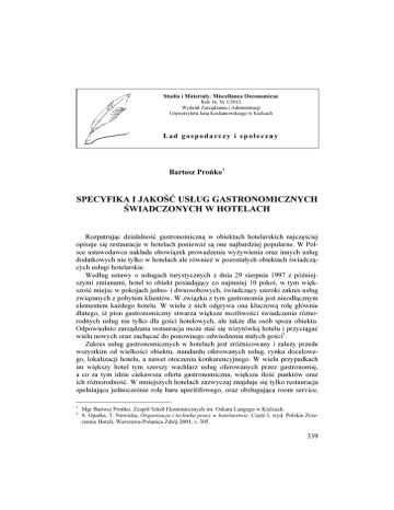 Studia i Materiały. Miscellanea Oeconomicae Rok 16, Nr 1/2012 Wydział Zarządzania i Administracji Uniwersytetu Jana Kochanowskiego w Kielcach Ład gospodarczy i społeczny Bartosz Prońko1 SPECYFIKA I JAKOŚĆ USŁUG GASTRONOMICZNYCH ŚWIADCZONYCH W HOTELACH Rozpatrując działalność gastronomiczną w obiektach hotelarskich najczęściej opisuje się restauracje w hotelach poniewaŜ są one najbardziej popularne. W Polsce ustawodawca nakłada obowiązek prowadzenia wyŜywienia oraz innych usług dodatkowych nie tylko w hotelach ale równieŜ w pozostałych obiektach świadczących usługi hotelarskie. Według ustawy o usługach turystycznych z dnia 29 sierpnia 1997 z późniejszymi zmianami, hotel to obiekt posiadający co najmniej 10 pokoi, w tym większość miejsc w pokojach jedno- i dwuosobowych, świadczący szeroki zakres usług związanych z pobytem klientów. W związku z tym gastronomia jest nieodłącznym elementem kaŜdego hotelu. W wielu z nich odgrywa ona kluczową rolę głównie dlatego, iŜ pion gastronomiczny stwarza większe moŜliwości świadczenia róŜnorodnych usług nie tylko dla gości hotelowych, ale takŜe dla osób spoza obiektu. Odpowiednio zarządzana restauracja moŜe stać się wizytówką hotelu i przyciągać wielu nowych oraz zachęcać do ponownego odwiedzenia stałych gości2. Zakres usług gastronomicznych w hotelach jest zróŜnicowany i zaleŜy przede wszystkim od wielkości obiektu, standardu oferowanych usług, rynku docelowego, lokalizacji hotelu, a nawet otoczenia konkurencyjnego. W wielu przypadkach im większy hotel tym szerszy wachlarz usług oferowanych przez gastronomię, a co za tym idzie ciekawsza oferta gastronomiczna, większa ilość punktów oraz ich róŜnorodność. W mniejszych hotelach zazwyczaj znajduje się tylko restauracja spełniająca jednocześnie rolę baru aperitifowego, oraz obsługująca room service, 1 2 Mgr Bartosz Prońko, Zespół Szkół Ekonomicznych im. Oskara Langego w Kielcach. S. Oparka, T. Nowicka, Organizacja i technika pracy w hotelarstwie, Część I, wyd. Polskie Zrzeszenie Hoteli, Warszawa-Polanica Zdrój 2001, s. 305. 339 sale bankietowe itp. W duŜych obiektach dział gastronomi jest zdecydowanie bardziej rozbudowany, często dzieli się na mniejsze jednostki organizacyjne obsługujące poszczególne punkty. W dzisiejszych czasach przed gastronomią hotelową stawia się coraz to nowe zadania. Podstawową działalnością jest zapewnienie gościom hotelowym wyŜywienia przez serwowanie nie tylko, zazwyczaj wliczonych w cenę noclegu, śniadań ale takŜe obiadów czy kolacji. Podawanie śniadań w hotelu jest w zasadzie podstawową usługą gastronomiczną poniewaŜ większość osób korzysta z tego posiłku. Bardzo często jest to teŜ jedyny moment kiedy gość styka się z ofertą Ŝywieniową w danym hotelu. Dlatego zwłaszcza w Polsce hotele starają się aby ich oferta śniadaniowa była bogata oraz atrakcyjna. W krajach zachodnich często śniadanie jest bardzo ograniczone dlatego goście nie przywiązują do niego aŜ tak duŜej wagi jak w Polsce. Ponadto w naszej kulturze przyjęło się, Ŝe śniadanie to podstawa całego dnia dlatego przed polskimi hotelarzami goście stawiają wysokie wymagania śniadaniowe. Zakres usług hotelarskich oznacza się w nomenklaturze międzynarodowej skrótami literowymi, pochodzącymi od określeń opisujących stopień rozbudowania usług gastronomicznych świadczonych w obiekcie: − AB – American Breakfast – cena za pokój z wkalkulowanym śniadaniem obejmującym sok, kawę lub herbatę, wędliny, jaja, sery, − CB – Continental Breakfast – wkalkulowane śniadanie kontynentalne (śniadanie AB bez soków i owoców) − BB – Bed and Breakfast – cena z wkalkulowanym śniadaniem, − AP – American Plan lub FAP (Full American Plan), FP (Full Pension), FB (Full Board) – cena za pokój z wkalkulowanymi trzema posiłkami − MAP – Modified American Plan lub HP (Half Pension), HB (Half Board) – cena za pokój ze śniadaniem i obiadokolacją3. Biorąc pod uwagę powyŜsze rodzaje wynikające z zakresu świadczonych usług gastronomicznych, moŜna wyróŜnić trzy podstawowe rodzaje bazy noclegowej: − Hotel pełny – hotele świadczące bardzo szeroki zakres usług gastronomicznych. W hotelach tych bardzo często występuje kilka punktów gastronomicznych. − Hotel pension – jest to obiekt występujący głównie w miejscach uzdrowiskowych. W hotel pension usługi Ŝywieniowe są wkalkulowane w cenę pobytu i zazwyczaj ich godziny są z góry ustalone. − Hotel garni – obiekt świadczący najwęŜszy zakres usług gastronomicznych zazwyczaj ograniczający się jedynie do podania śniadania dla gości hotelowych4. Często restauracje hotelowe w swojej ofercie posiadają organizację przyjęć takich jak komunie, wesela czy spotkania biznesowe. Coraz częściej pojawia się 3 4 E. Mitura, E. Koniuszewska, Ekonomika i organizacja pracy w hotelarstwie, wyd. Difin, Warszawa 2006, s. 126. P. Dominik, Gastronomia we współczesnym hotelu, wyd. Almamer, Warszawa 2008, s. 93. 340 takŜe moŜliwość organizacji przez gastronomię hotelową imprez na świeŜym powietrzu poprzez dostarczanie lub przygotowanie posiłków w miejscu spotkania. Z uwagi na rosnące wymagania gości hotelowych dział gastronomii powinien być niezwykle elastyczny aby spełnić ich wszelkie oczekiwania. Do częstych praktyk w hotelach naleŜy równieŜ organizacja bali związanych z róŜnymi okazjami jak na przykład Andrzejki czy Sylwester. Ponadto w miejscowościach turystycznych gdzie oprócz noclegu goście oczekują rozrywki, restauracje lub znajdujące się w hotelach kluby organizują dyskoteki czy teŜ wieczorki taneczne. Gastronomia obok recepcji jest jednym z dwóch podstawowych pionów działalności hotelu5. Te dwa miejsca to pierwszy kontakt gościa z hotelem. Na podstawie oceny recepcji i restauracji gość wyrabia sobie wstępną opinię na temat fun