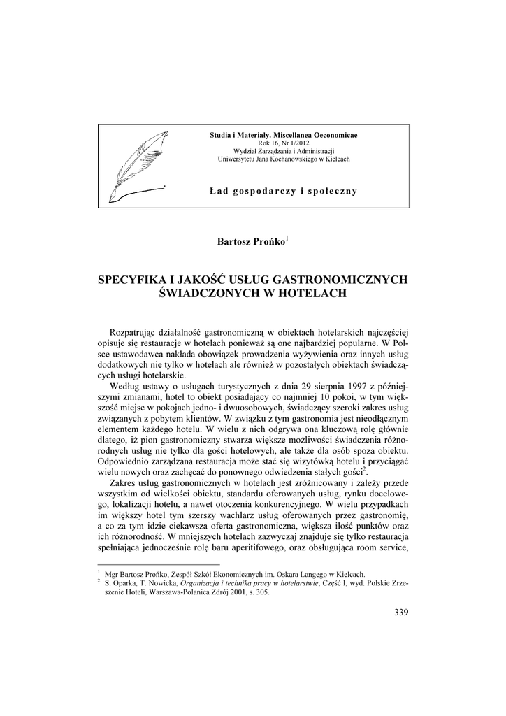 Bartosz Prońko, Specyfika i jakość usług gastronomicznych