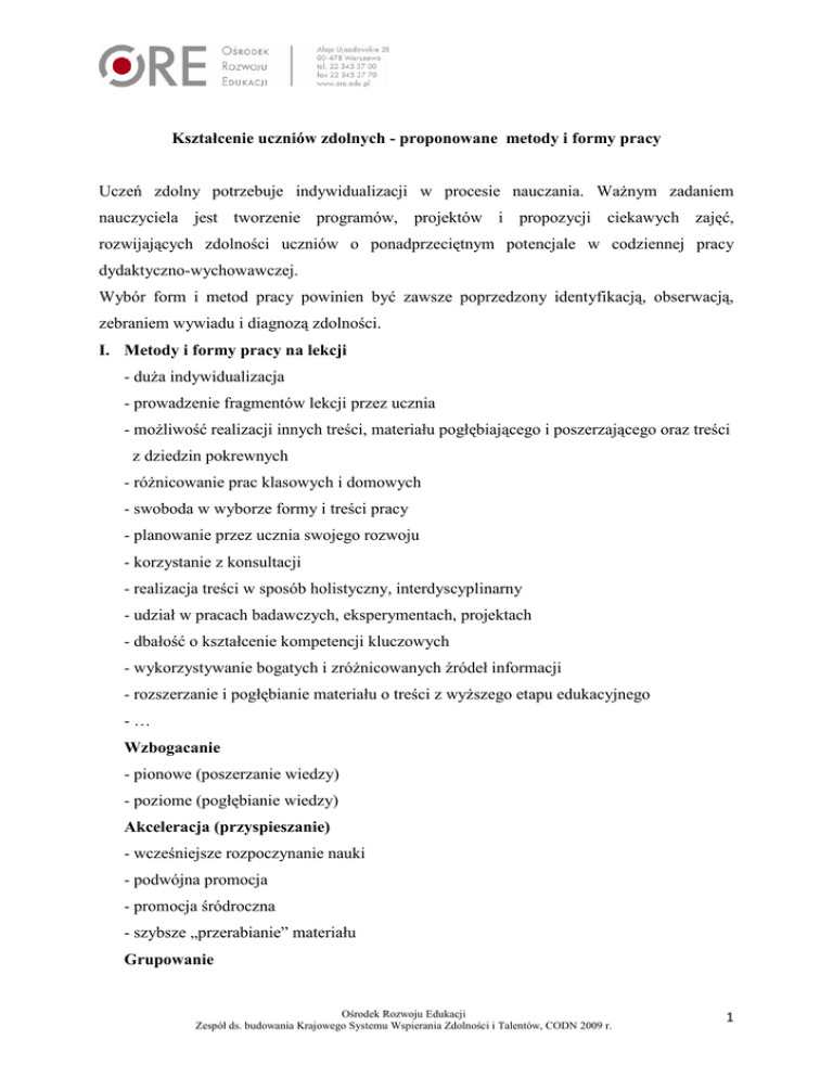Kształcenie uczniów zdolnych - proponowane metody i formy pracy Uczeń zdolny potrzebuje indywidualizacji w procesie nauczania. WaŜnym zadaniem nauczyciela jest tworzenie programów, projektów i propozycji ciekawych zajęć, rozwijających zdolności uczniów o ponadprzeciętnym potencjale w codziennej pracy dydaktyczno-wychowawczej. Wybór form i metod pracy powinien być zawsze poprzedzony identyfikacją, obserwacją, zebraniem wywiadu i diagnozą zdolności. I. Metody i formy pracy na lekcji - duŜa indywidualizacja - prowadzenie fragmentów lekcji przez ucznia - moŜliwość realizacji innych treści, materiału pogłębiającego i poszerzającego oraz treści z dziedzin pokrewnych - róŜnicowanie prac klasowych i domowych - swoboda w wyborze formy i treści pracy - planowanie przez ucznia swojego rozwoju - korzystanie z konsultacji - realizacja treści w sposób holistyczny, interdyscyplinarny - udział w pracach badawczych, eksperymentach, projektach - dbałość o kształcenie kompetencji kluczowych - wykorzystywanie bogatych i zróŜnicowanych źródeł informacji - rozszerzanie i pogłębianie materiału o treści z wyŜszego etapu edukacyjnego -… Wzbogacanie - pionowe (poszerzanie wiedzy) - poziome (pogłębianie wiedzy) Akceleracja (przyspieszanie) - wcześniejsze rozpoczynanie nauki - podwójna promocja - promocja śródroczna - szybsze „przerabianie” materiału Grupowanie Ośrodek Rozwoju Edukacji Zespół ds. budowania Krajowego Systemu Wspierania Zdolności i Talentów, CODN 2009 r. 1 - tworzenie specjalnych ciągów klas wg poziomów zdolności Indywidualizowanie pracy z uczniem zdolnym - indywidualny tok nauki - indywidualne programy nauczania - indywidualny Plan Działań Wspierających - konsultacje, doradztwo, tutoring, mentoring - współpraca z mentorami, ekspertami (np. współpraca z uczelniami), instytucjami (np. MłodzieŜowe Domy Kultury), programami (np. programy i projekty organizacji pozarządowych) Poszerzanie treści - prowadzenie nauczania na wyŜszym poziomie - poszerzanie zakresu lektur, - prowadzenie dyskusji - przygotowywanie przez ucznia opracowań problemów otwartych o znaczeniu krajowym lub międzynarodowym (np. Przypuszczalne źródła energii w przyszłości, Wzrost populacji ludzkiej, Zanieczyszczenie środowiska itp.) Rozwijanie zdolności poprzez: - konkursy, olimpiady, turnieje, kluby dyskusyjne, fora internetowe, projekty…, - przyspieszenie w nauczaniu nauki jednego lub więcej przedmiotów szkolnych i uczęszczanie przez ucznia na tego typu zajęcia ze starszą klasą lub w grupie róŜnowiekowej, - nauczanie specjalne: zindywidualizowany plan lekcji i zajęć pozalekcyjnych, nauczanie poza systemem klasowo-lekcyjnym, - korzystanie z rozszerzonego programu nauczania, klasy specjalne, szkoły np. GiLA w Toruniu, - dodatkowe zajęcia specjalistyczne. II. Indywidualny tok nauczania 1. Działania diagnostyczne (mnogość narzędzi diagnozy) 2. Wybór opiekuna (występującego w roli tutora, mentora i sojusznika) 3. Tworzenie indywidualnych programów nauczania 4. Współudział ucznia w planowaniu ścieŜki rozwoju – dąŜenie do coraz większej autonomii młodego człowieka Ośrodek Rozwoju Edukacji Zespół ds. budowania Krajowego Systemu Wspierania Zdolności i Talentów, CODN 2009 r. 2 5. Wykorzystywanie „szybkich ścieŜek” – akceleracja 6. Wykorzystywanie potencjału osób spoza szkoły (np. trener, instruktor, nauczyciel ze szkoły wyŜszego etapu edukacyjnego, nauczyciel akademicki, …) 7. Pomoc w nawiązywaniu przez ucznia współpracy z placówkami, które mogą wspierać jego rozwój w ramach indywidualnego toku nauczania (np. wyŜsze uczelnie, domy kultury, szkoły artystyczne, instytucje pozarządowe …) 8. Organizowanie psychologicznego wsparcia dla ucznia i jego rodziców/opiekunów prawnych 9. Dbałość o rozwijanie kompetencji psycho-społecznych ucznia. 10. Wsparcie finansowe (stypendium, środki na prowadzenie prac badawczych, itp.) 11. Konsultacje 12. Zapewnienie udziału w projekcie, eksperymencie, badaniach naukowych (zgodnie z profilem uzdolnień, włączanie w pracę zespołową) 13. Prezentacja osiągnięć ucznia (publikacje np. prac badawczych, wernisaŜe, koncerty, prezentacje medialne…) III. Indywidualny program nauczania 1. Podstawa programowa z przedmiotu/przedmiotów punktem wyjścia do stworzenia programu 2. Diagnoza 3. Praca zespołu nad skonstruowaniem programu (przy współudziale ucznia, jego prawnych rodziców/opiekunów, innych nauczycieli, …) • ustalenie zasad realizacji programu indywidualnego – zgoda na realizację na piśmie: ucznia, rodziców, nauczyciela opiekuna, do zatwierdzenia przez dyrektora szkoły • uwzględnienie elastyczności i wariantowości w realizacji • dbałość o holistyczny wymiar edukacji ucznia • dobór najefektywniejszych form i metod pracy (zgodnie z diagnozą typu inteligencji/kanałów sensorycznych, itp.) • atrakcyjny i realny harmonogram zajęć, uwzględniający zajęcia poza klasą i poza szkołą (współpraca z instytucjami oświatowo-kulturalnymi, uczelniami, ciekawymi ludźmi, mentorami, ekspertami, wymiany międzynarodowe, obozy…) • stosowanie motywującego systemu oceniania, w tym ocenianie kształtujące 4. Prezentowanie osiągnięć ucznia Ośrodek Rozwoju Edukacji Zespół ds. budowania Krajowego Systemu Wspierania Zdolności i Talentów, CODN 2009 r. 3 5. Monitoring i ewaluacja (w celu doskonalenia realizacji) 6. Współpraca z rodzicami, nauczycielami i innymi osobami pracującymi z uczniem 7. Dbałość o harmonijny rozwój ucznia, dobre relacje z rówieśnikami A. Zajęcia pozalekcyjne - klasy autorskie - koła zainteresowań - zajęcia z twórczości, kreatywnego myślenia, własnego rozwoju np. autoprezentacji, coachingu, zarządzania własnym potencjałem - realizacja projektów (w tym: badawczych, interdyscyplinarnych) - koła naukowe - obozy naukowe - seminaria, konferencje prowadzone dla zdolnych we współpra